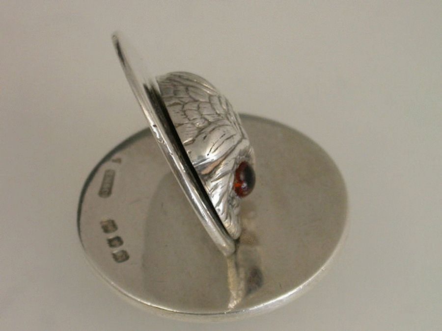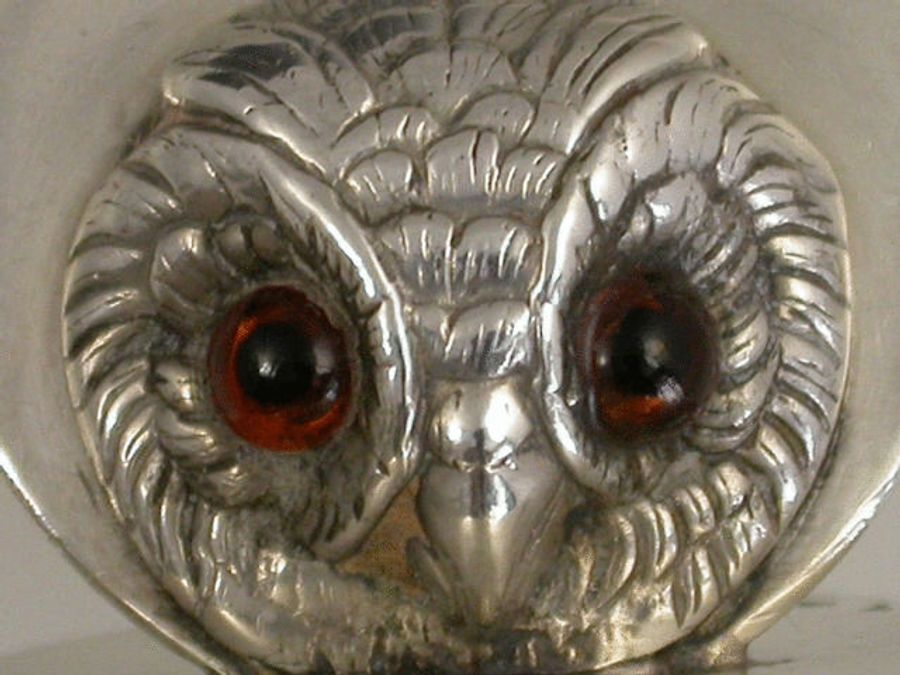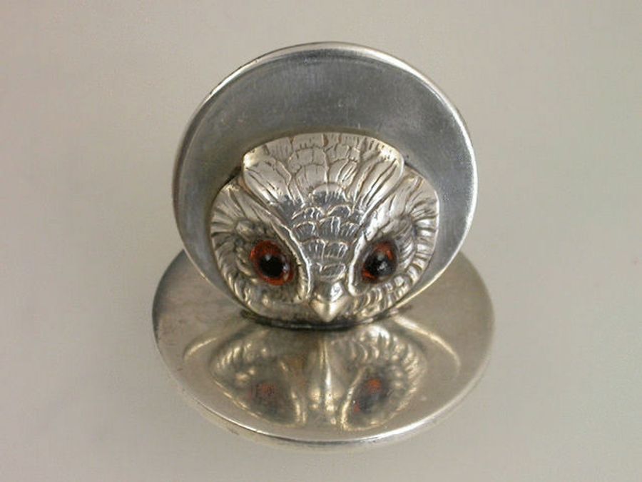 A good early 20th century silver Menu Holder of upright disc shape, the holder formed as the head of an owl with amber glass eyes, on plain circular base.
