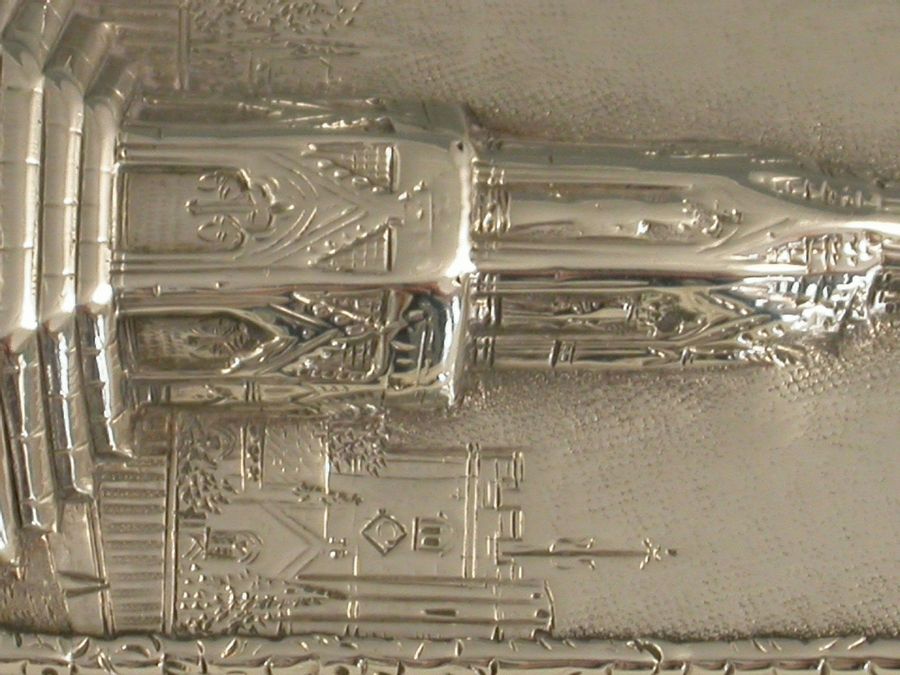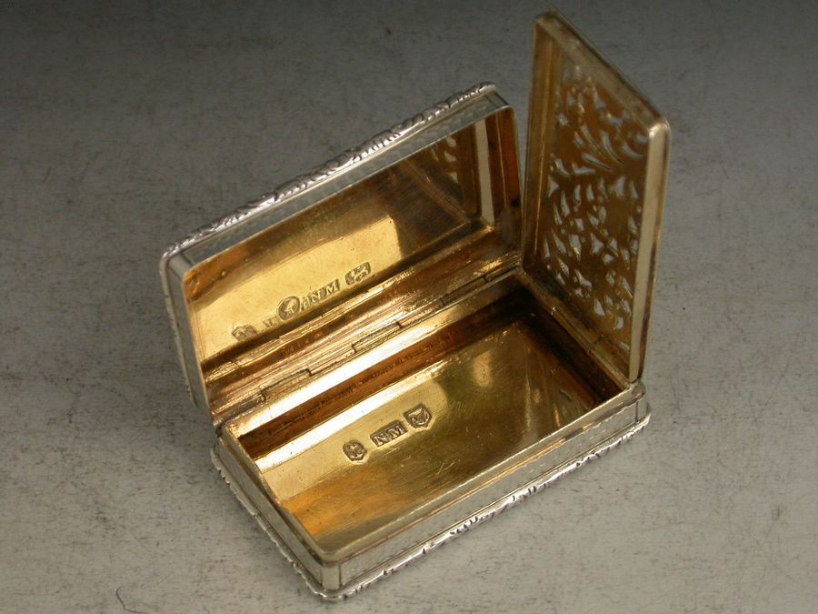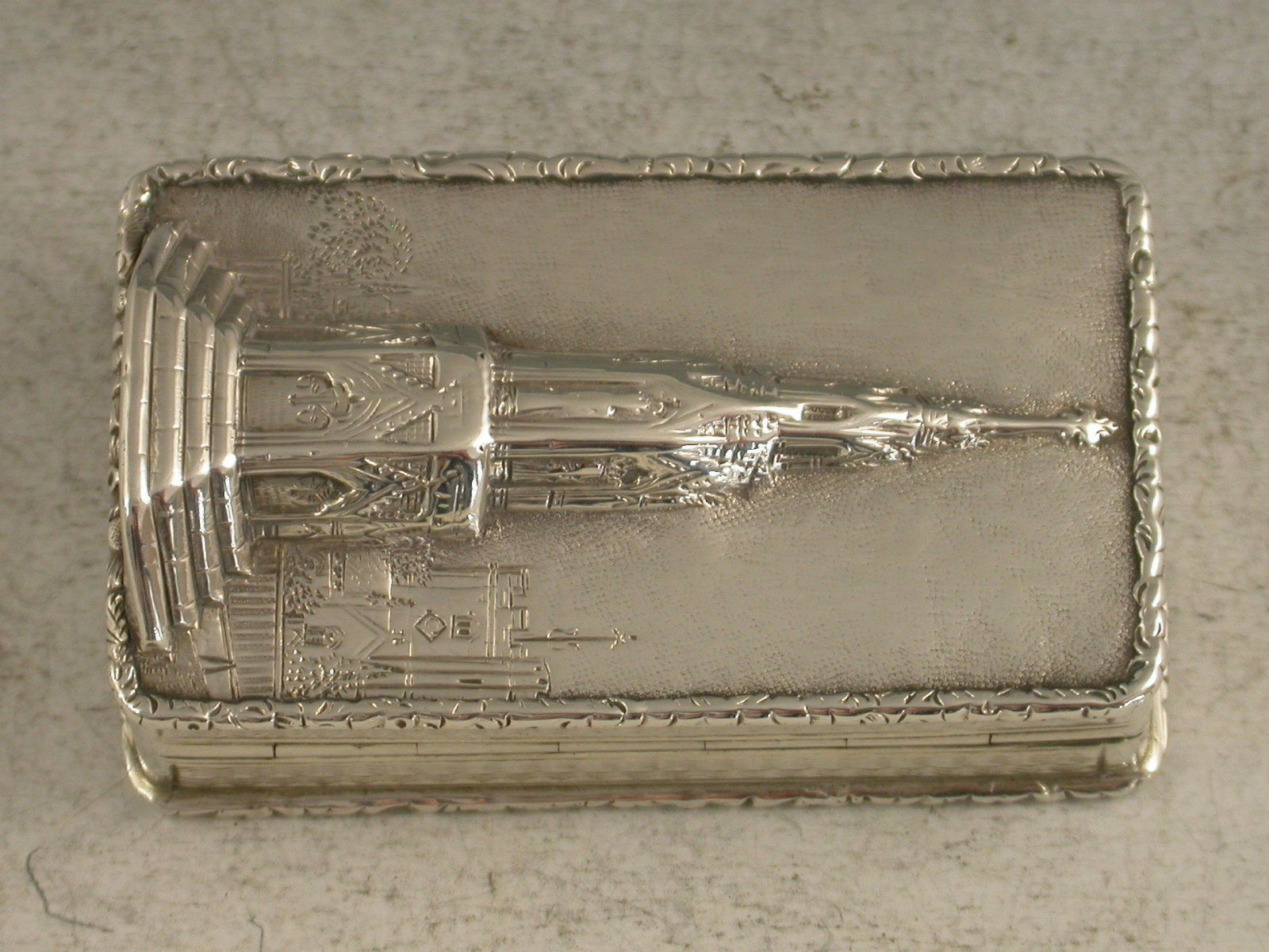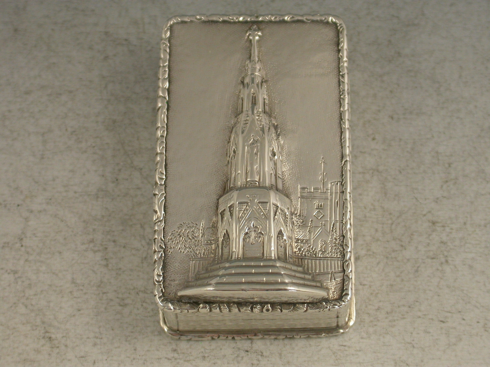 An extremely rare Victorian silver “Castle-top” Vinaigrette of rectangular form with engine turned decoration to the base and sides, the lid with raised scene depicting The Martyrs' Memorial, Oxford, in high relief, with the Church of St.Mary Magdalene in the background.