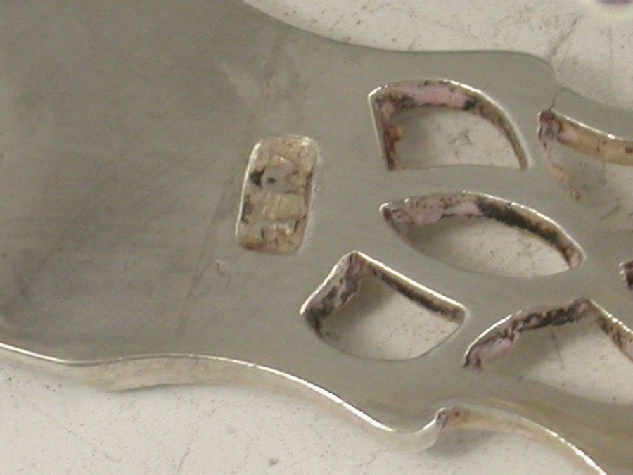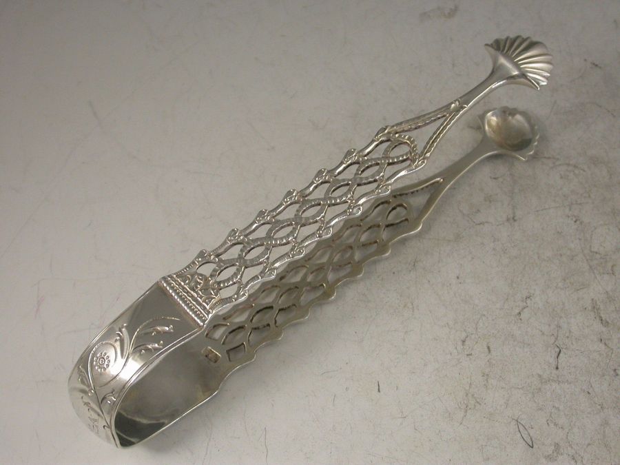 A good pair of George III 18th century cast silver Sugar Tongs with ornately pierced and chased arms, shell bowls, foliate scroll engraving and contemporary initials to the bowl.