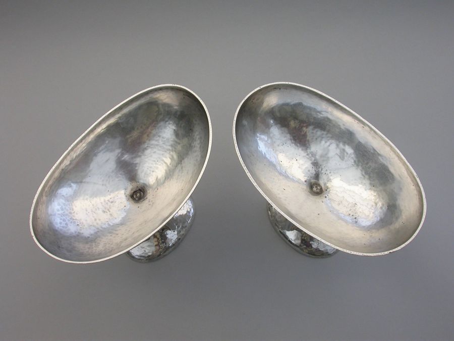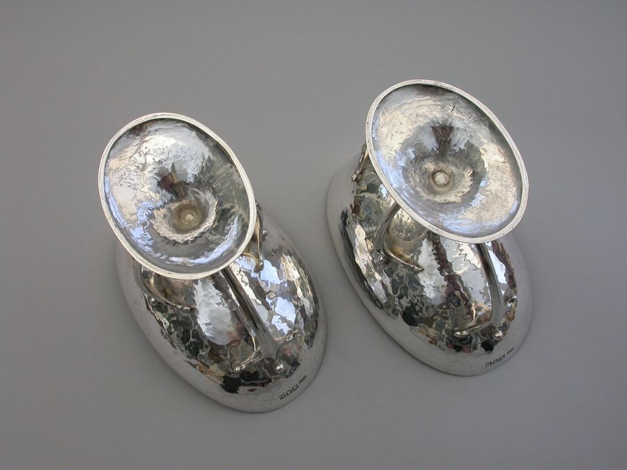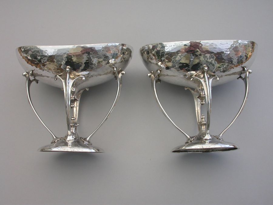 A good quality pair of Edwardian silver Bowls made in the Arts and Crafts style with a hammered finish, the oval bowls supported by four scrolled legs.