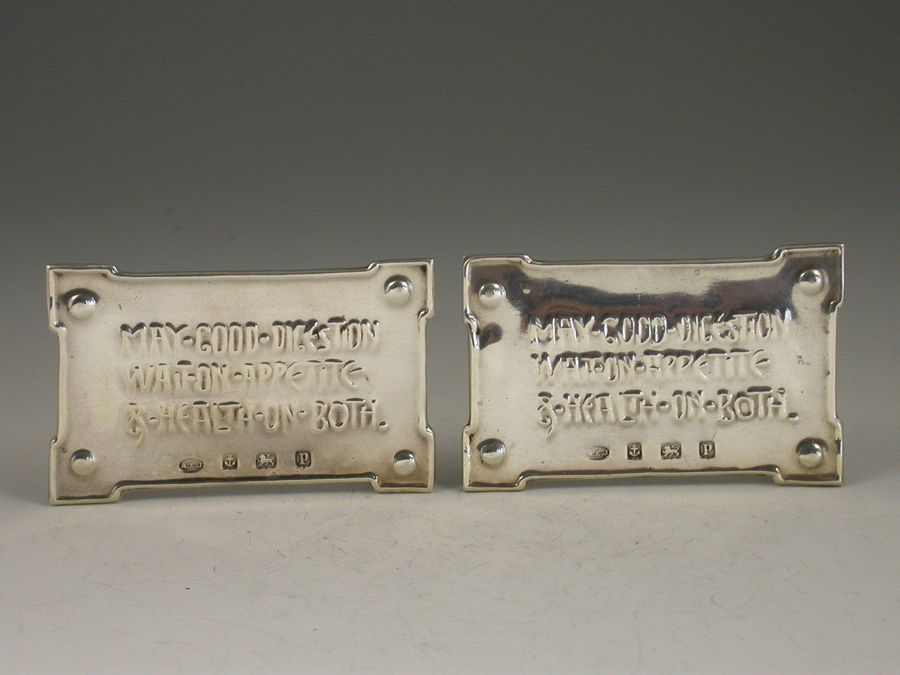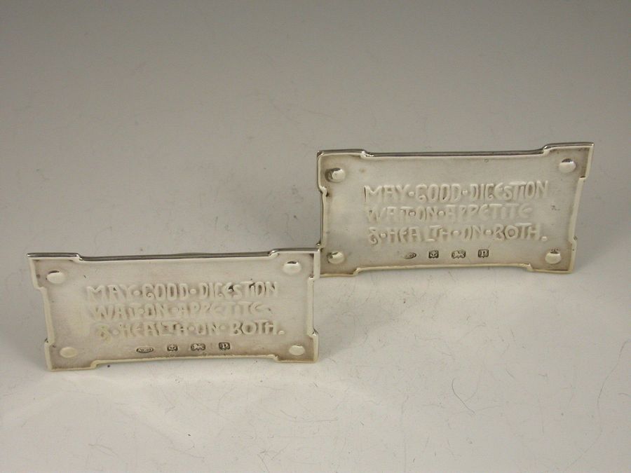 A rare pair of early 20th century silver Menu Holders made in the Arts & Crafts style, of shaped rectangular form chased with the proverb; ""MAY GOOD DIGESTION WAIT ON APPETITE AND HEALTH ON BOTH"".