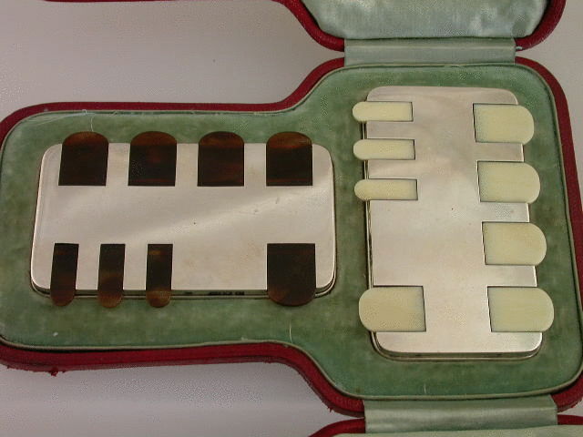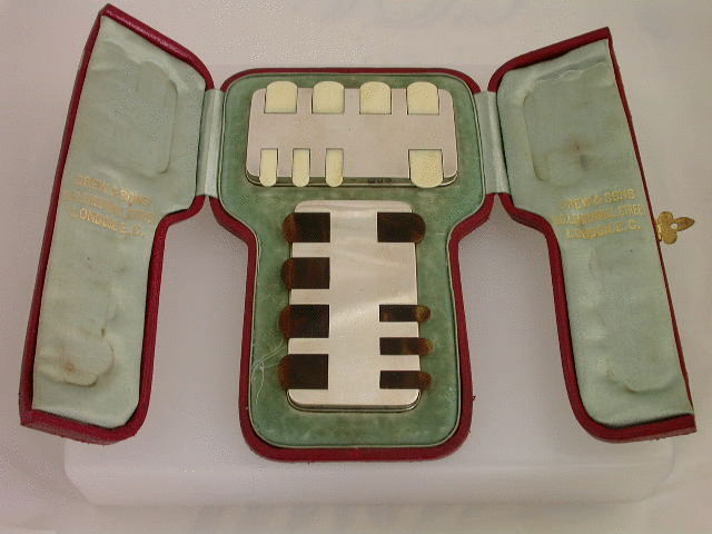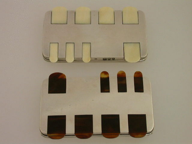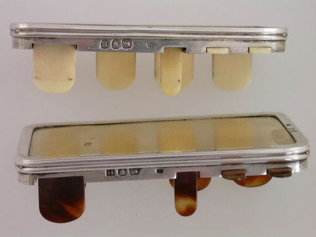 A very fine quality pair of Victorian silver, silver gilt, ivory and tortoiseshell Whist Markers, the heavy rectangular cases with reeded rims and gilded bases. One with hinged tortoiseshell marker pegs and the other with ivory. Complete with original silk and velvet lined morocco red leather case with gilt metal mounts and script initials “W.A.”.