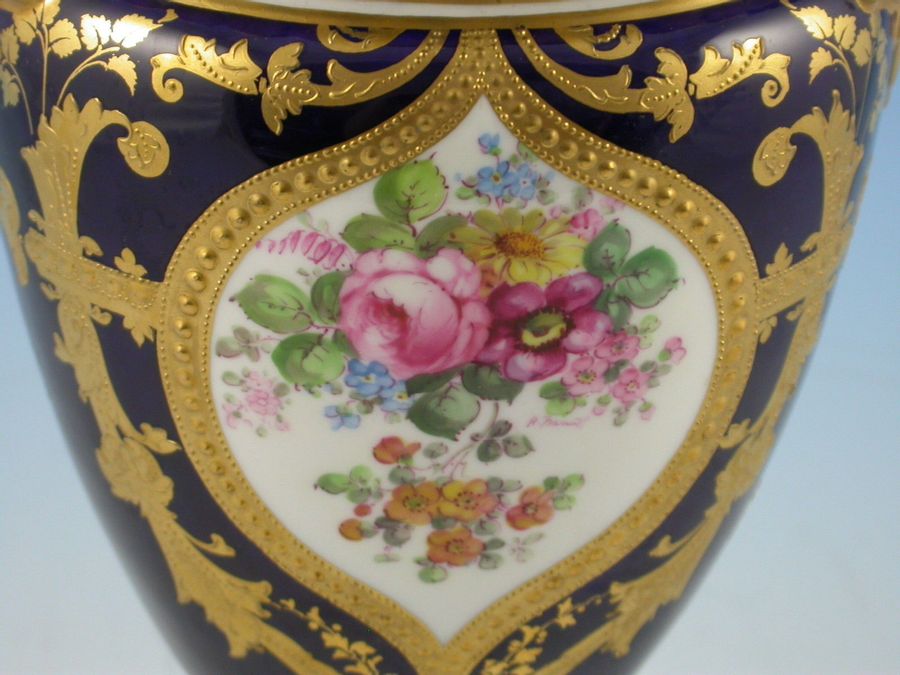 A pair of Royal Crown Derby Vases of ovoid shape with gilded handles on a blue ground body, gilt enriched central shield shape reserves painted with bouquets of English flowers.