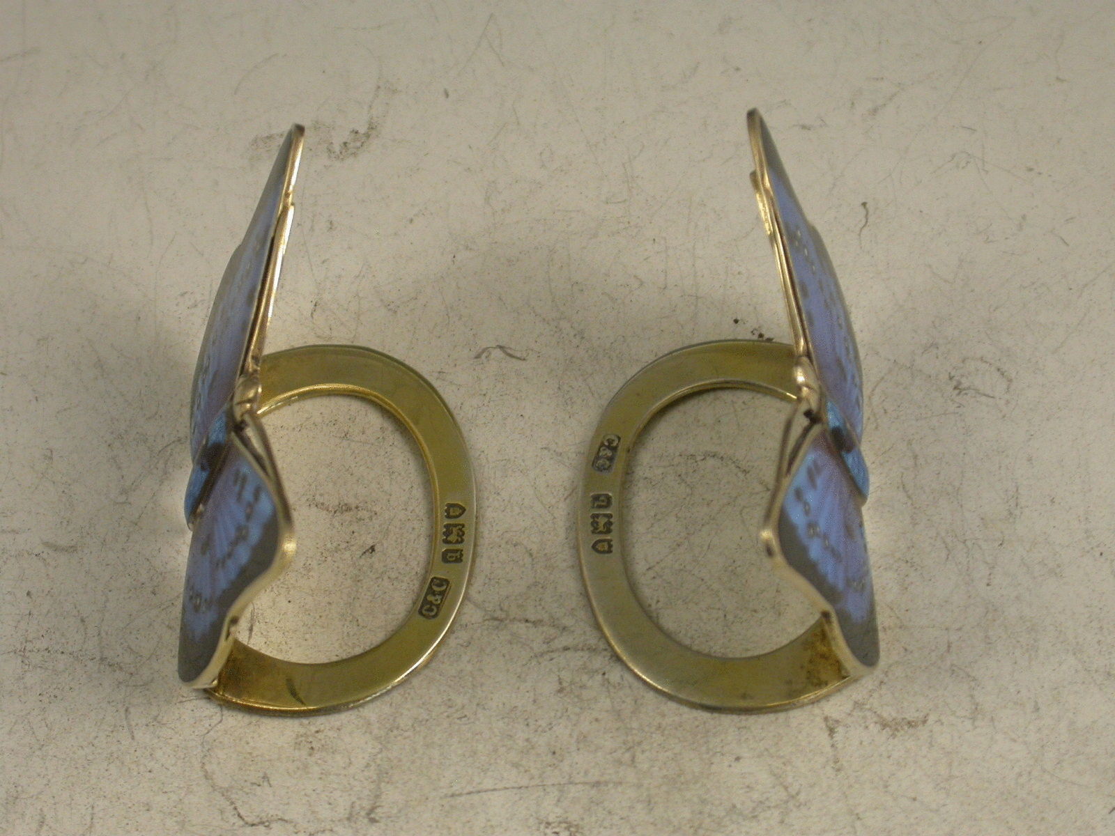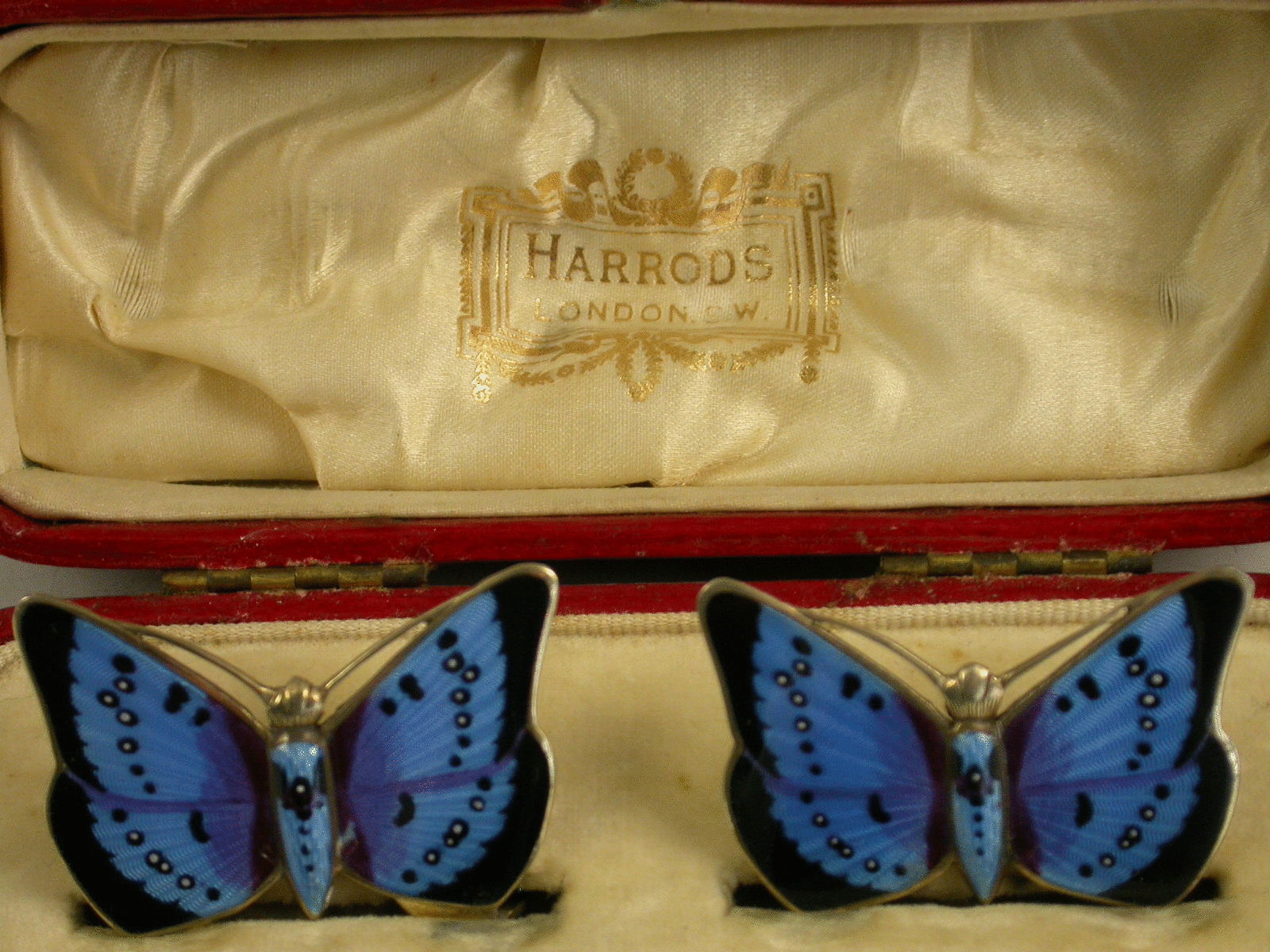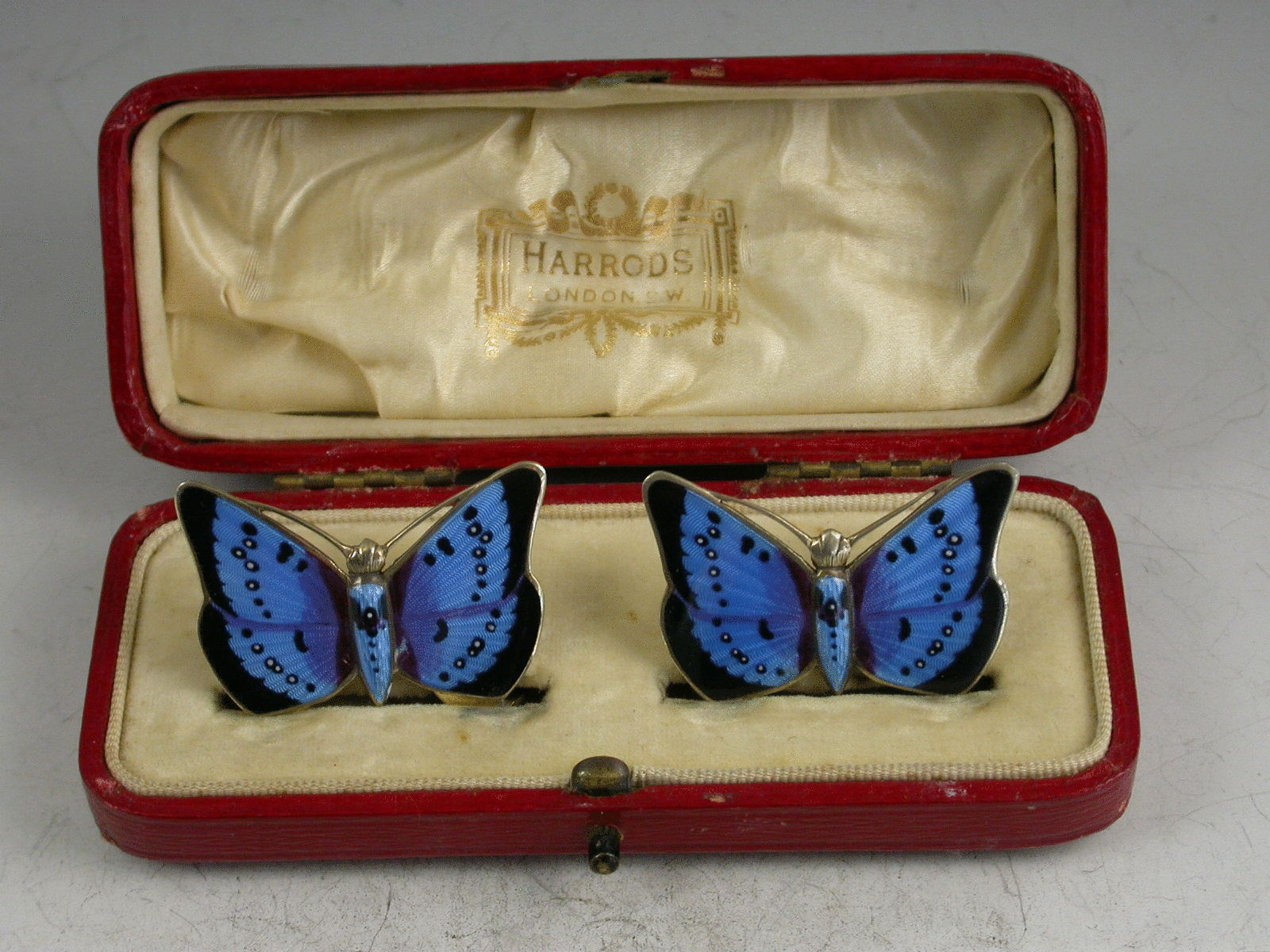 A pair of early 20th century cased silver gilt and enamel Menu Holders made in the form of butterflies, with finely detailed blue, purple and black guilloche enamel decoration. Complete with original Harrods silk and velvet lined red leather case.