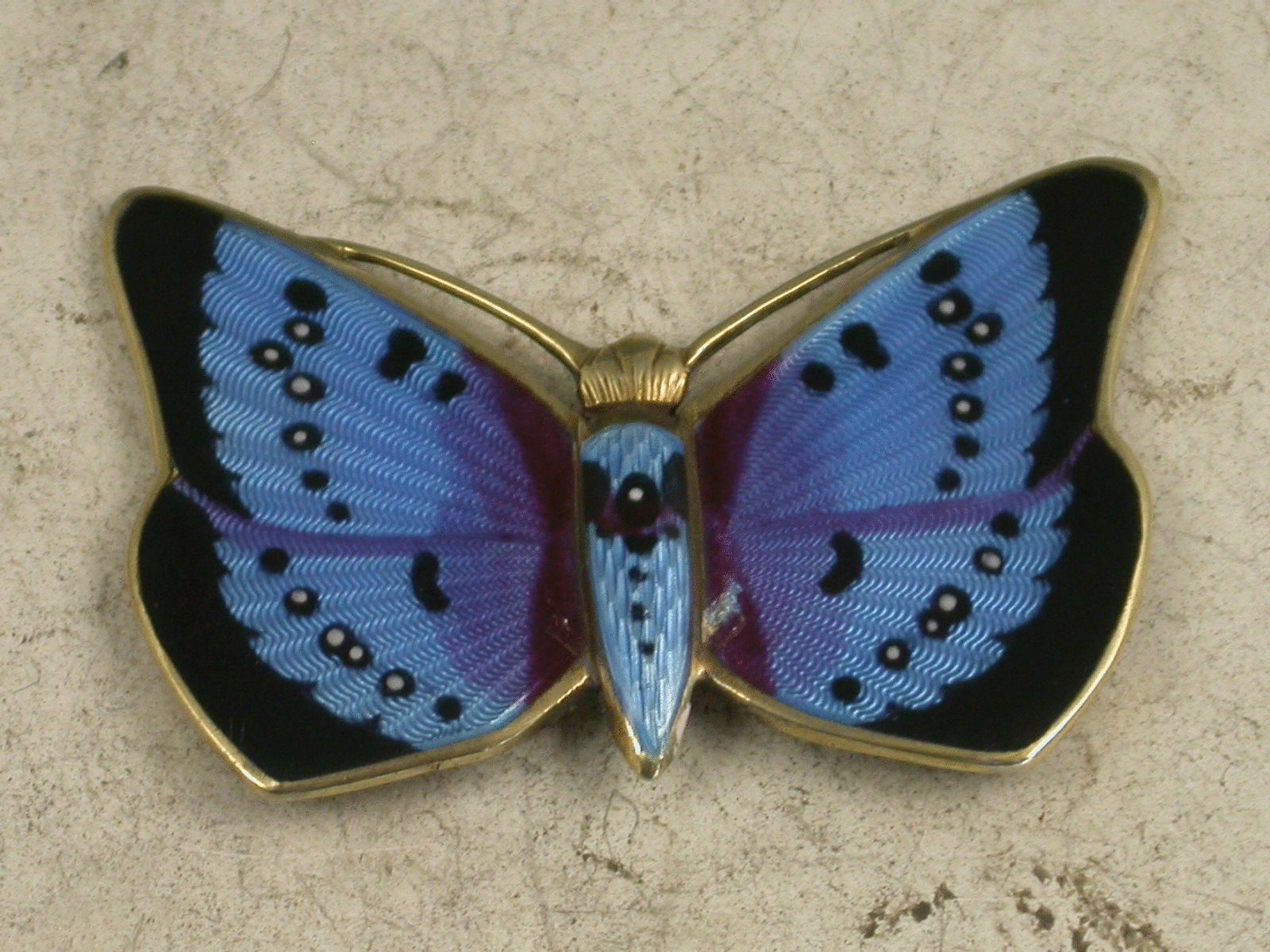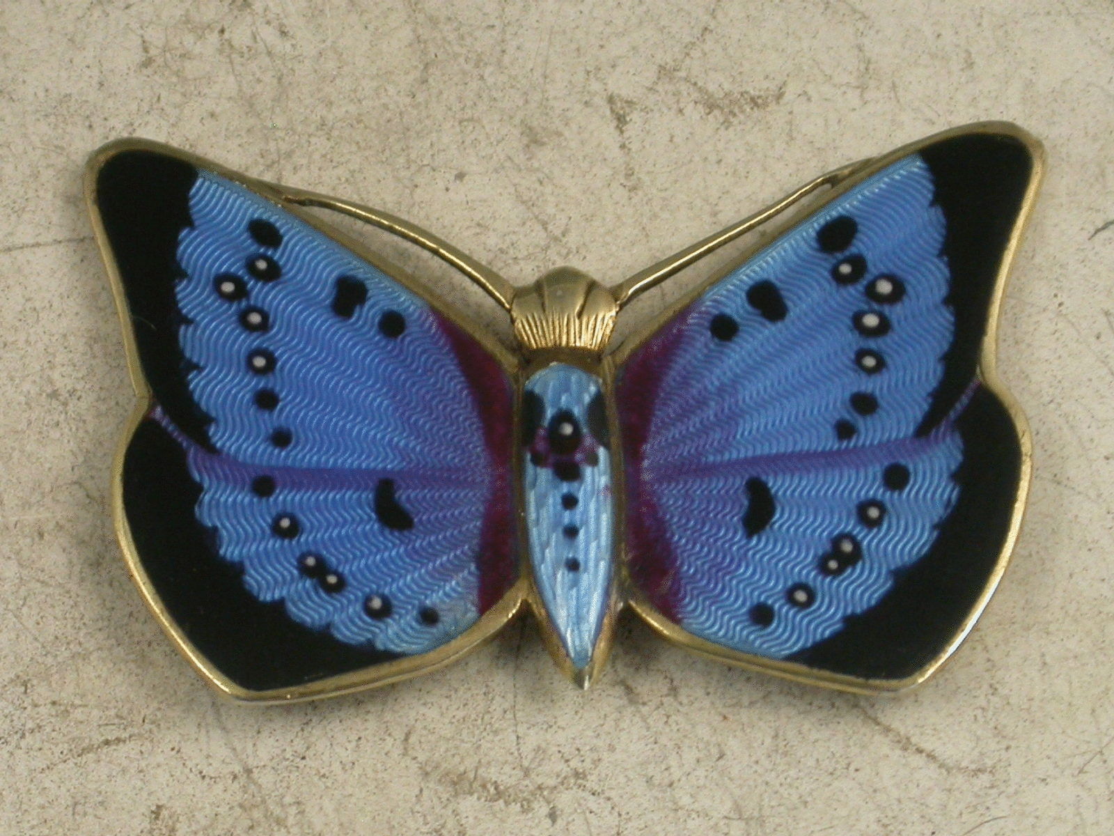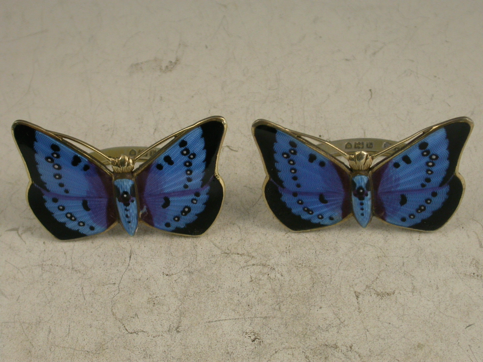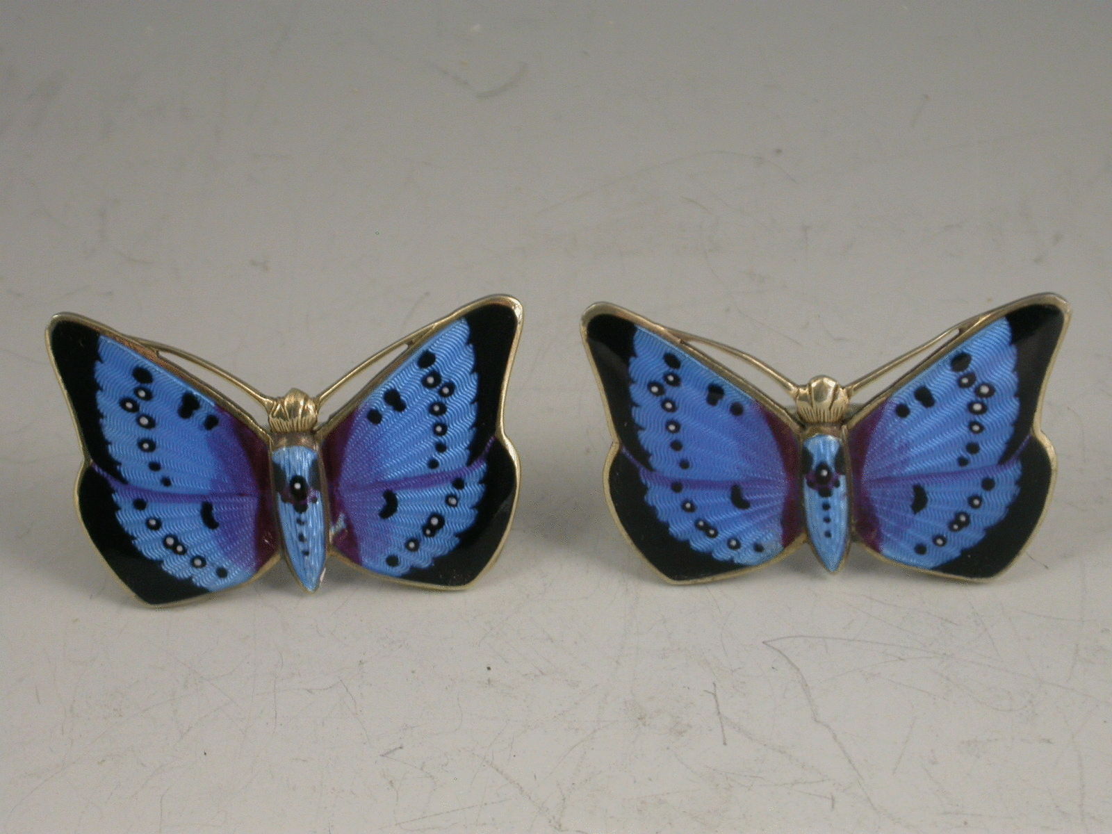 A pair of early 20th century cased silver gilt and enamel Menu Holders made in the form of butterflies, with finely detailed blue, purple and black guilloche enamel decoration. Complete with original Harrods silk and velvet lined red leather case.