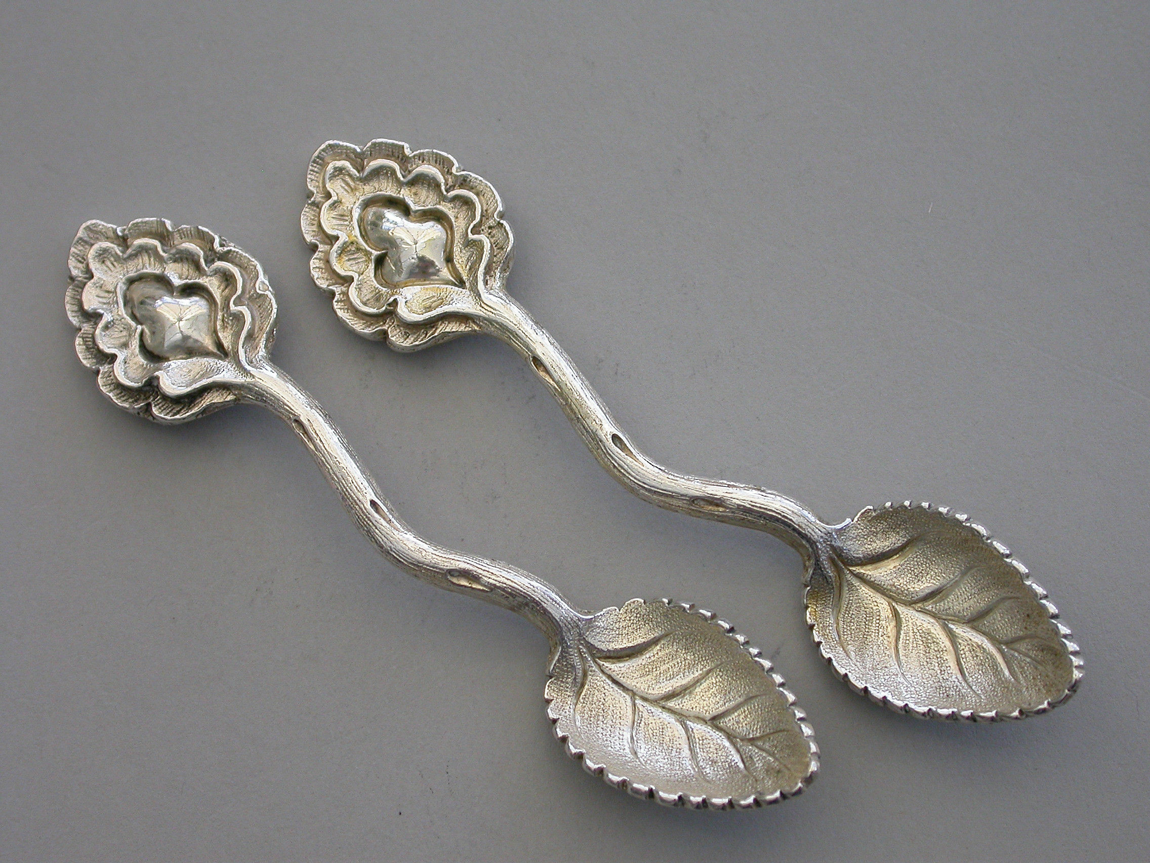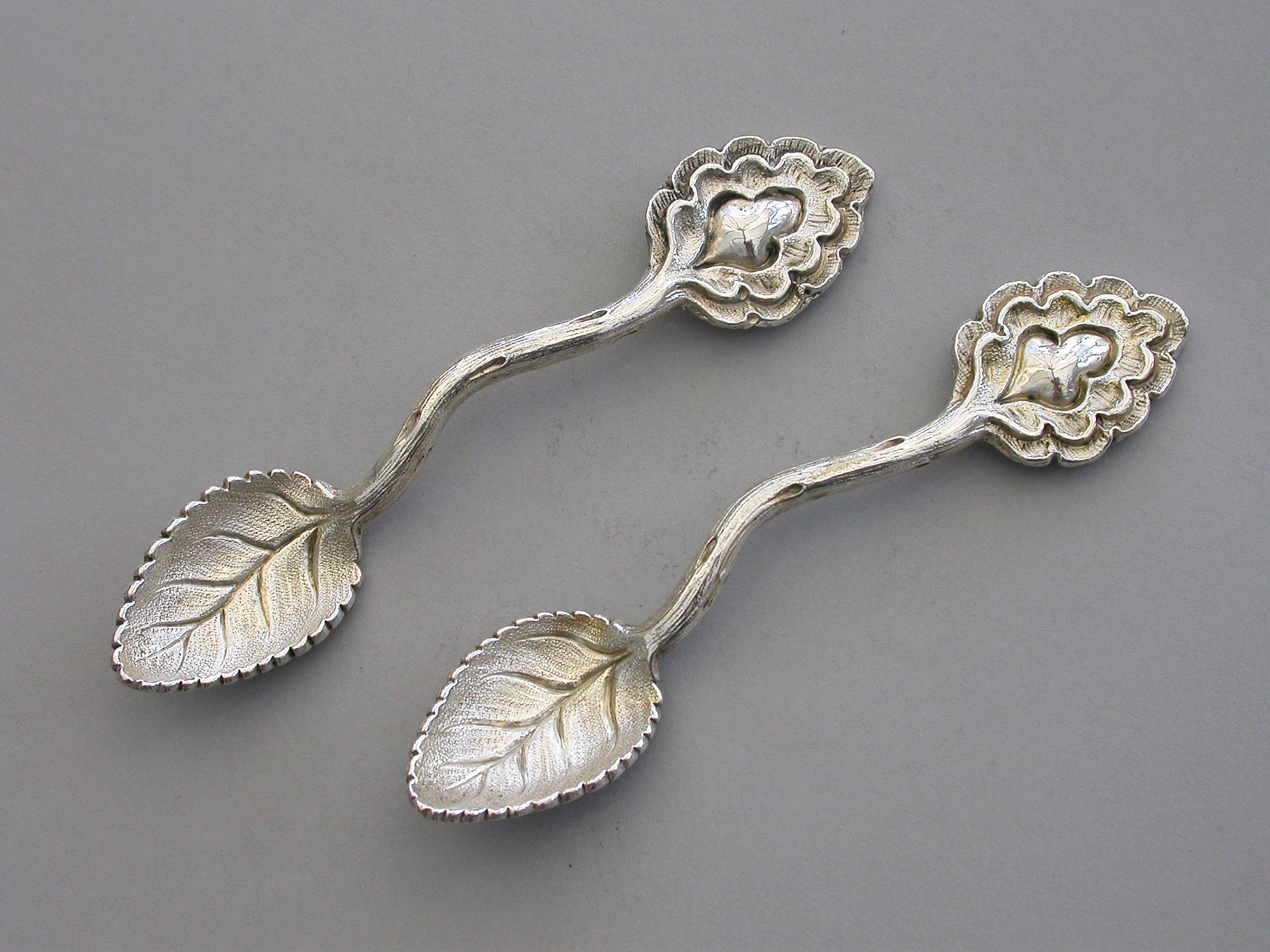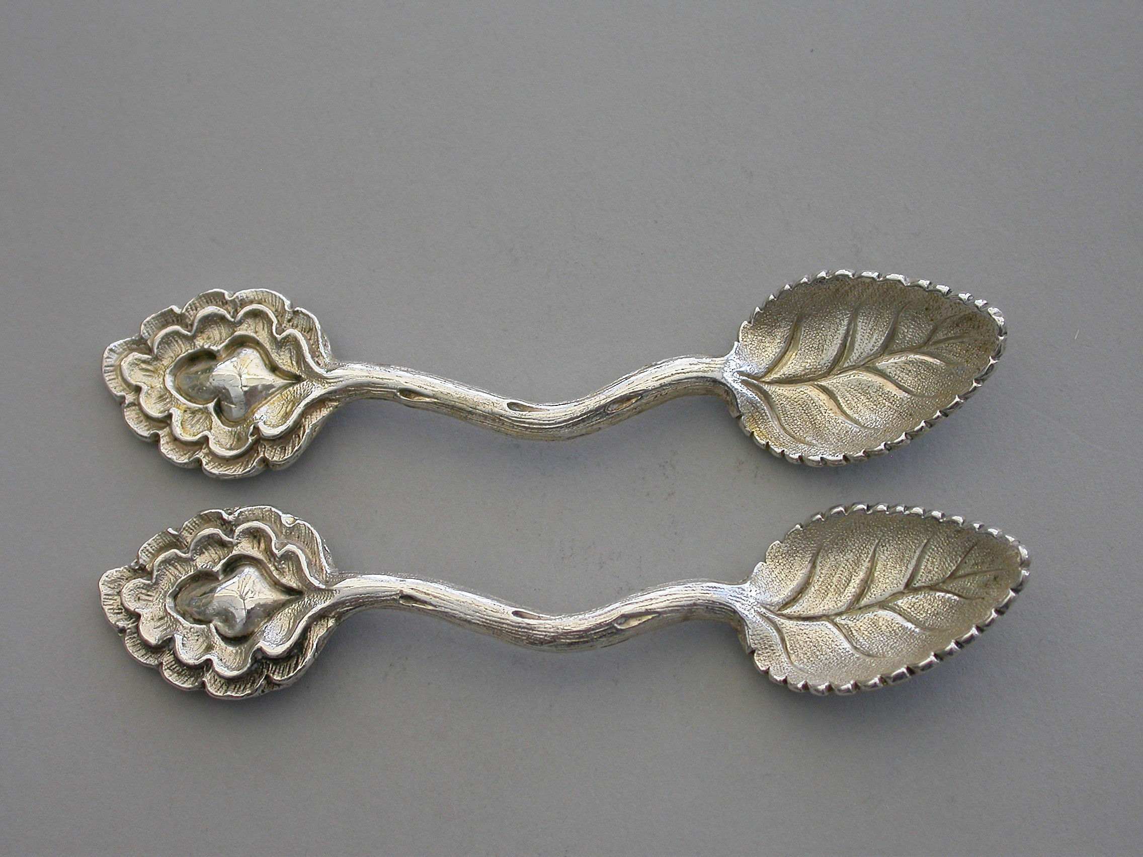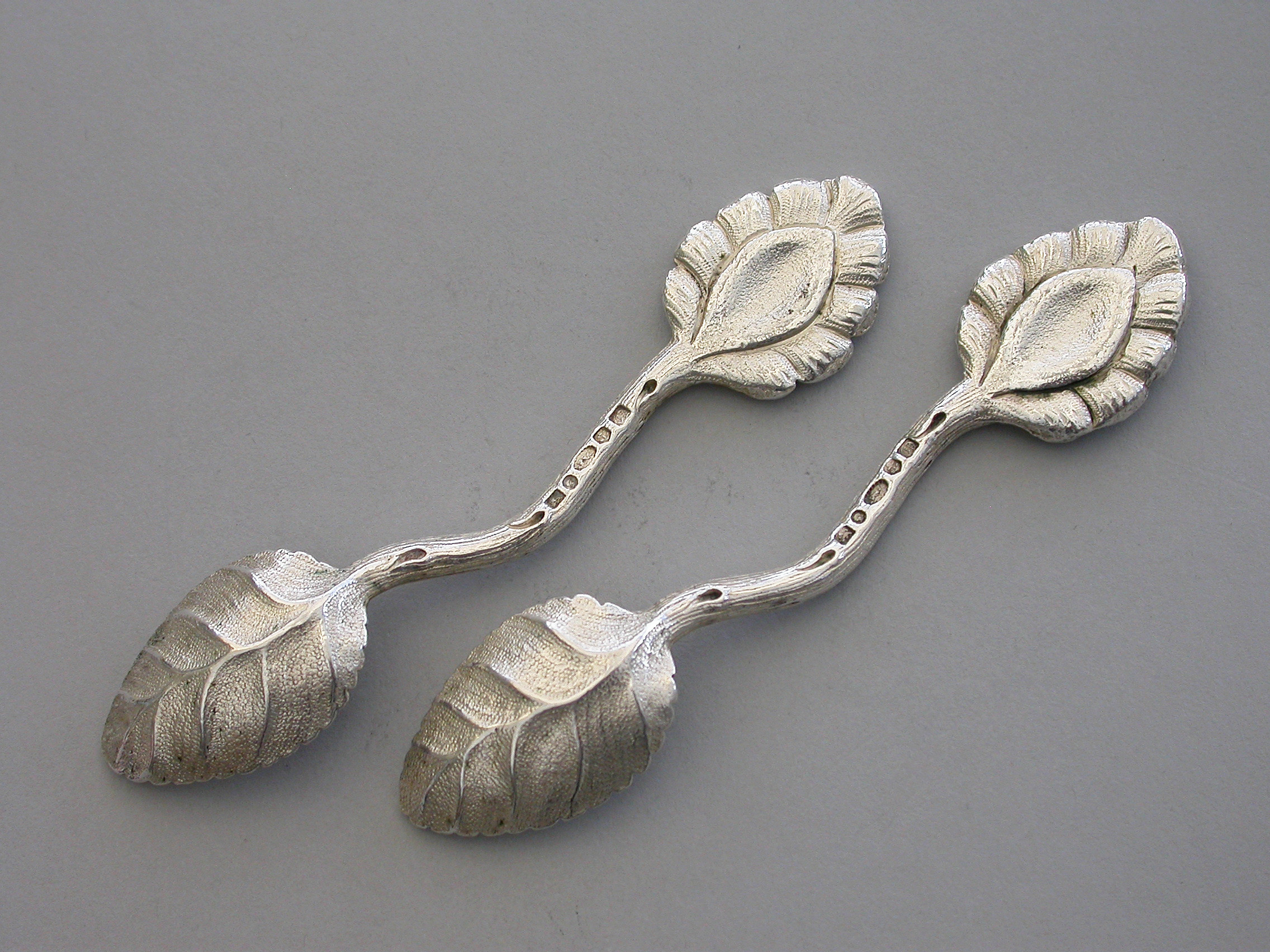 Pair Early Victorian Naturalistic Flower Head & Leaf Salt Spoons