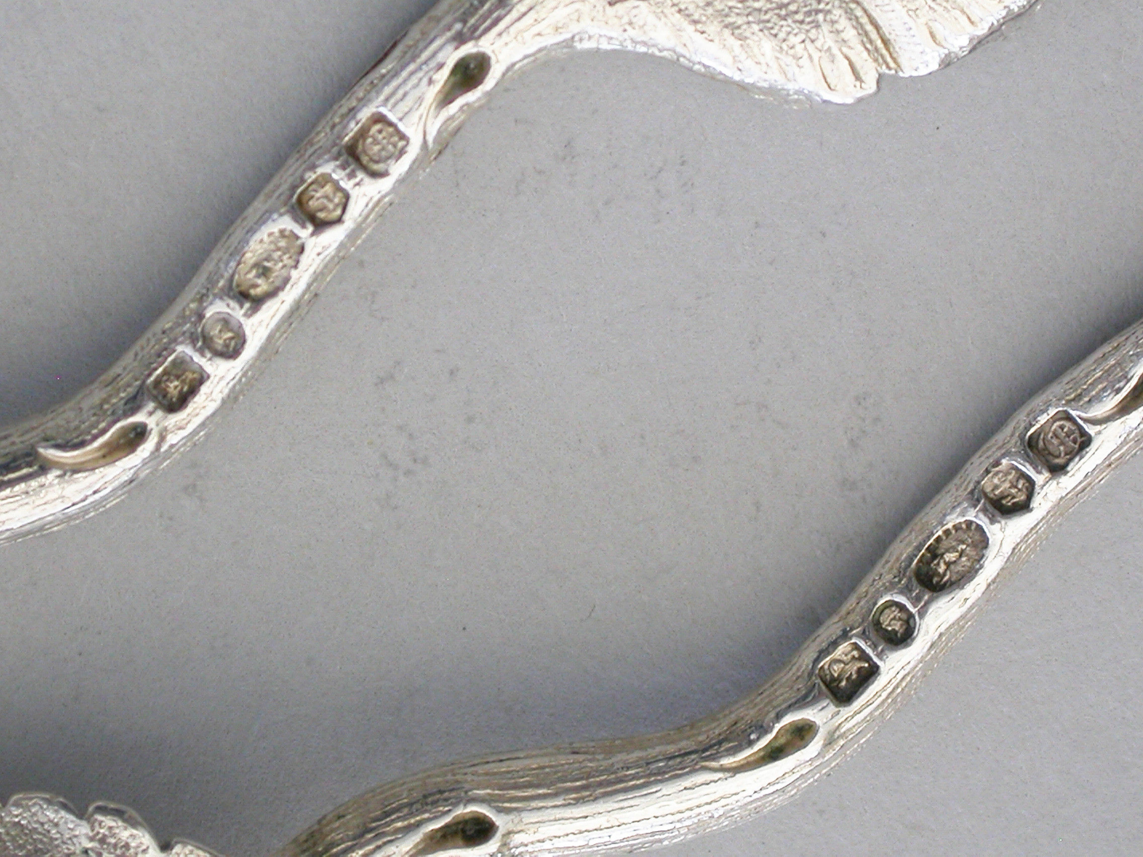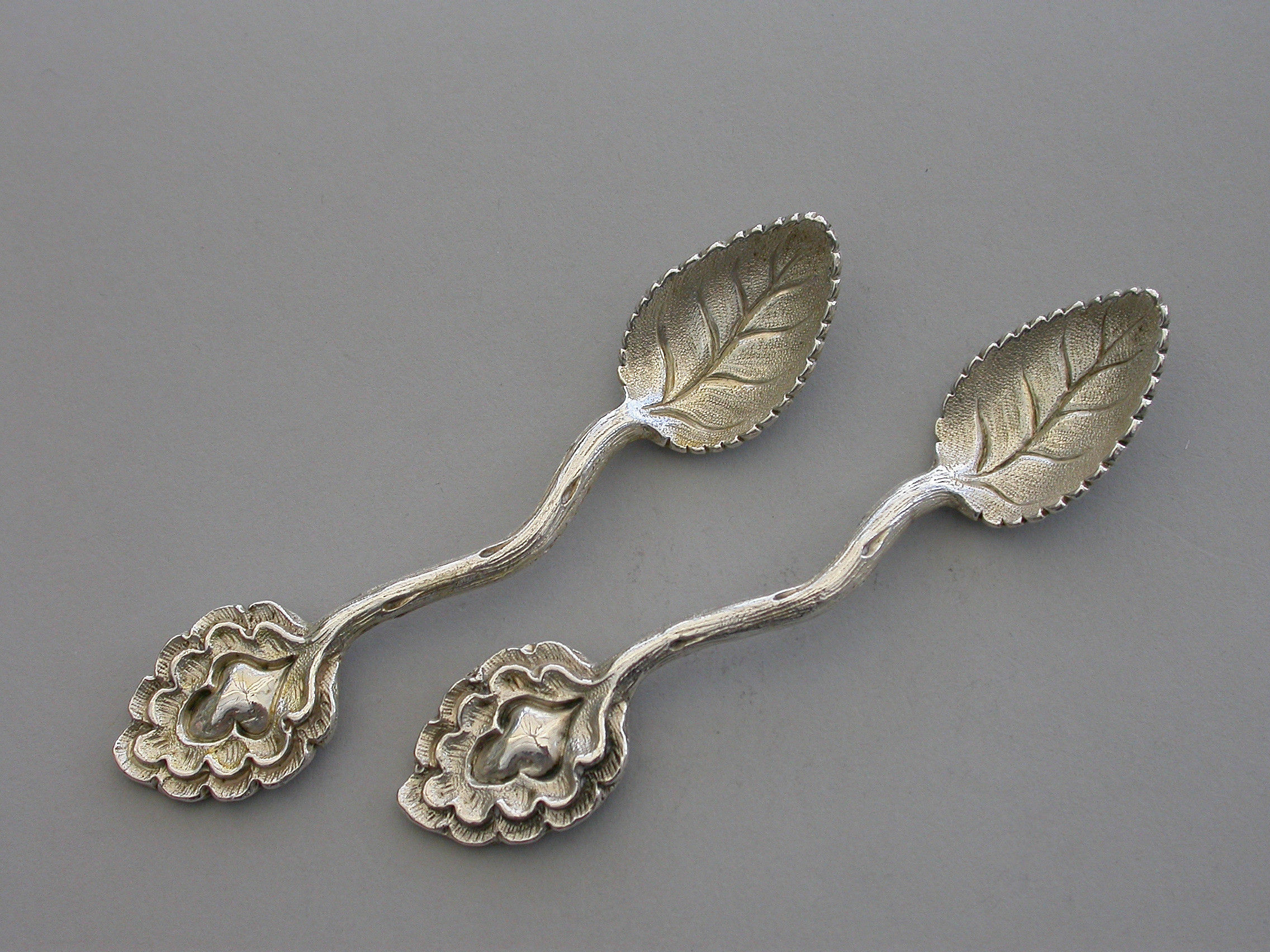 A good pair of early Victorian cast silver Salts Spoons, with veined leaf shaped bowls, the wavy twig handles terminating in stylised flowerheads.