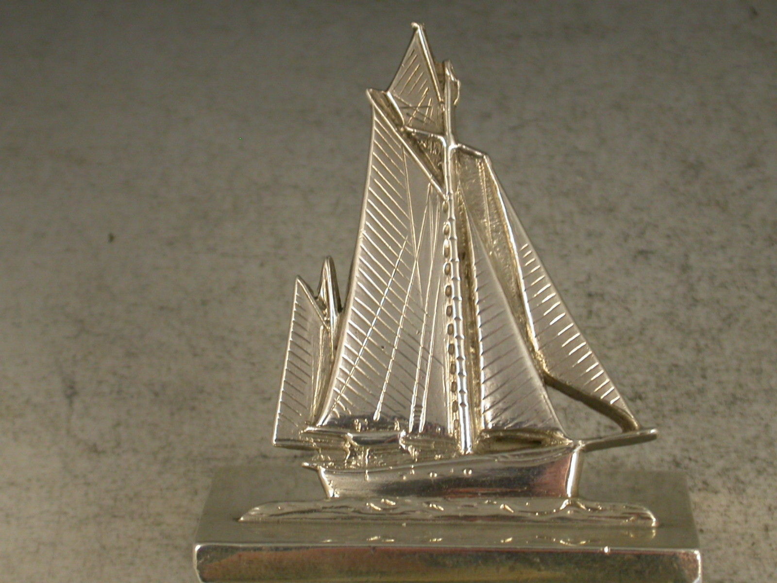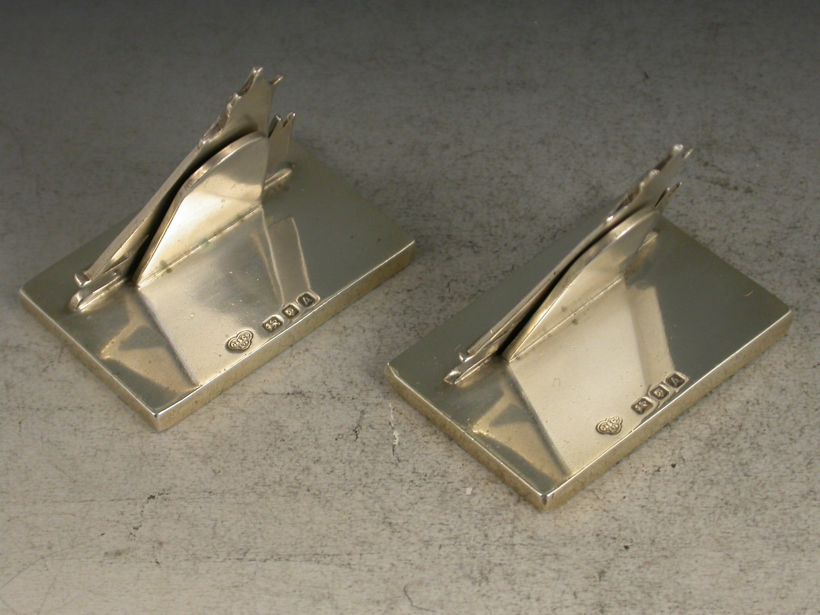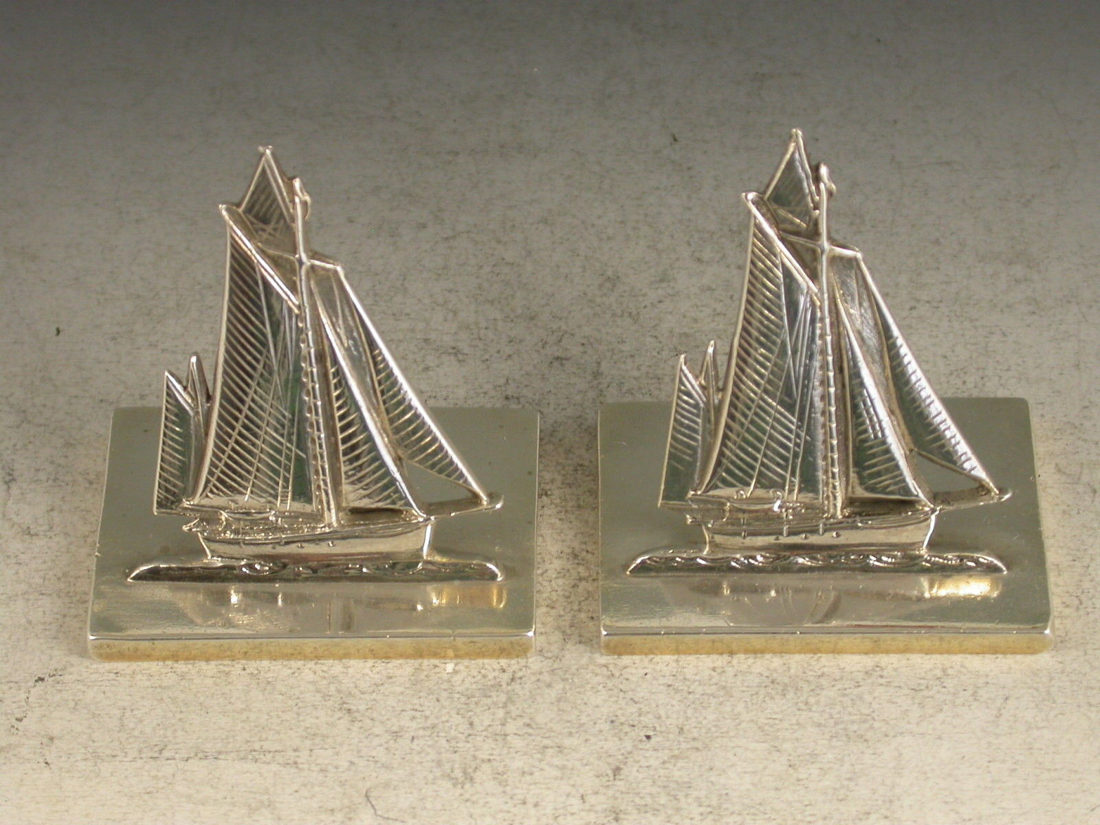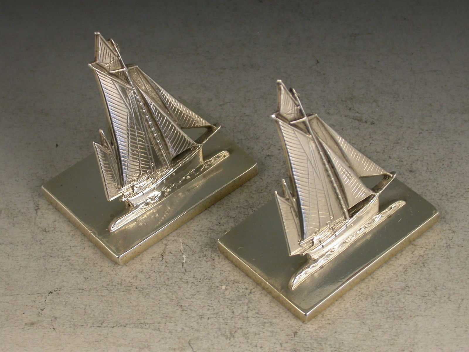 A fine quality pair of Edward VIII heavy cast silver Menu Holders formed as Sailing Boats on plain cast rectangular bases.