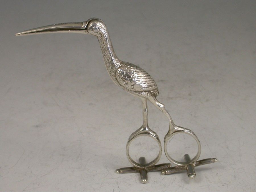 A good quality pair of Edwardian cast Continental silver Ribbon Threaders made in the form of a Stork, a baby wrapped in swaddling clothes to the interior, standing on two crossed supports.