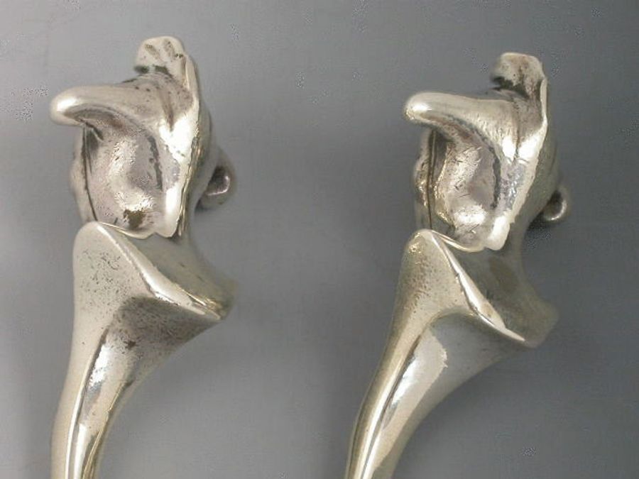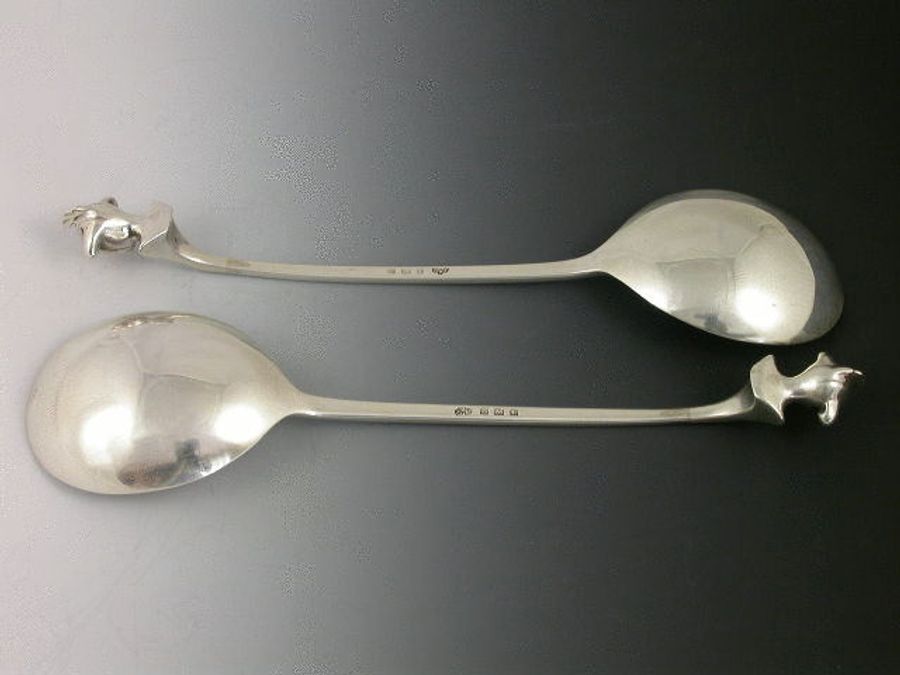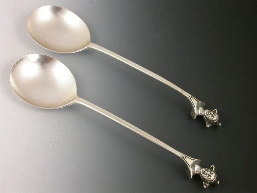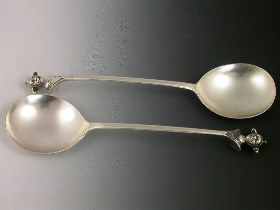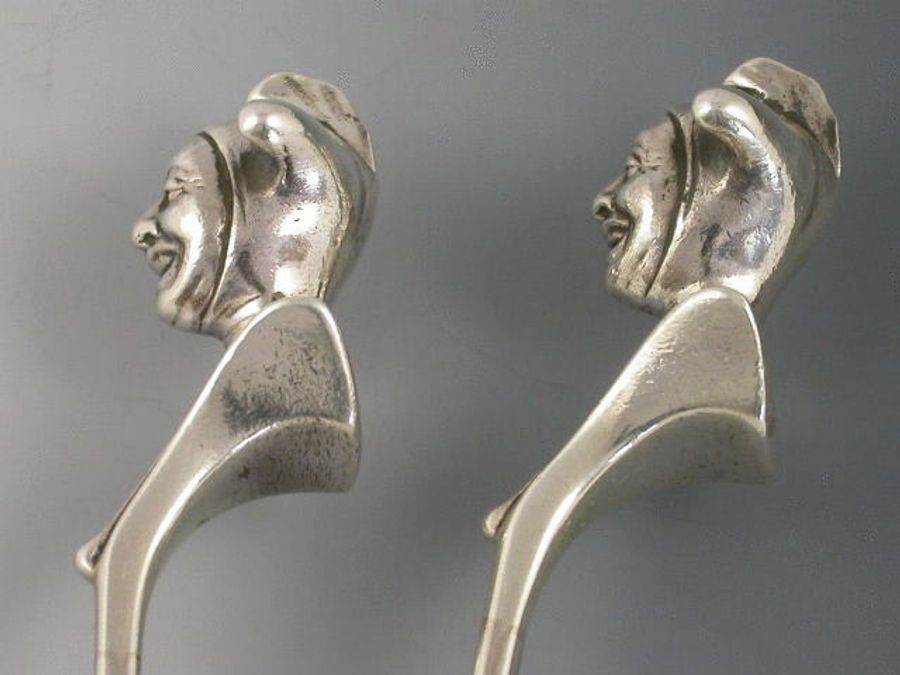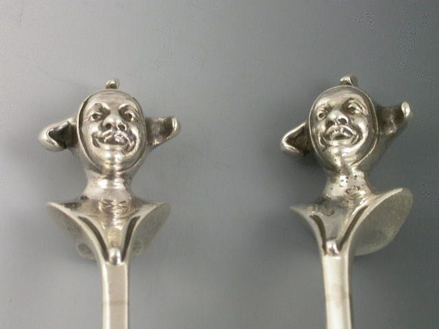 A good quality pair of Edwardian silver Serving Spoons with plain oval bowls and handles, the terminals realistically cast as the heads of smiling Jesters.