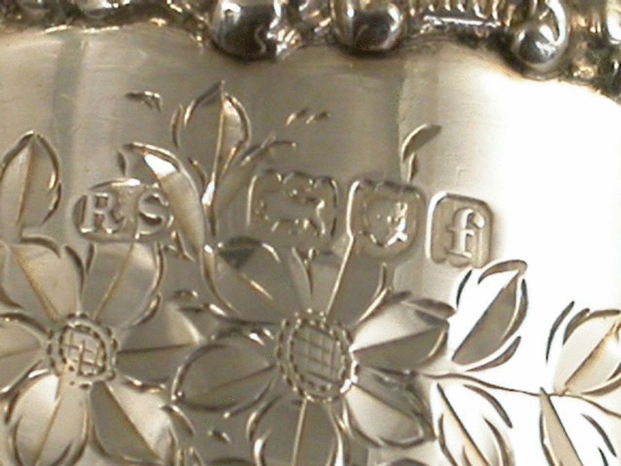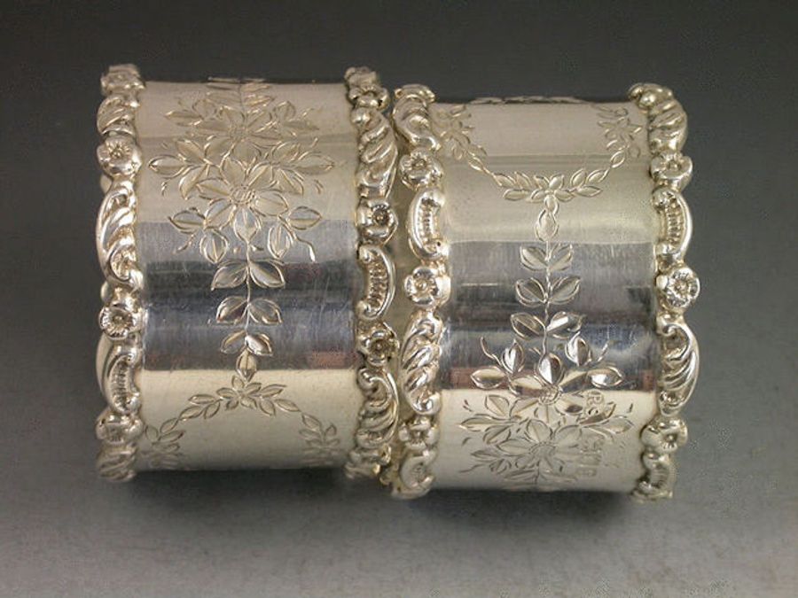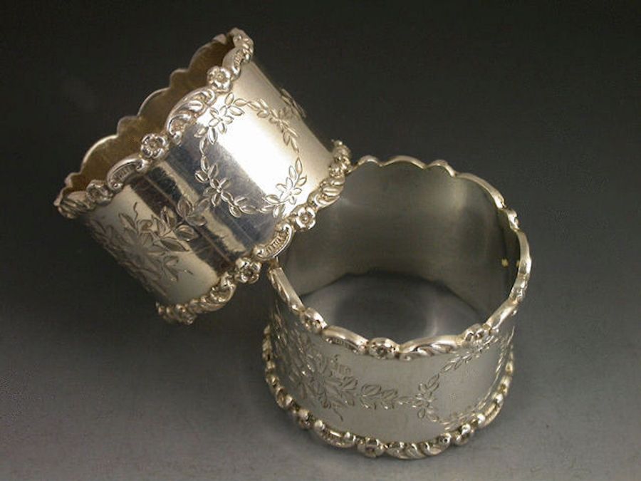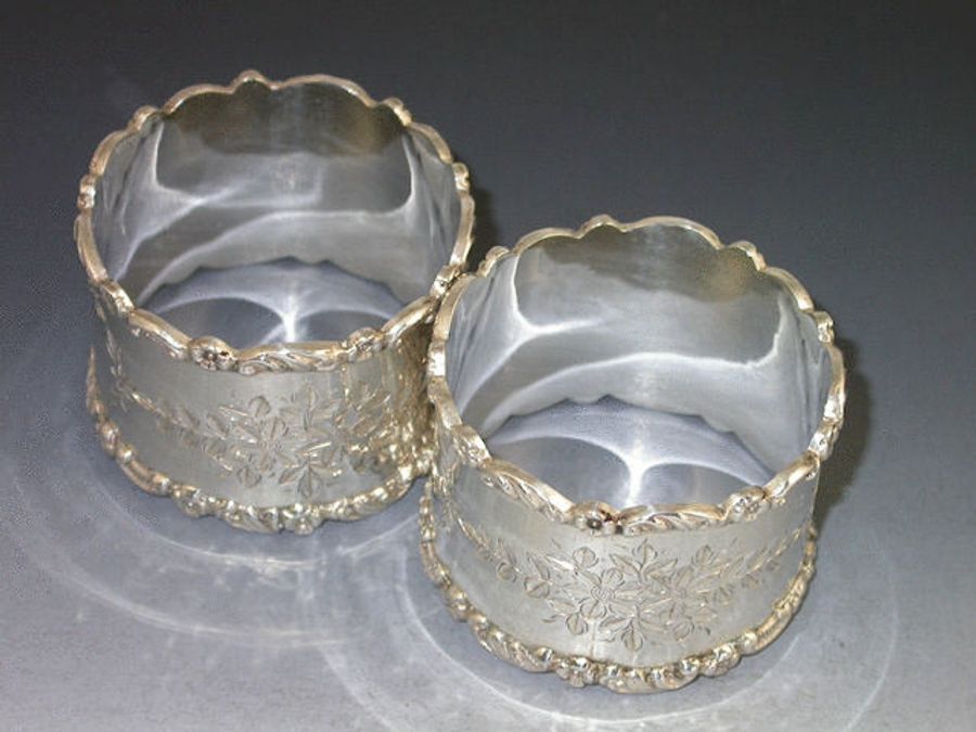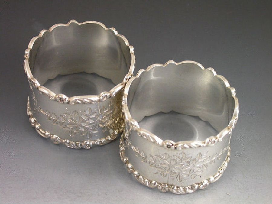 A very fine quality and heavy pair of Edwardian silver Napkin Rings with ornate cast raised borders, finely engraved with foliate sprays and vacant circular cartouches.