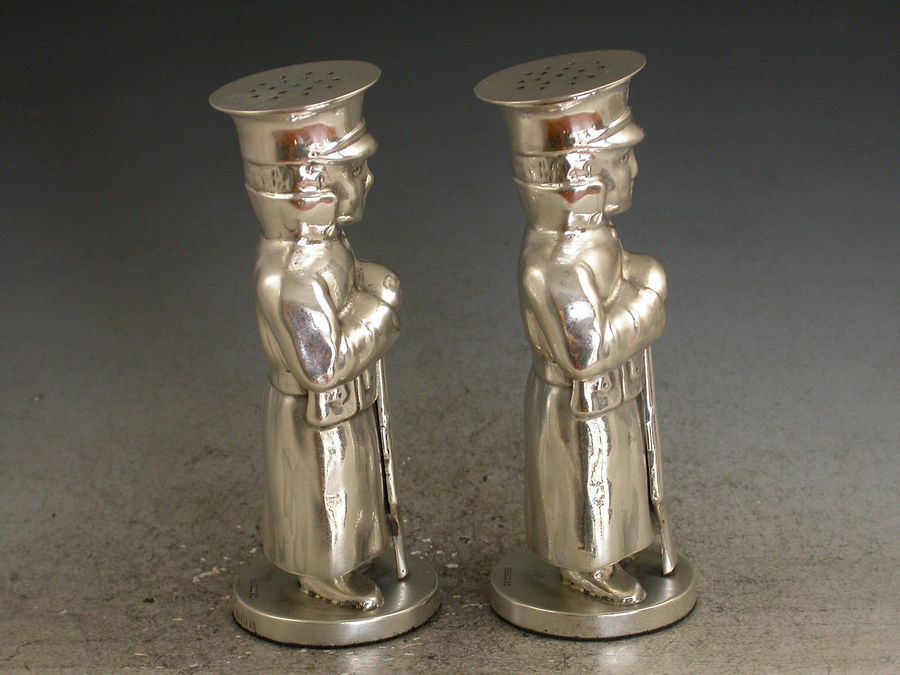 A rare pair of Edwardian novelty silver figural Peppers made in the form of a British Army Soldiers standing with their rifles, dressed against the cold in their great coats and caps.