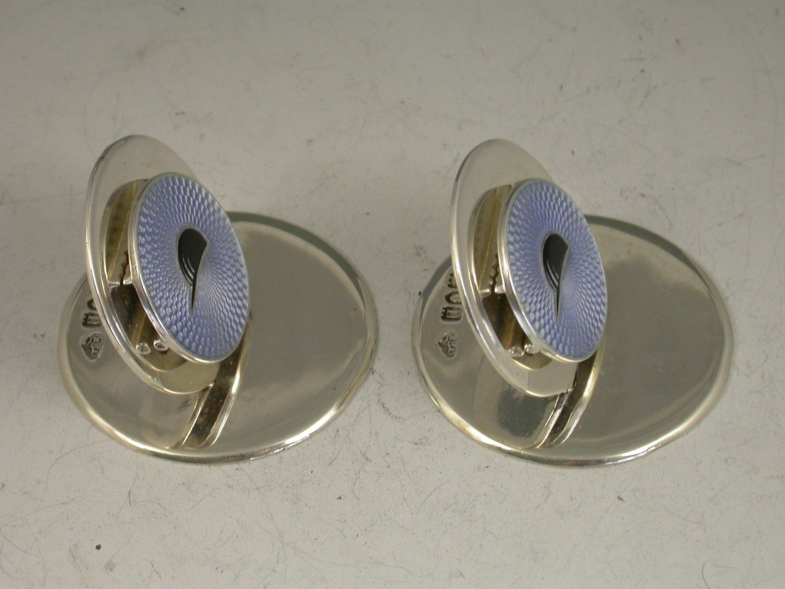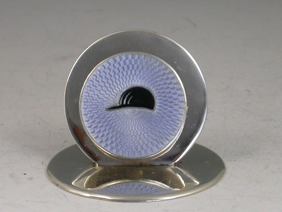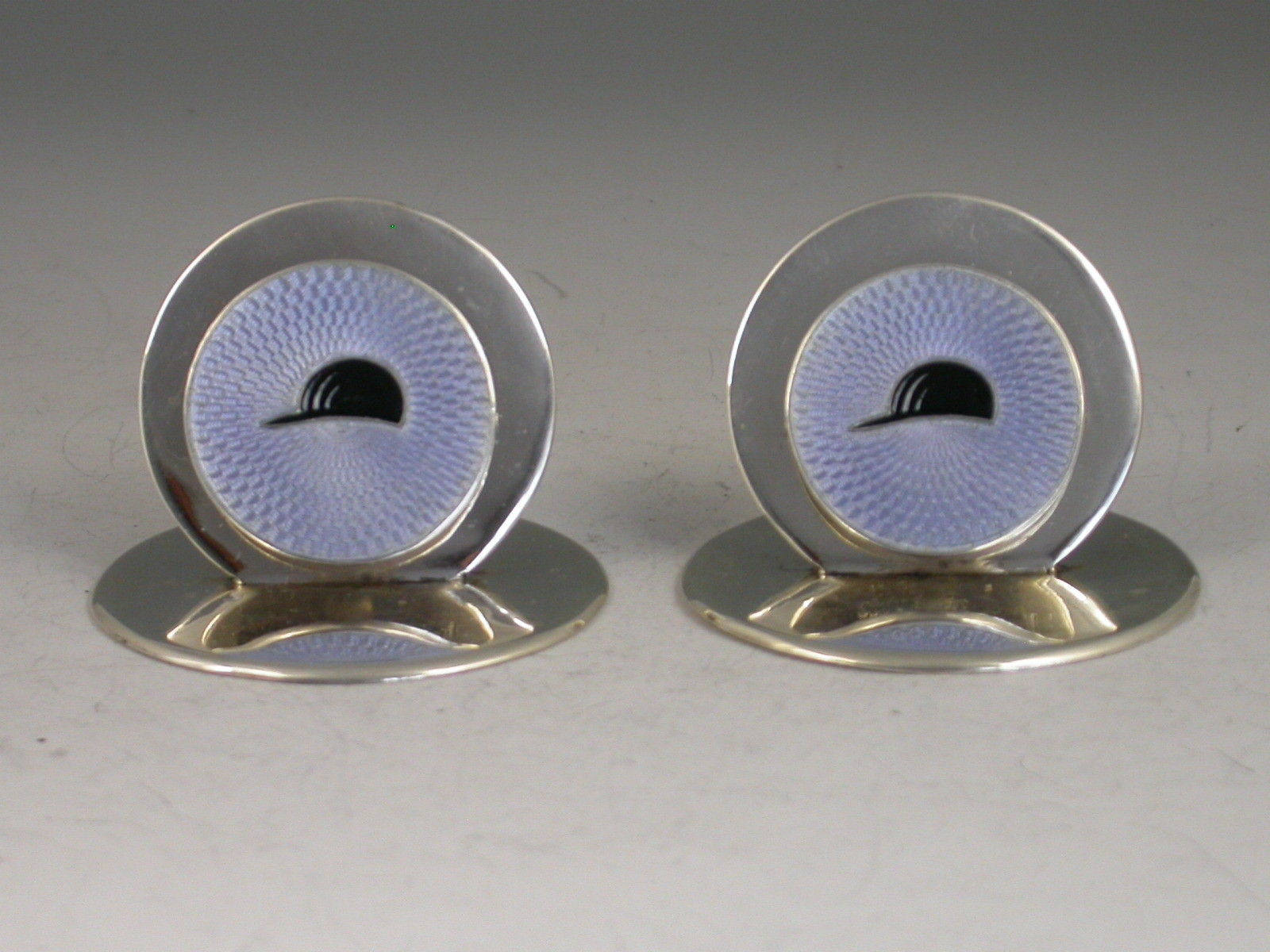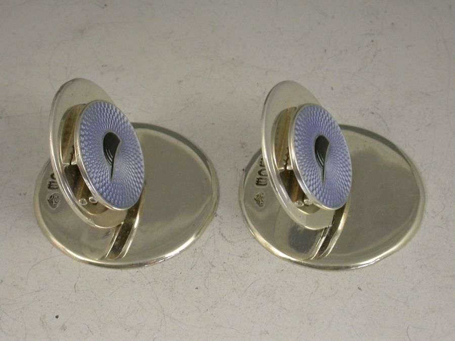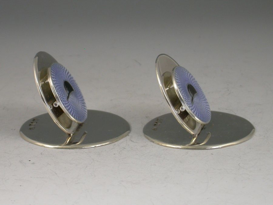 A fine quality pair of Edwardian silver Menu holders of double disc form on circular bases, the smaller disc hinged and sprung against the larger disc. Enamelled with black jockey caps on a pale blue guilloche enamel background.