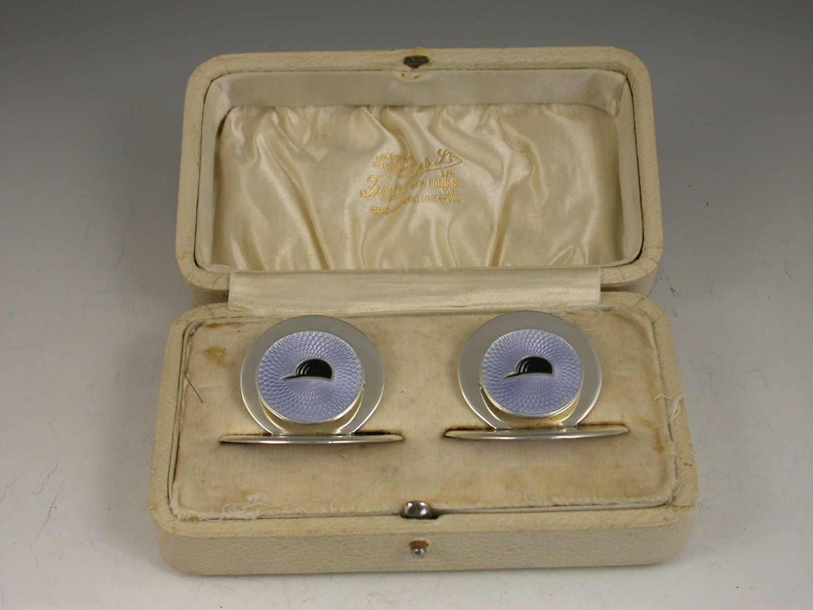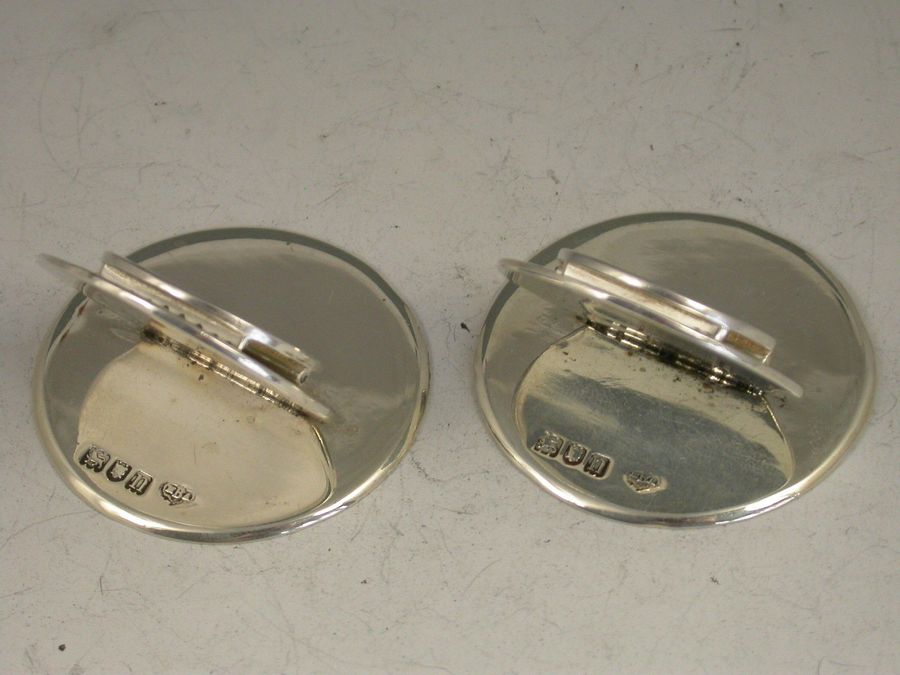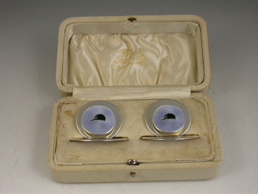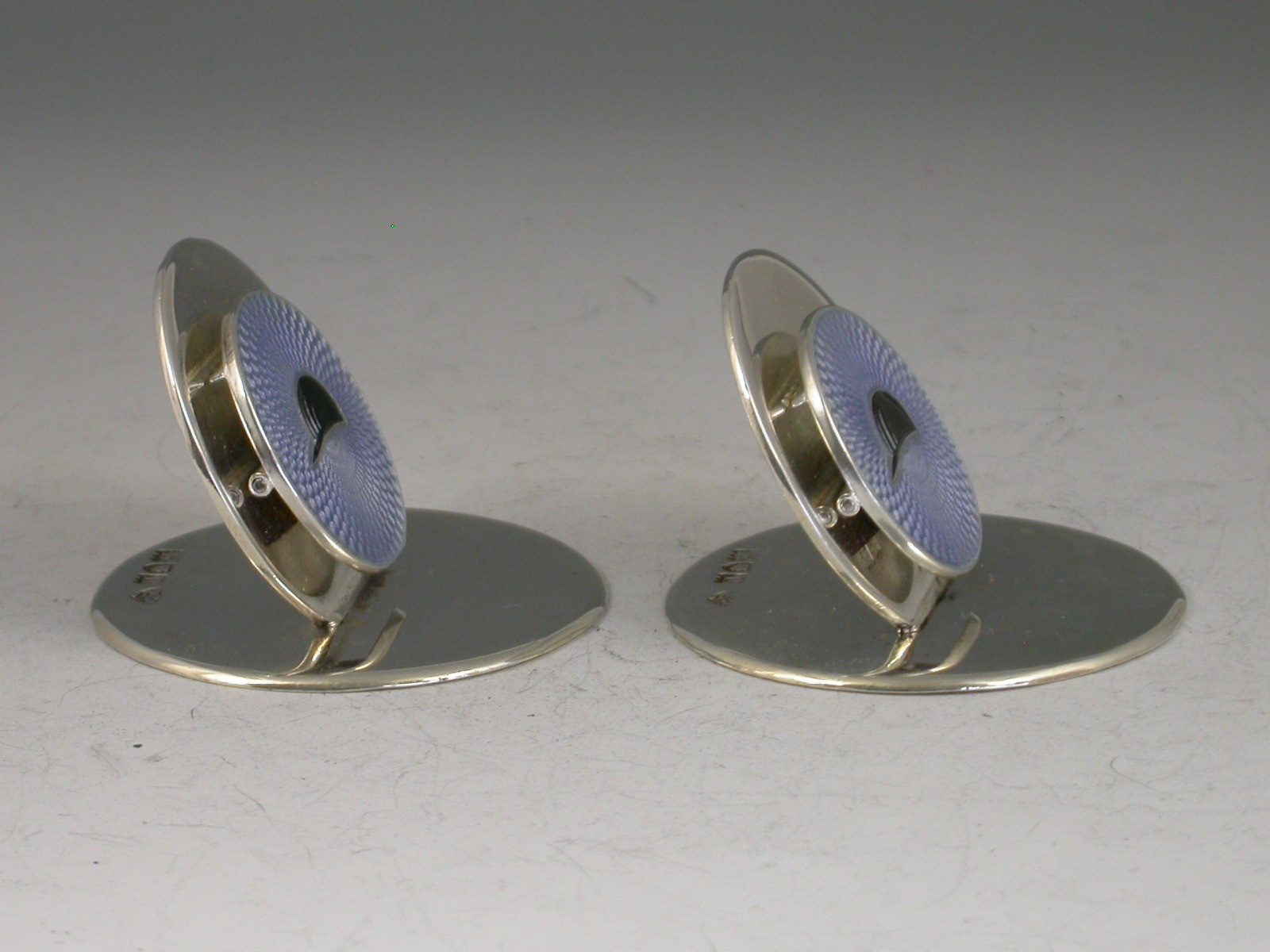 A fine quality pair of Edwardian silver Menu holders of double disc form on circular bases, the smaller disc hinged and sprung against the larger disc. Enamelled with black jockey caps on a pale blue guilloche enamel background.