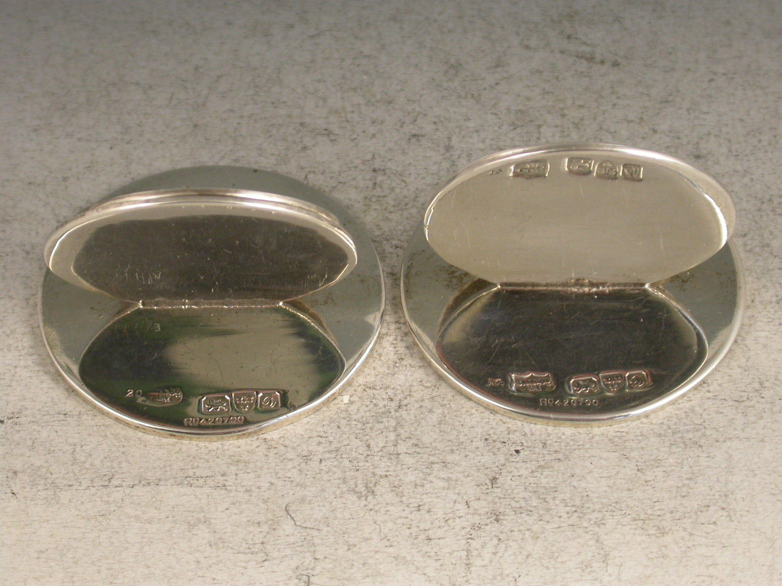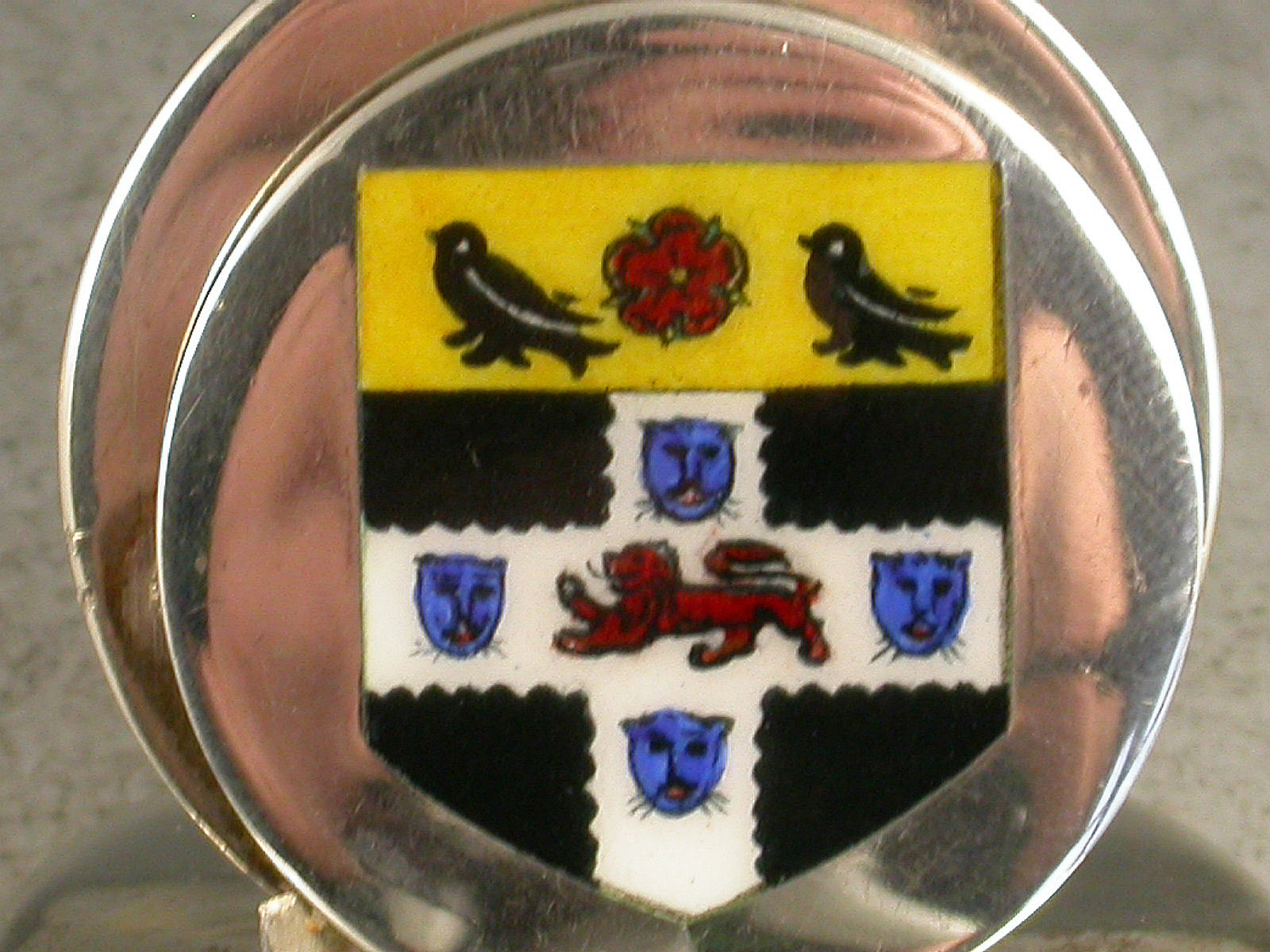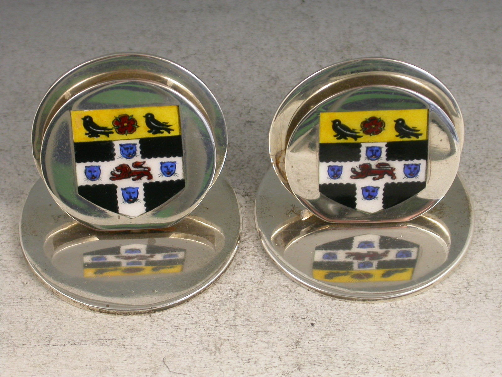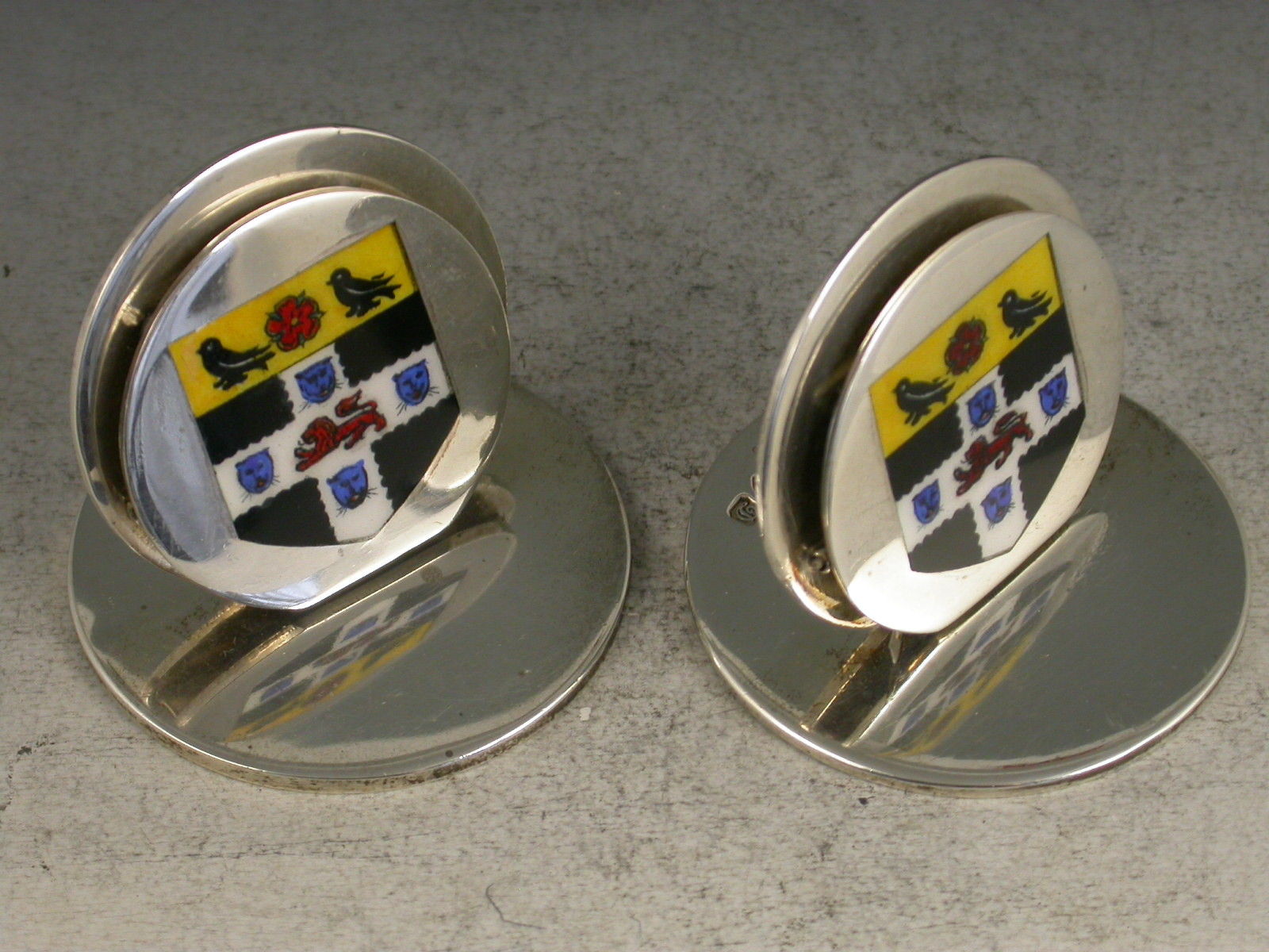 A fine quality pair of Edwardian silver and enamel Menu Holders, of double disc form on flat circular bases, the sprung circular front panels enamelled with the Coat of Arms of Christ Church College, Oxford University.