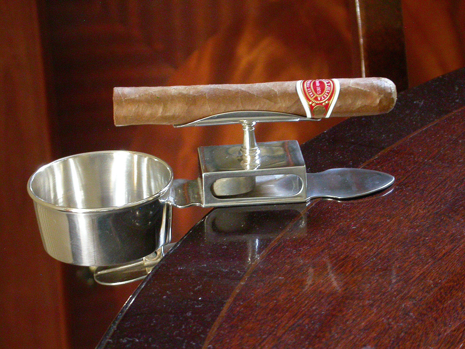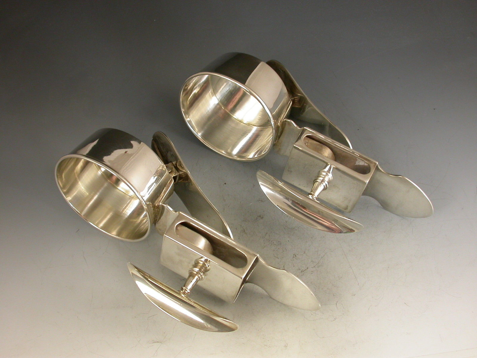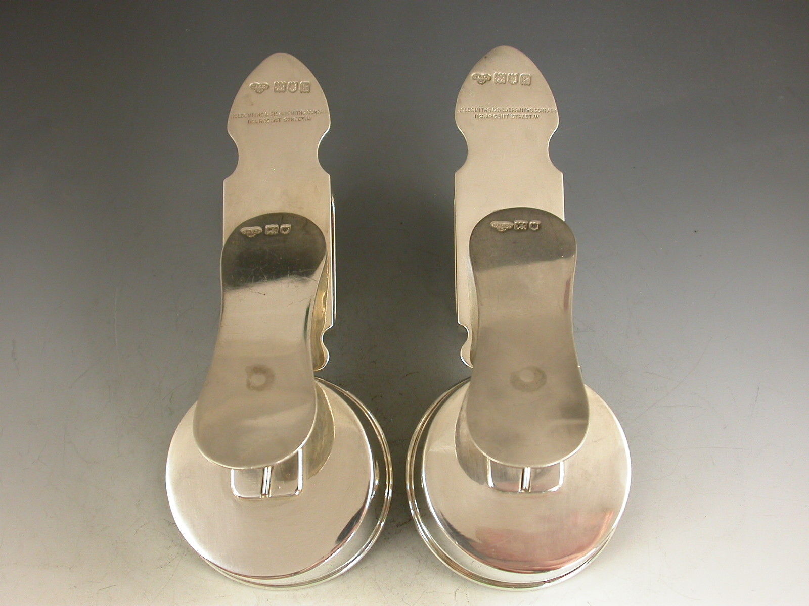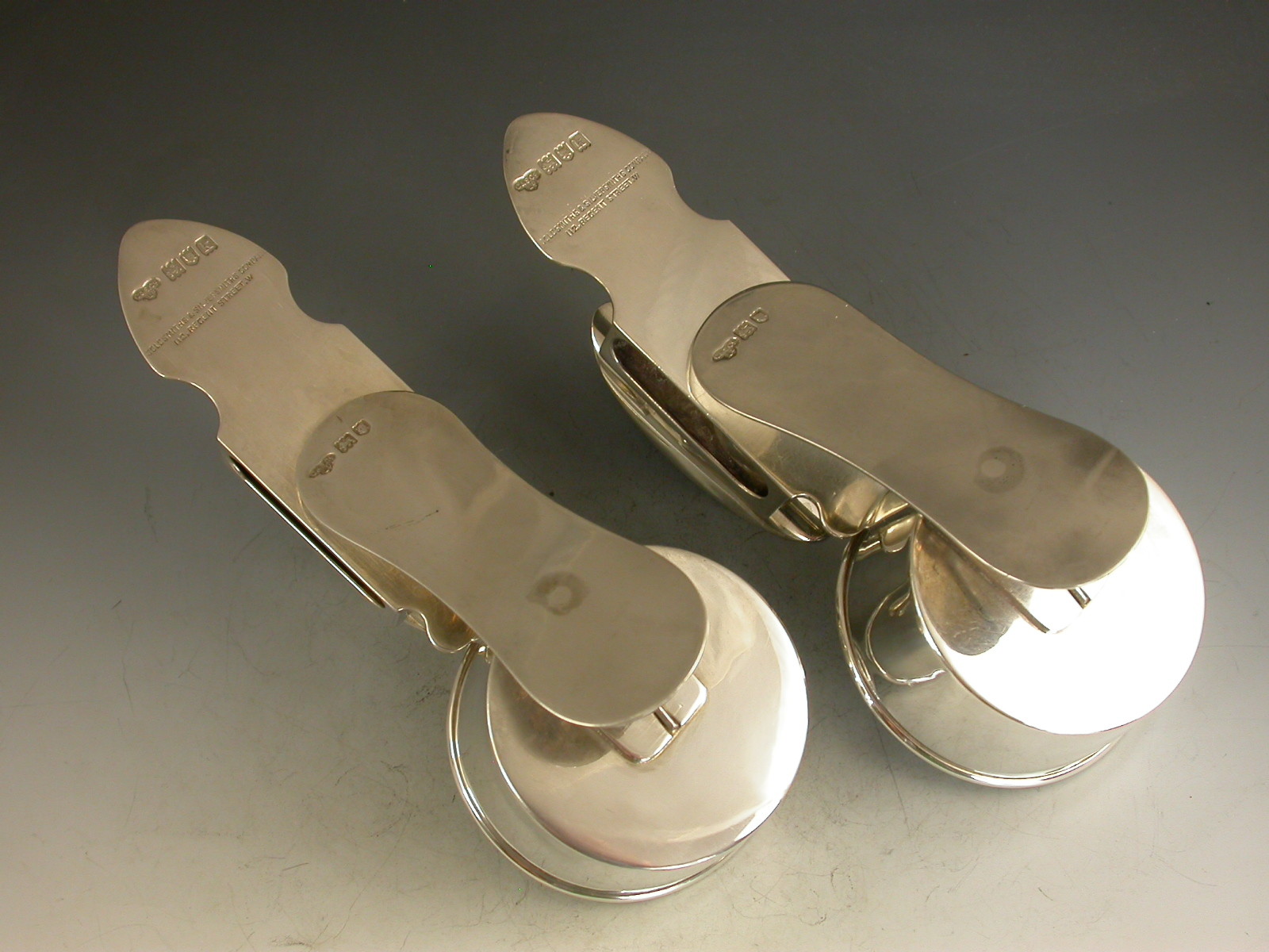 A fine quality pair of Edwardian silver portable clip-on Ash Trays combined with Cigar Rests and Matchbox Holders, with a sprung clip to attach to a table etc.