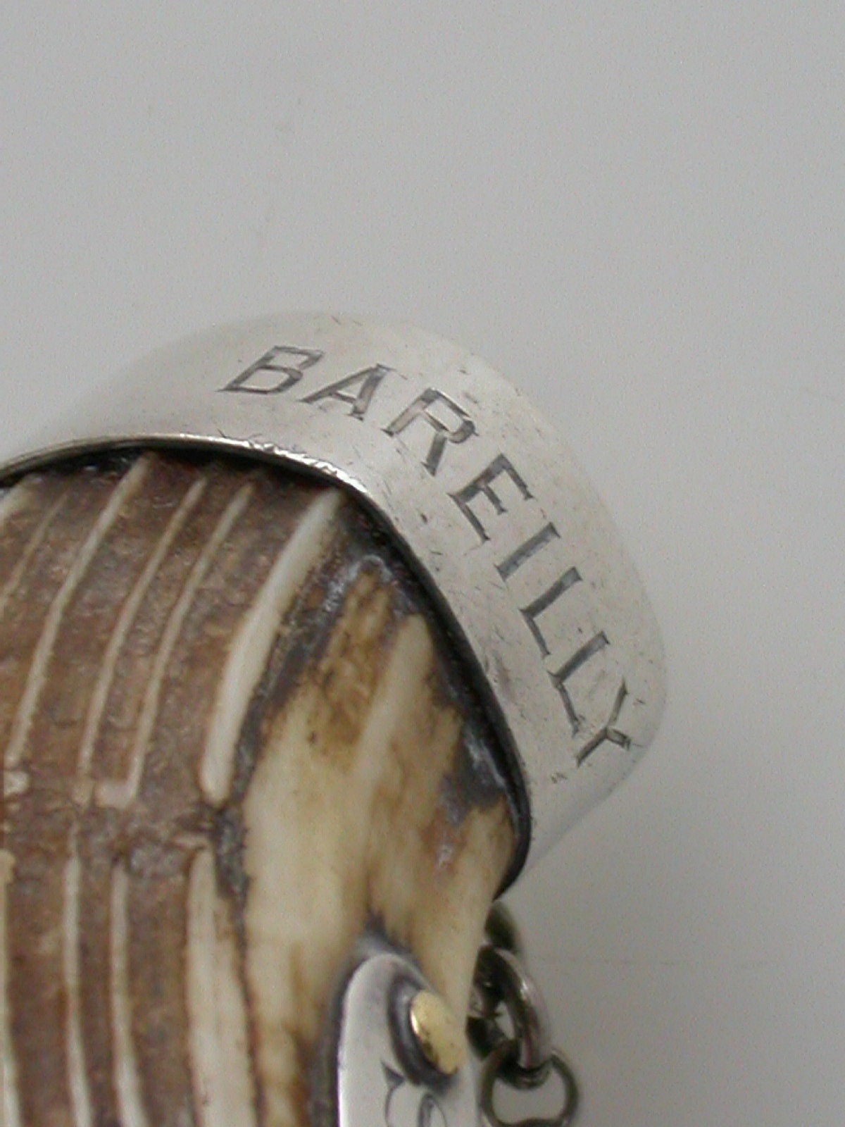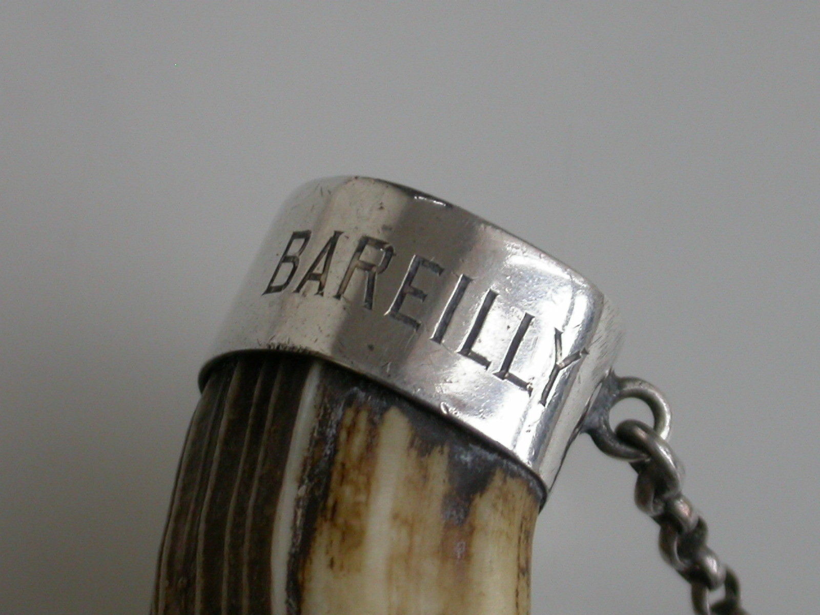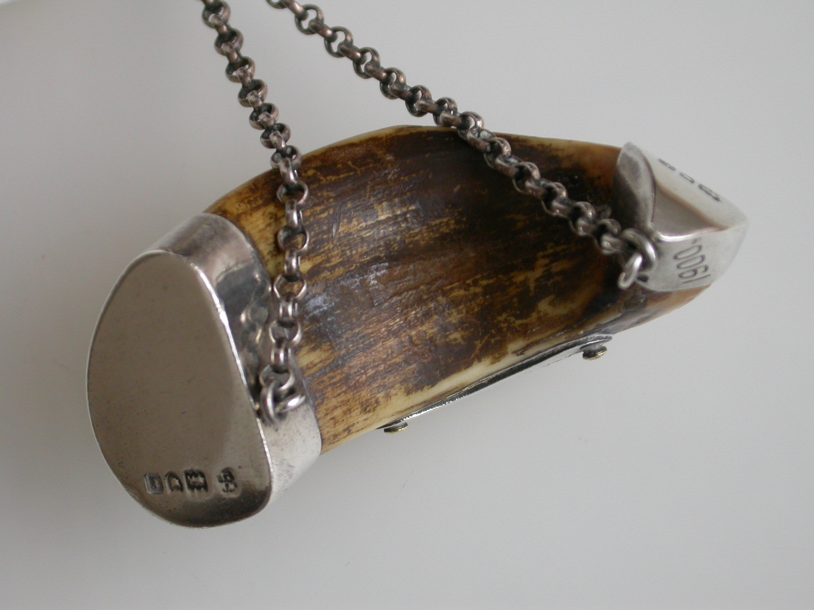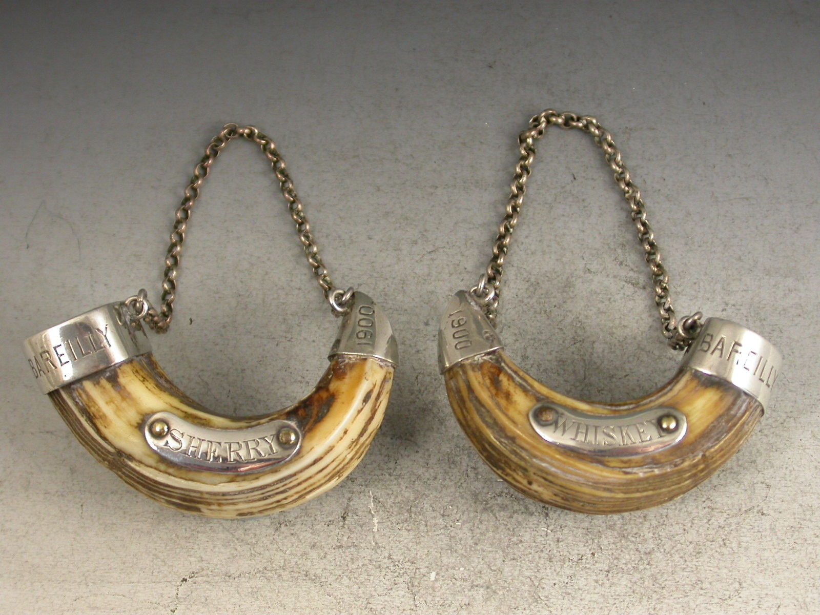 An interesting pair of Victorian/Edwardian silver mounted Boars Tusk Wine Labels, with crescent shaped silver plaques engraved for Whiskey & Sherry, the tusks carved to fit inside the silver mounts which are engraved 'Bareilly' and '1900' (Bareilly is a prominent city in Northern India).