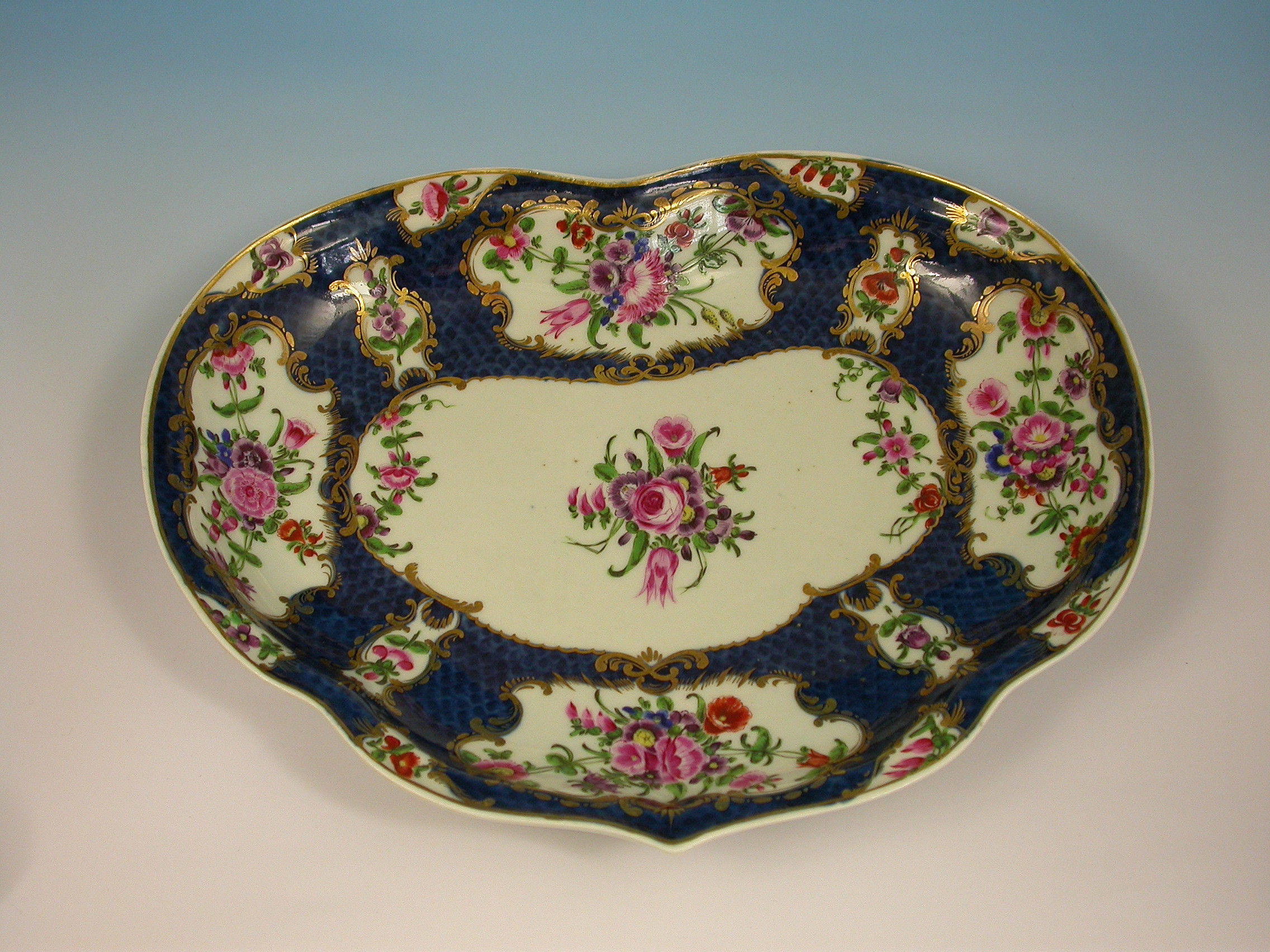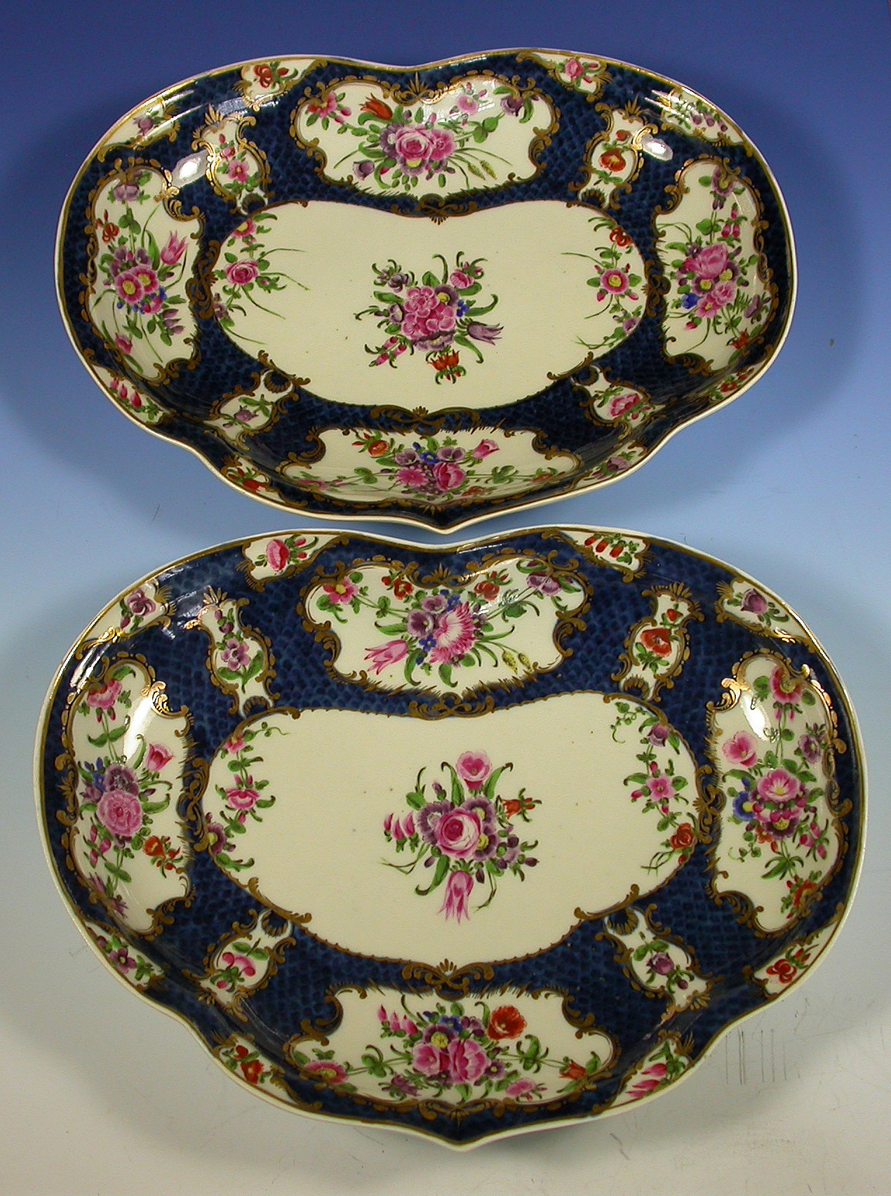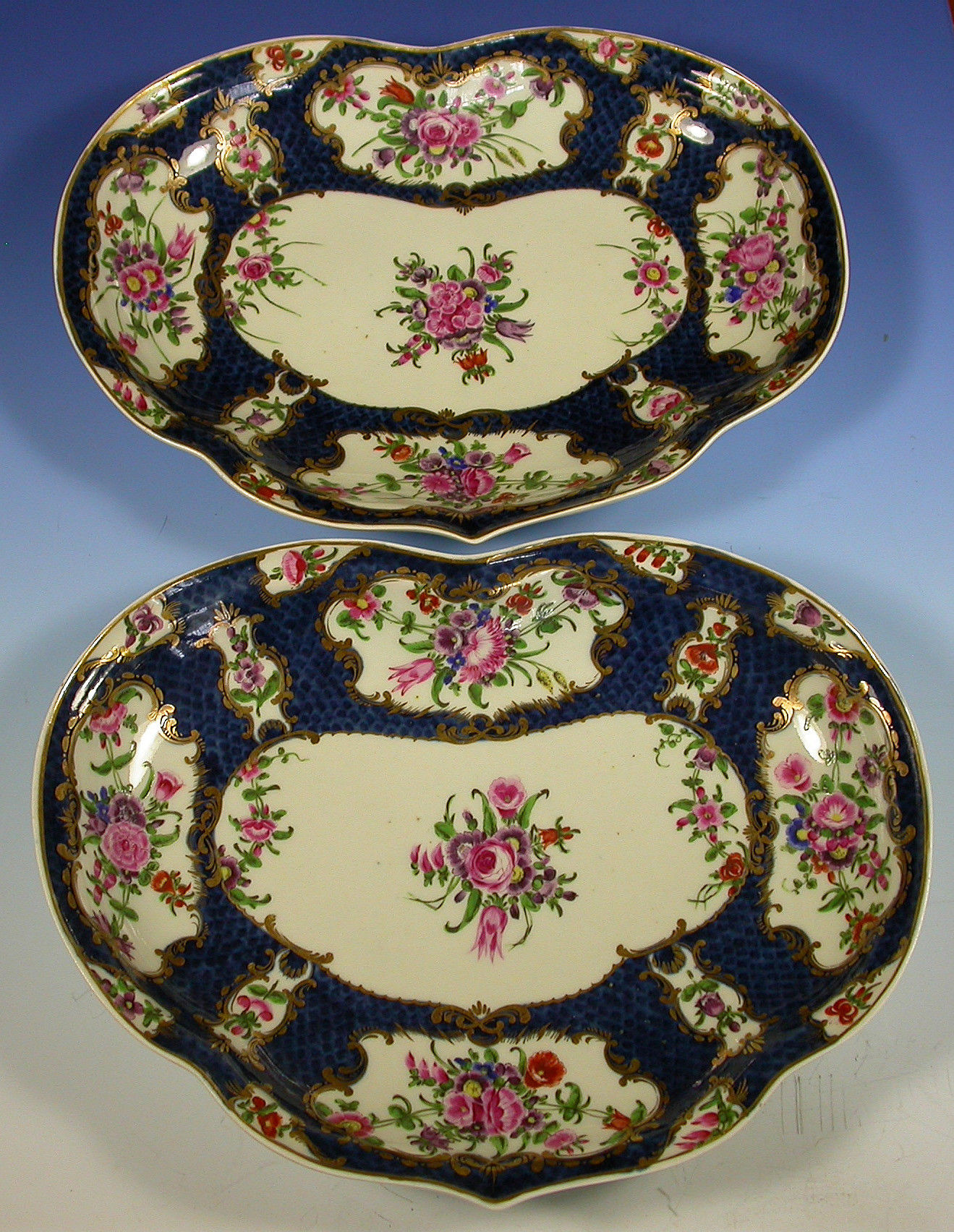 A good pair of First Period Worcester heart shaped dishes, painted with blue scale grounds and gilded cartouches of European flowers. c1770