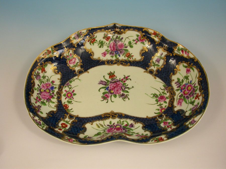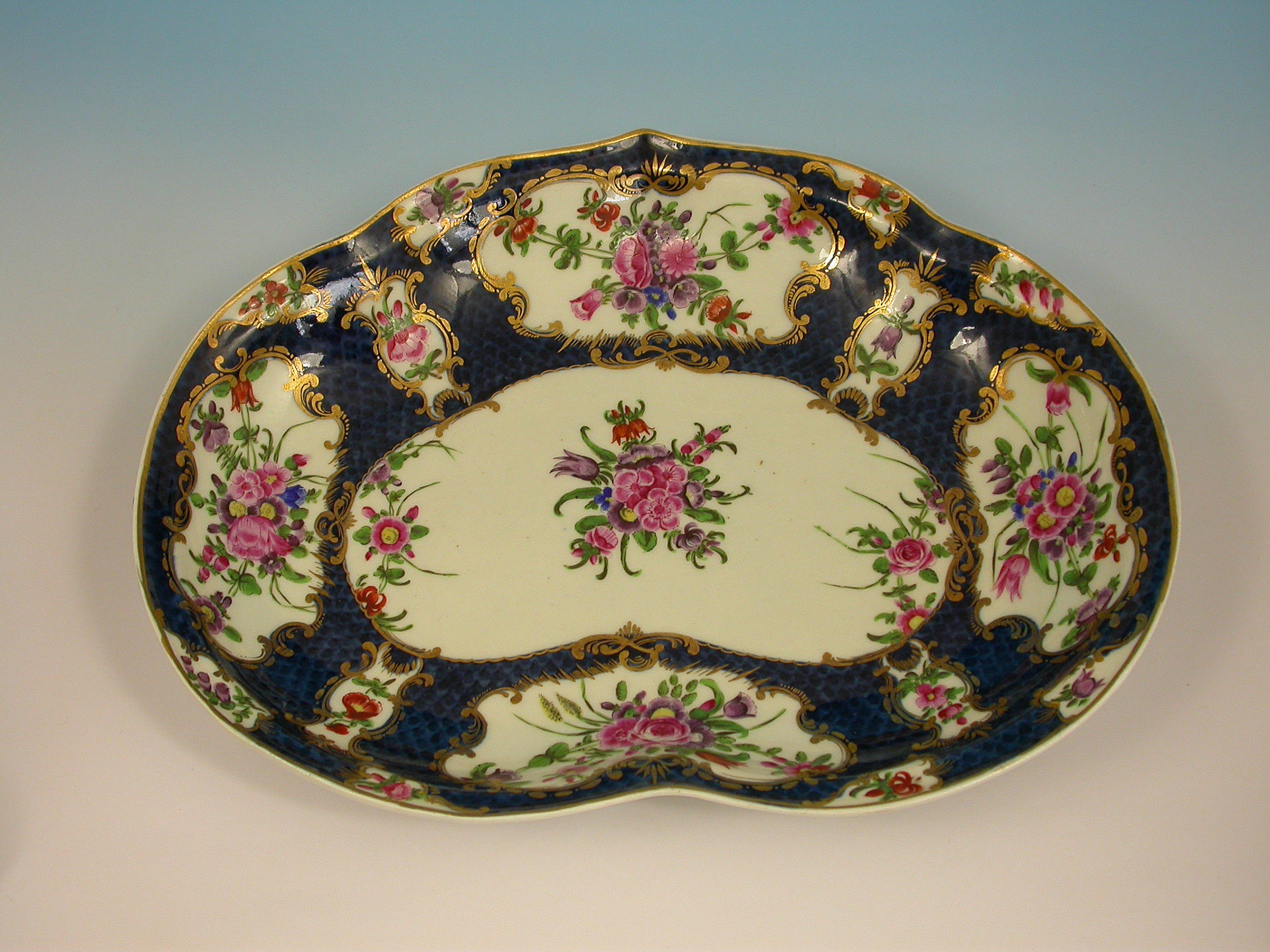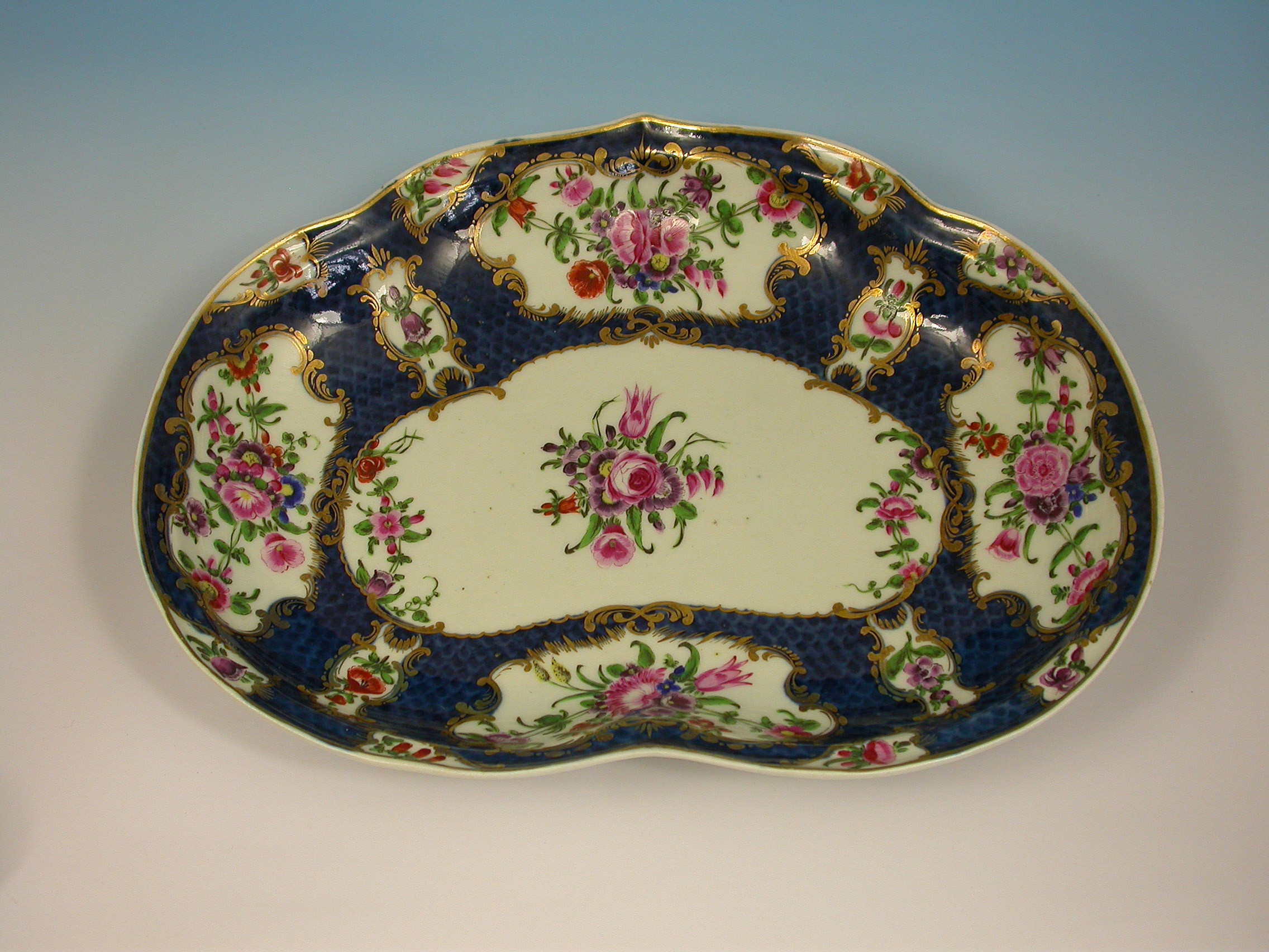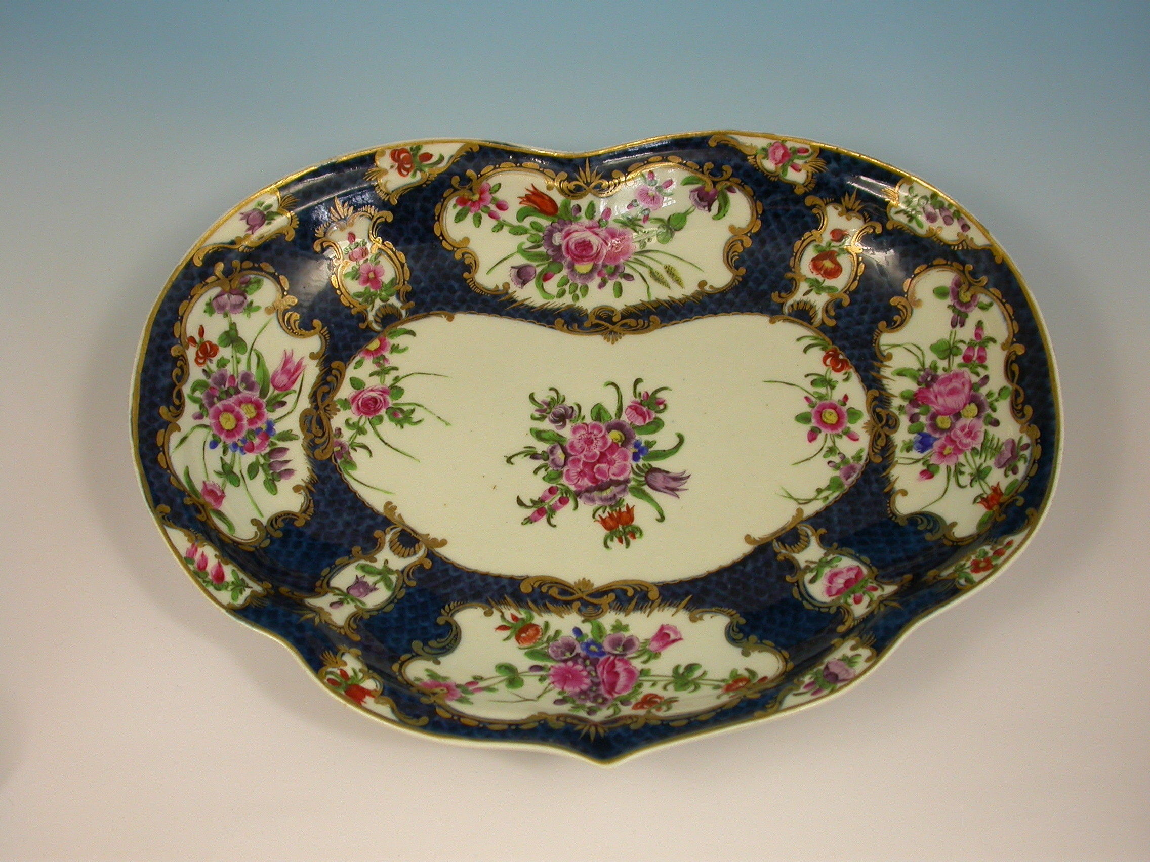 A good pair of First Period Worcester heart shaped dishes, painted with blue scale grounds and gilded cartouches of European flowers. c1770
