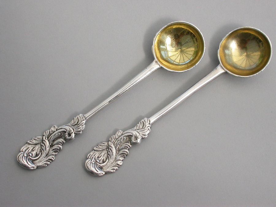 A good pair of George II cast silver Naturalistic Salt Spoons with leafy terminals and circular shell shaped gilded bowls.