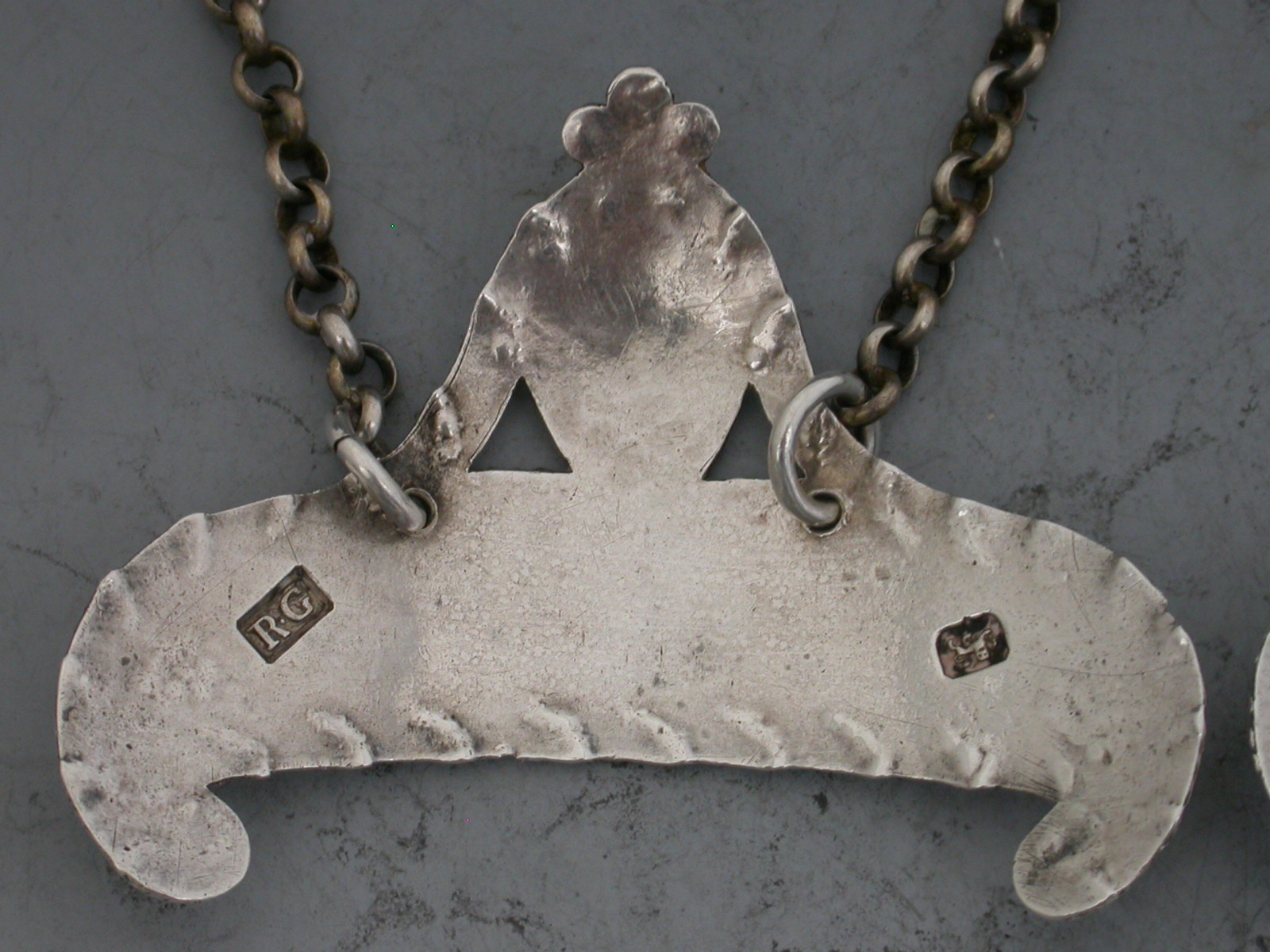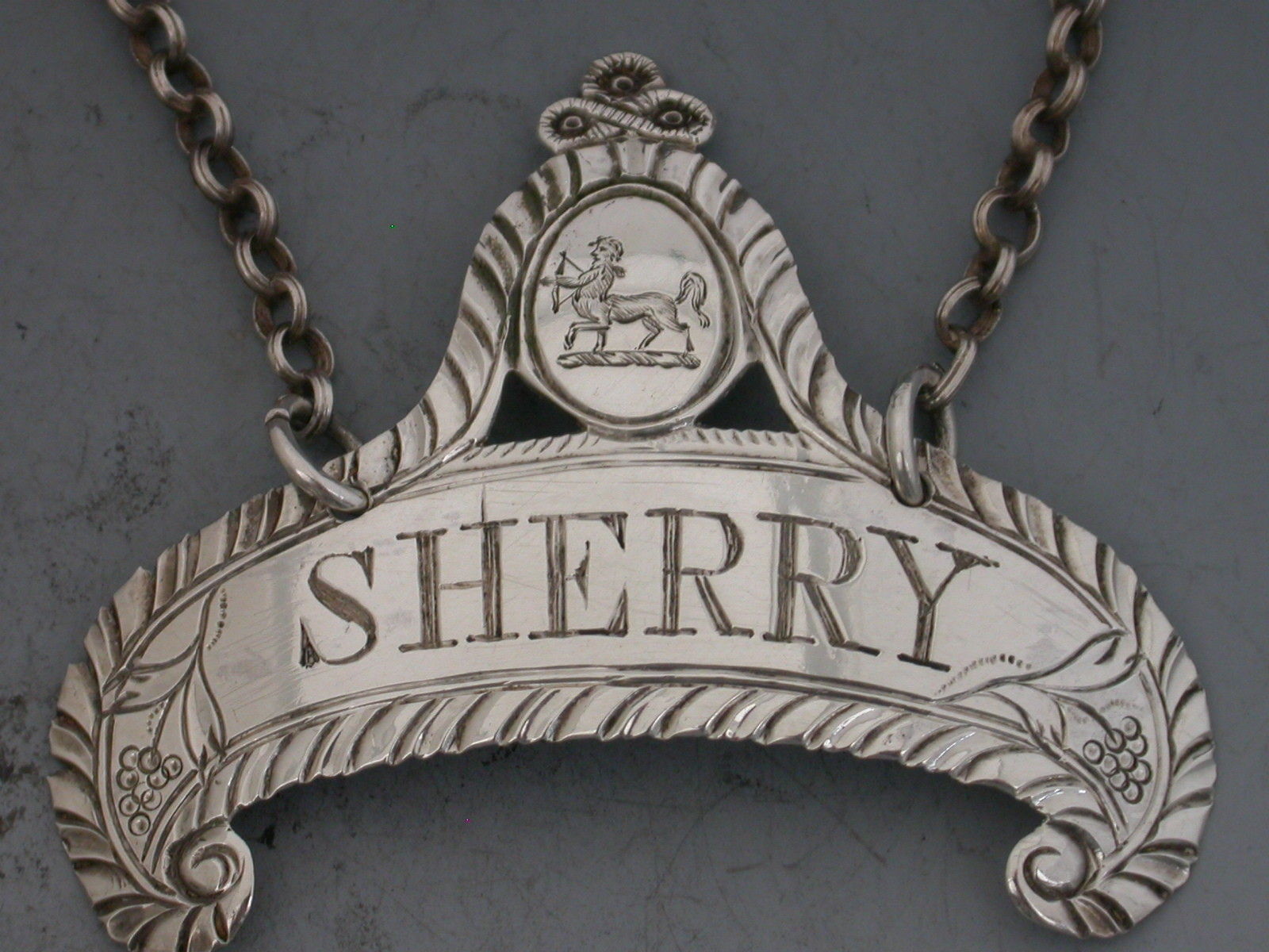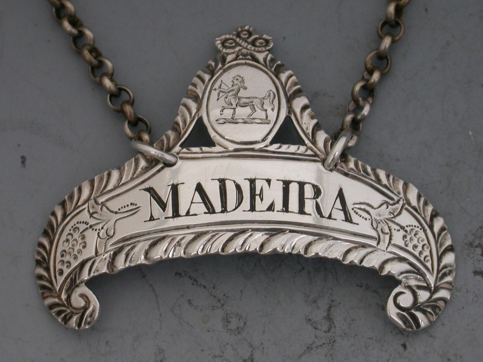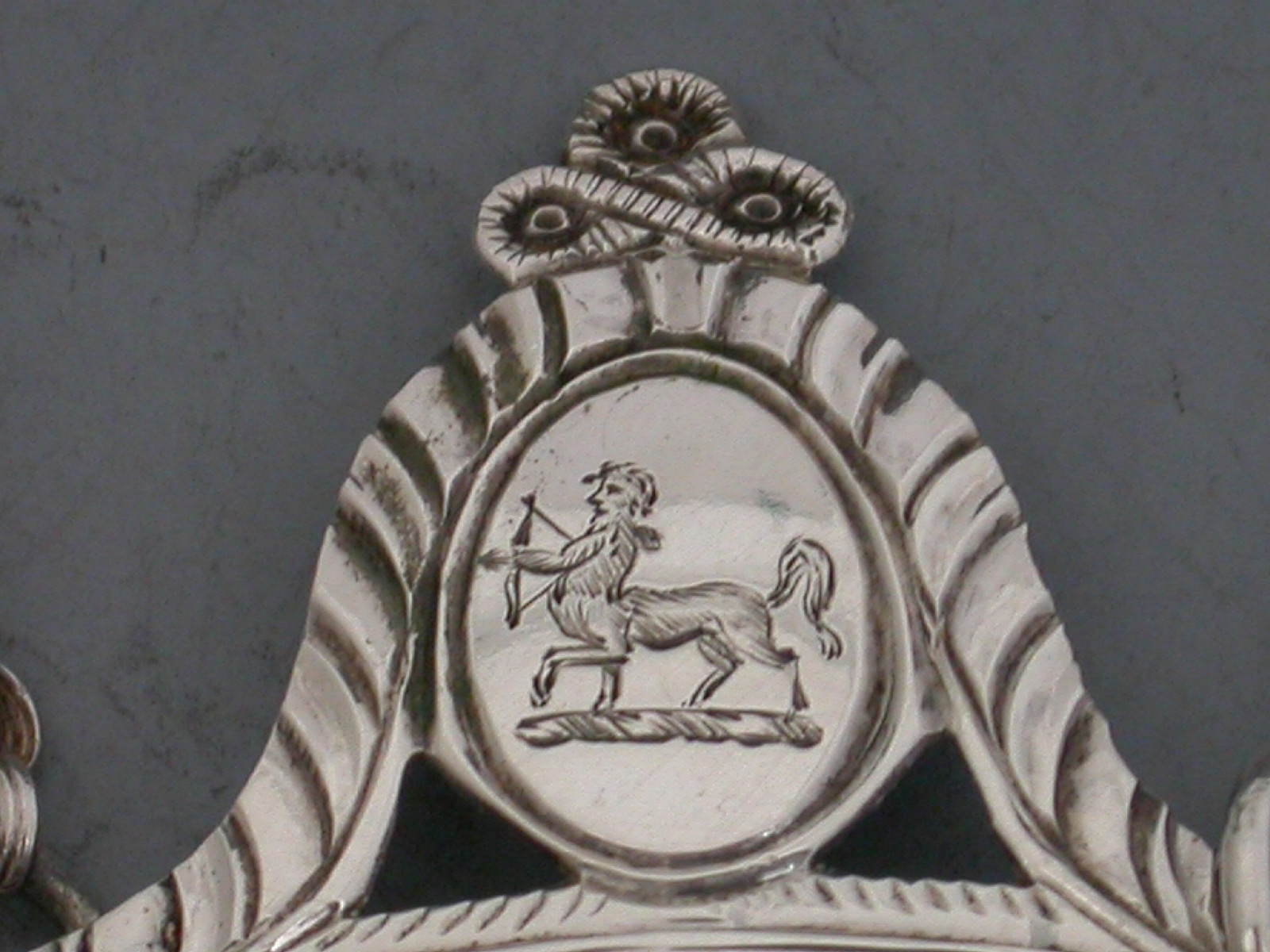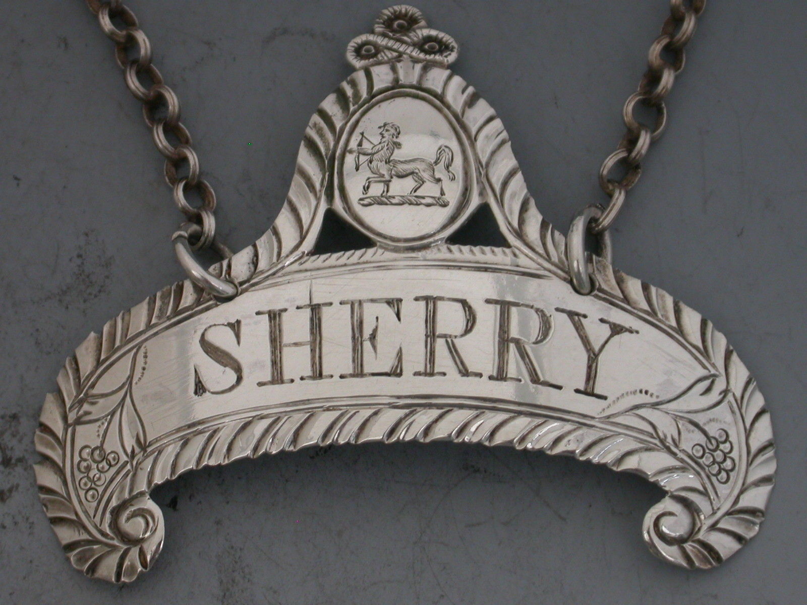 An unusual composed pair of George III 18th century silver Wine Labels of down-turned scroll form with feather edged borders and tied ribbon surmounts, oval cartouches engraved with crests of a Centaur or Sagittarius, incised for Madeira and Sherry.