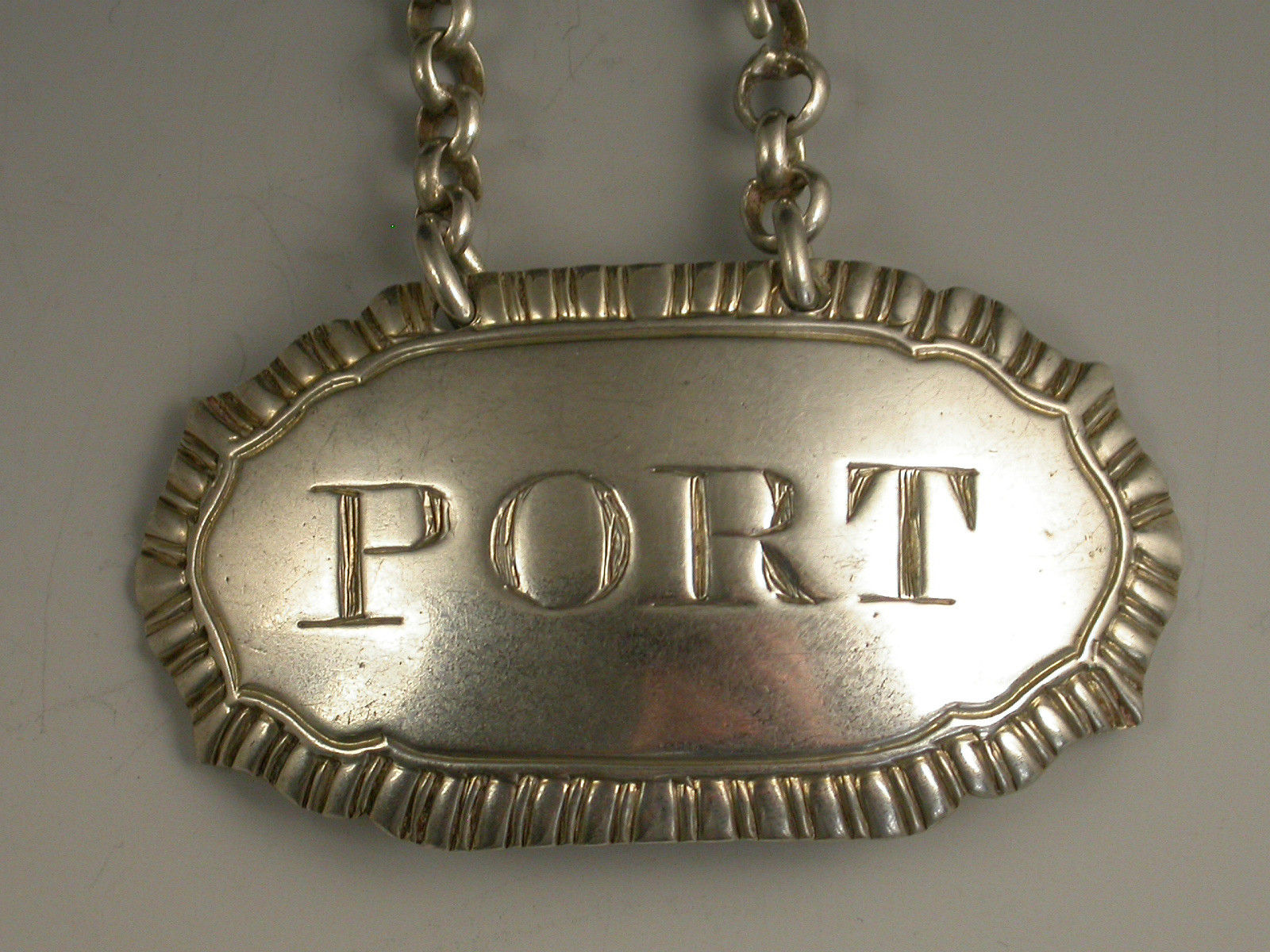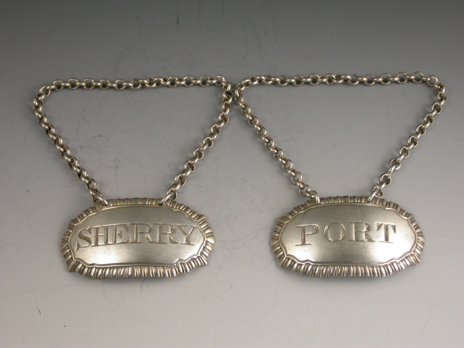 A good pair of George III cast silver Wine Labels of shaped oval form with gadrooned borders and a pointed ear to each corner, incised for Sherry and Port.