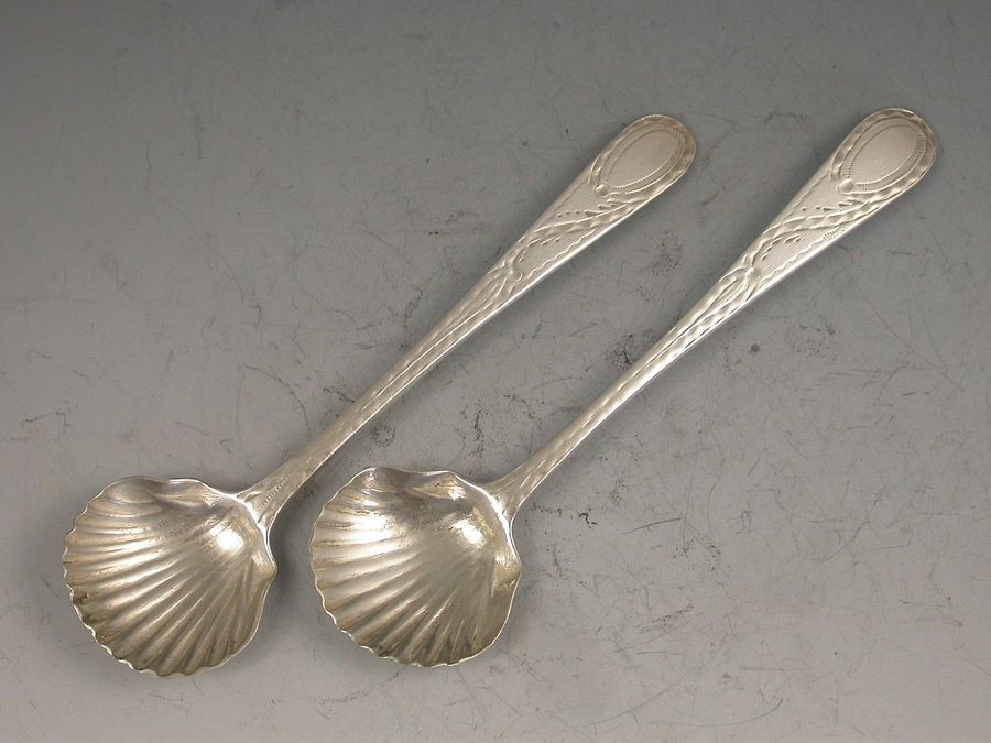 A good pair of late 18th century silver Salt Spoons with fluted scallop shell bowls and bright-cut Old English handles.