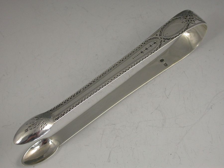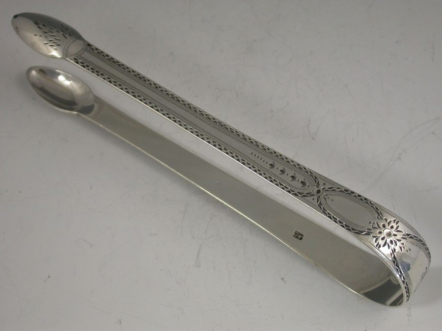 A good pair George III silver Sugar Tongs with bright cut engraved decoration, the bow with an oval cartouche engraved with contemporary initials W over I * E.