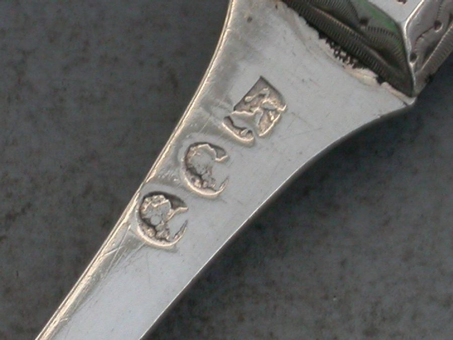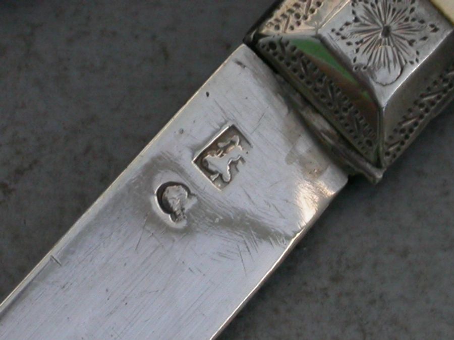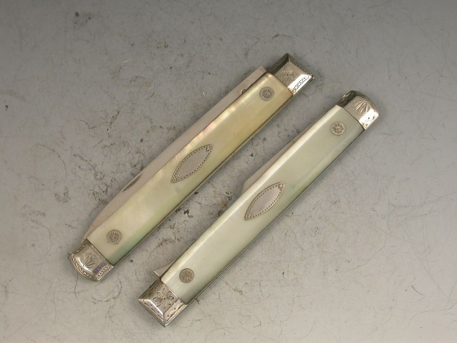 A very fine cased pair of George III silver and mother of pearl folding Fruit Knife and Fork, the mother of pearl handles inset with bright cut engraved silver roundels and eye shaped silver cartouches. The plain silver blades stamped with George III duty marks and lion passants only. The fork with rare double duty mark. Sheffield, 1797.