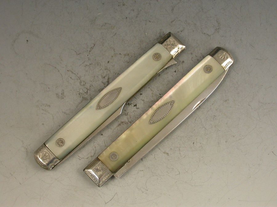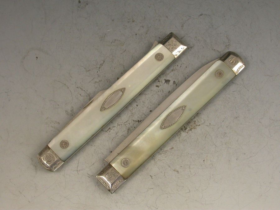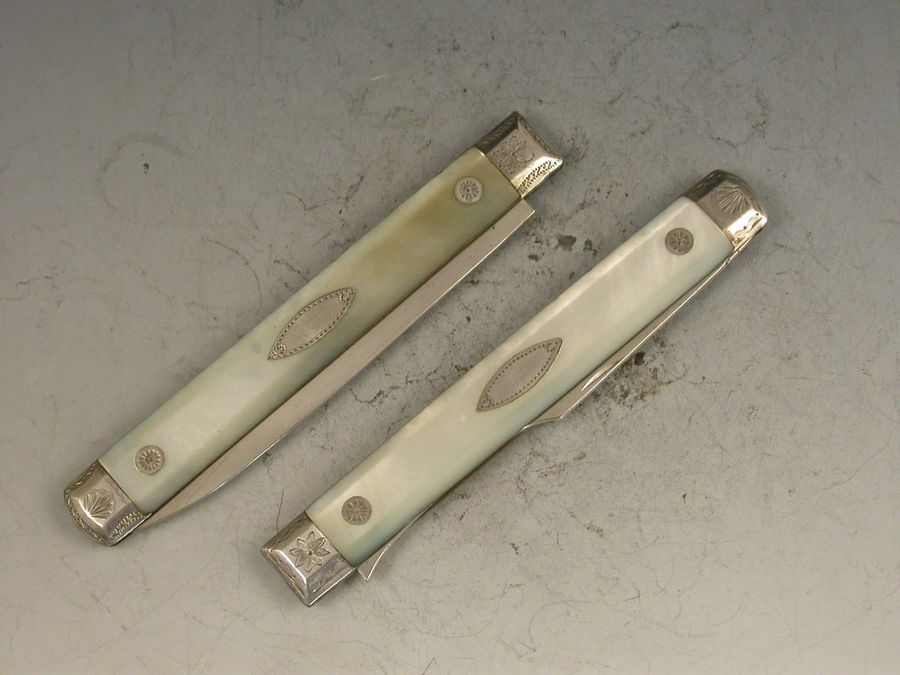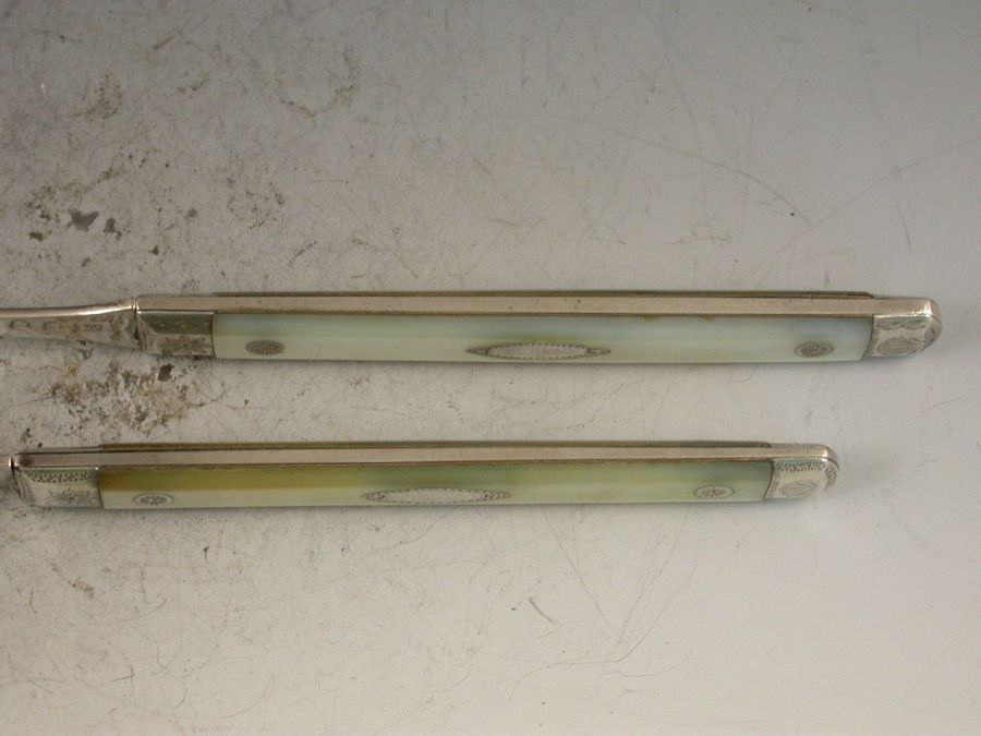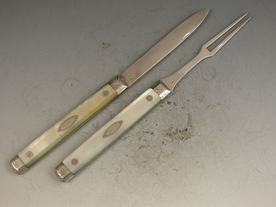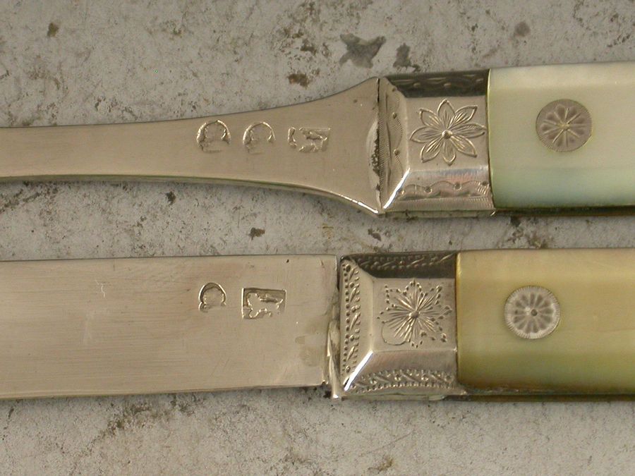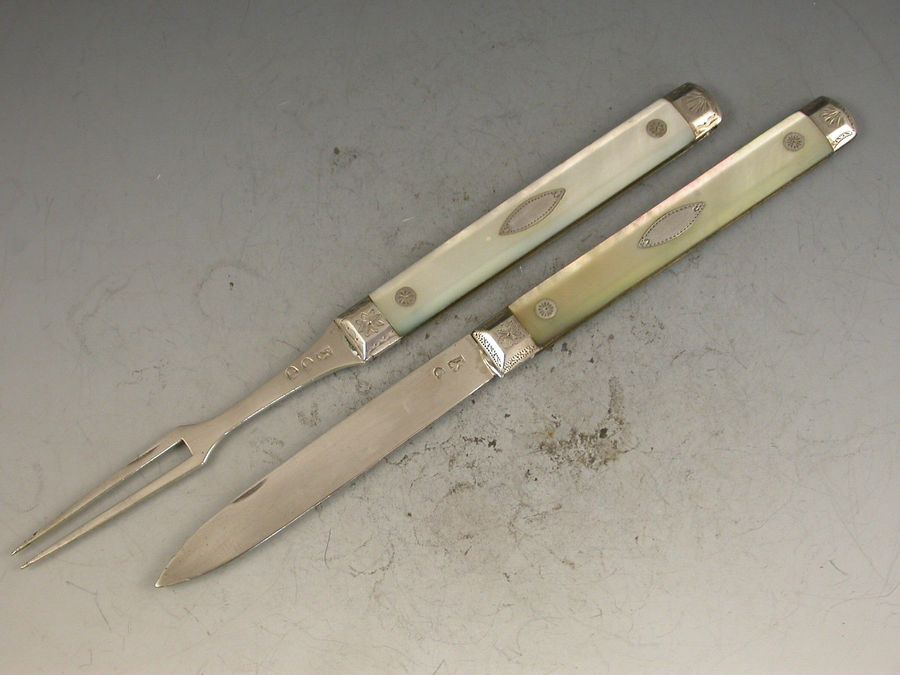 Pair George III Cased Silver & Mother of Pearl Folding Fruit Knife & Fork - Double Duty Mark