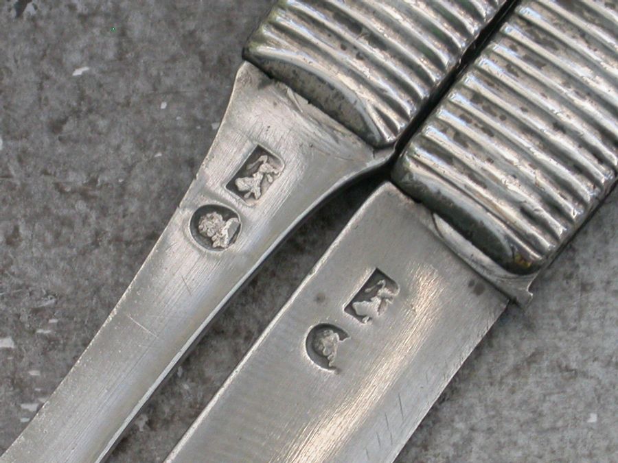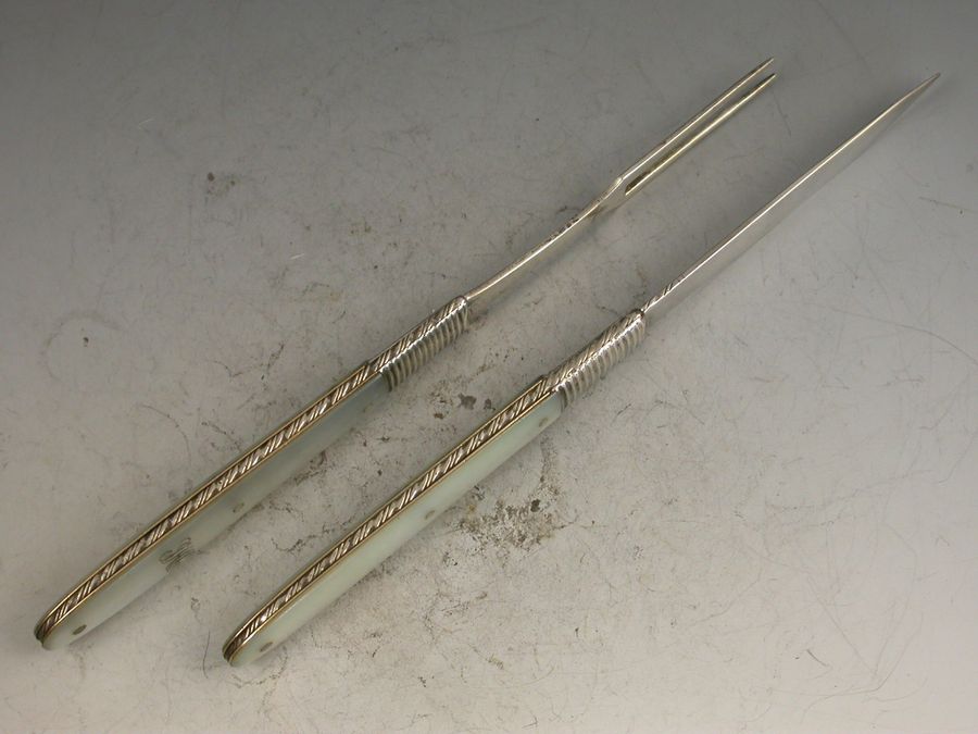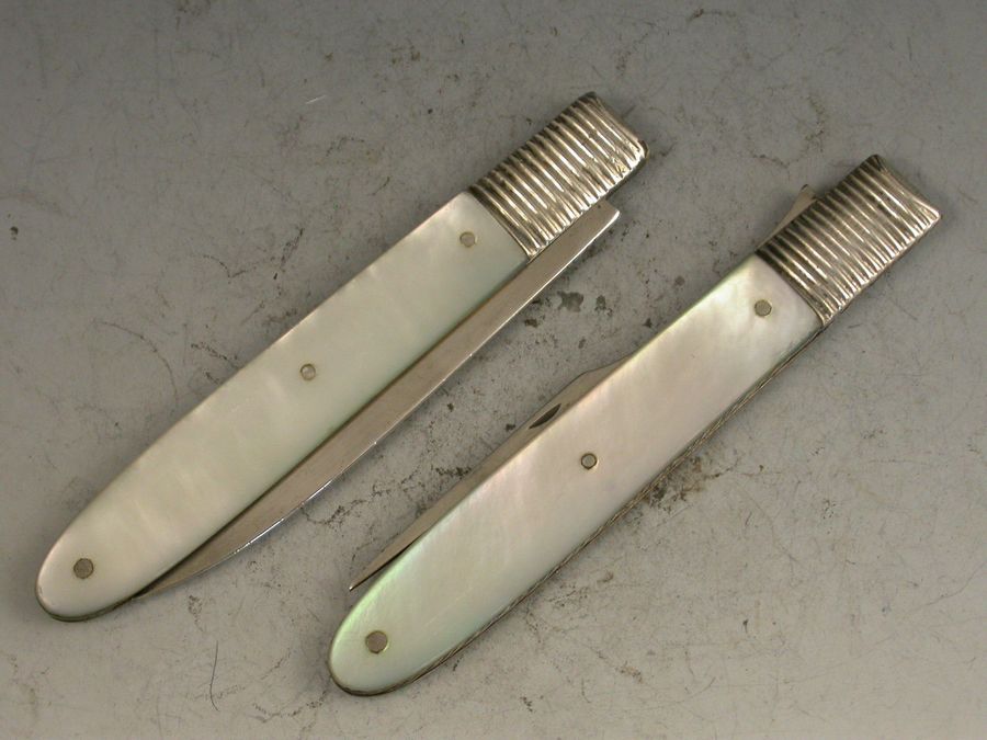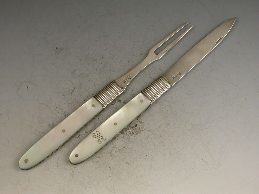 Pair George III Cased Silver & Mother of Pearl Folding Fruit Knife & Fork