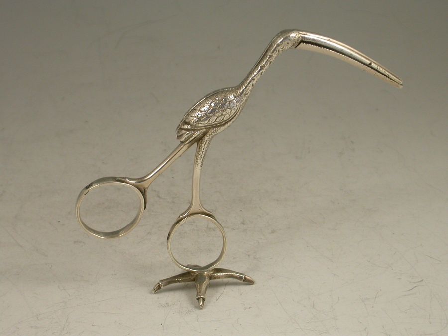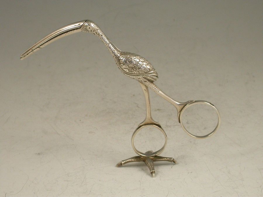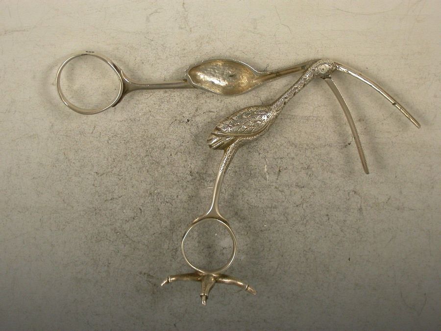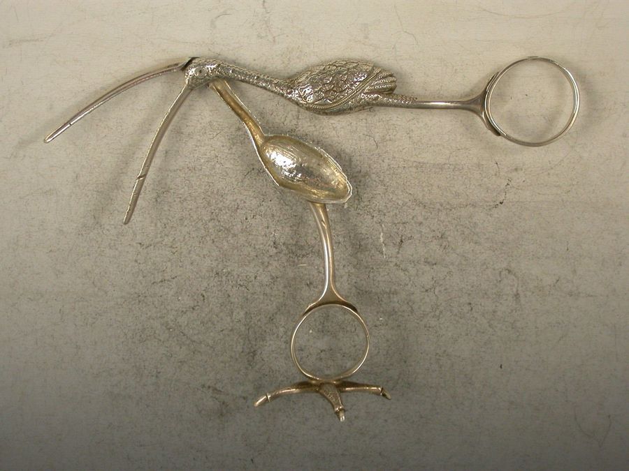 A good pair of George III cast silver Ribbon Threaders made in the form of a Stork, standing on a four claw foot.