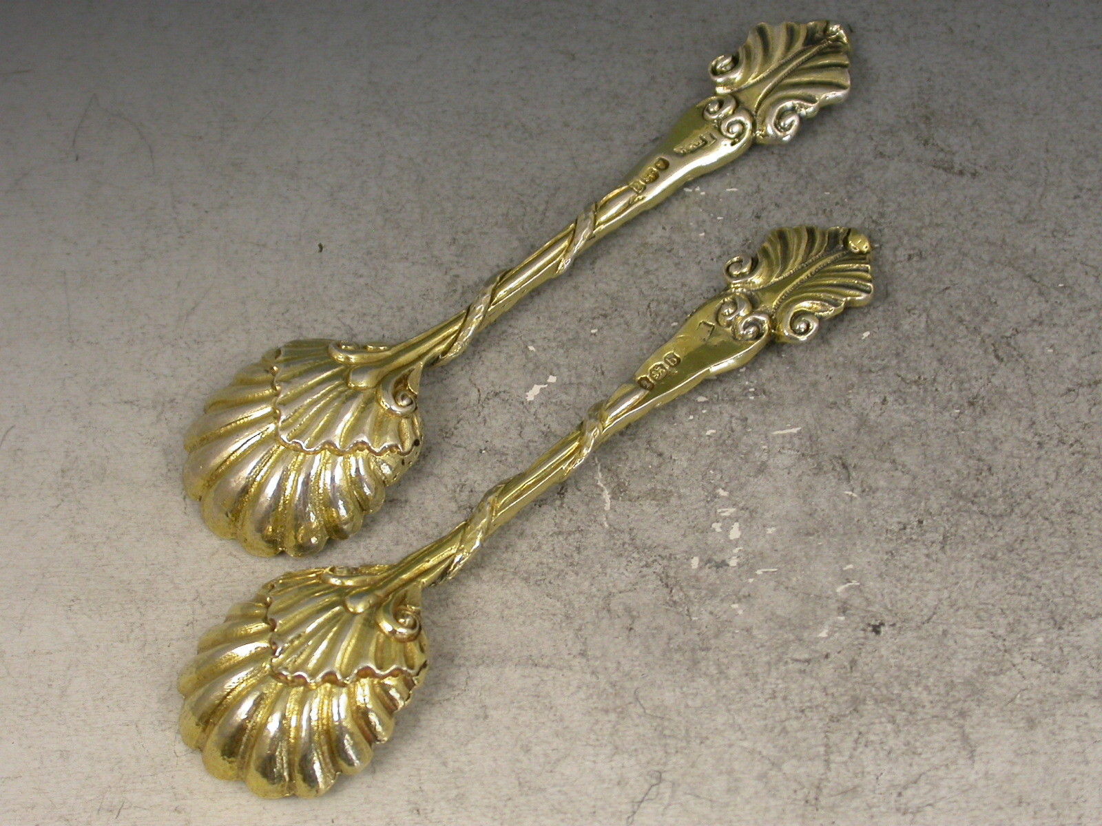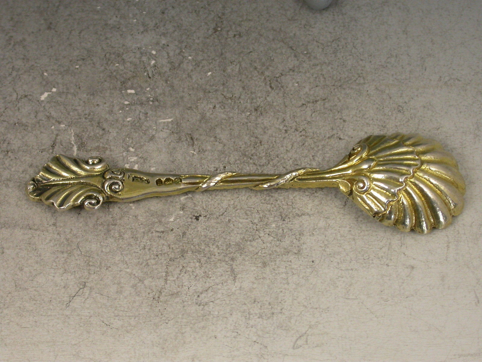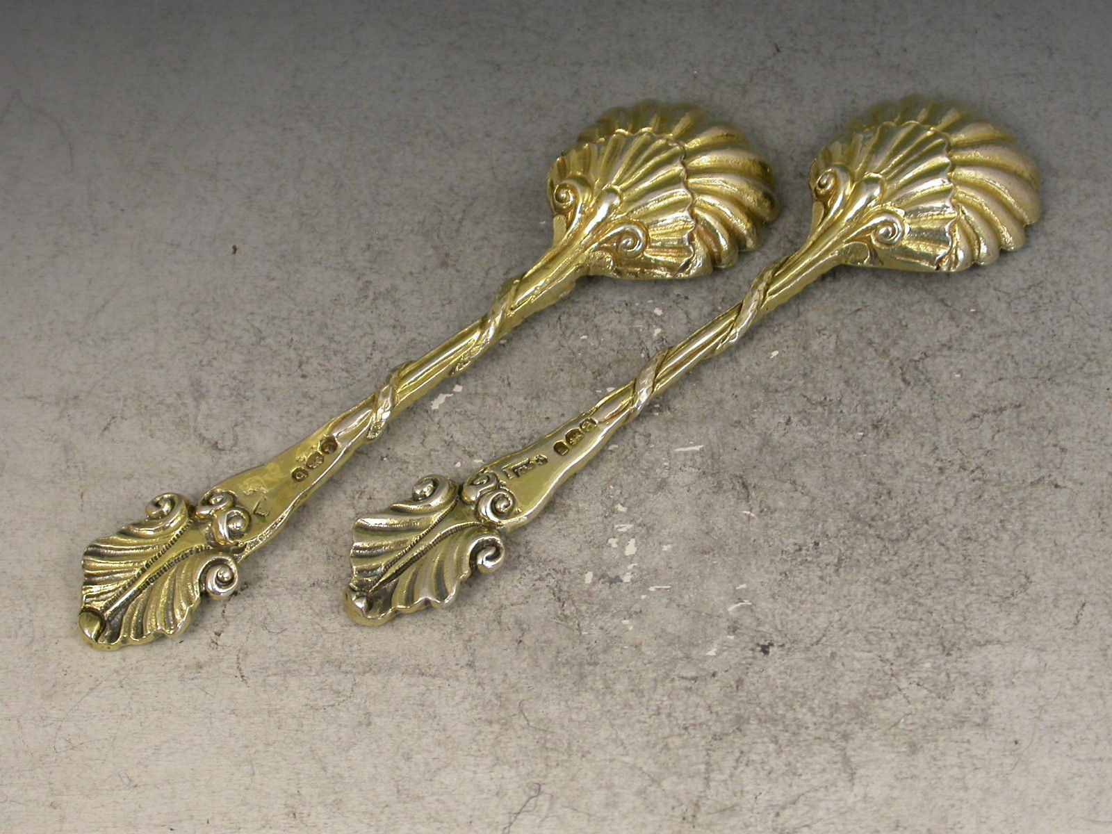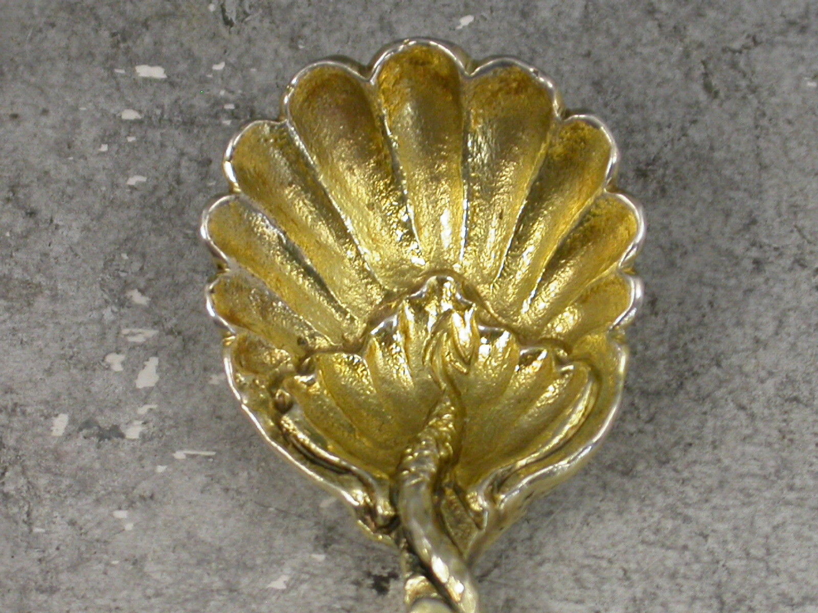 A pair of very fine quality George III cast silver gilt Salt Spoons, with fluted shell shaped bowls and mask head terminals to the handles, a serpent entwined around the handle stems.