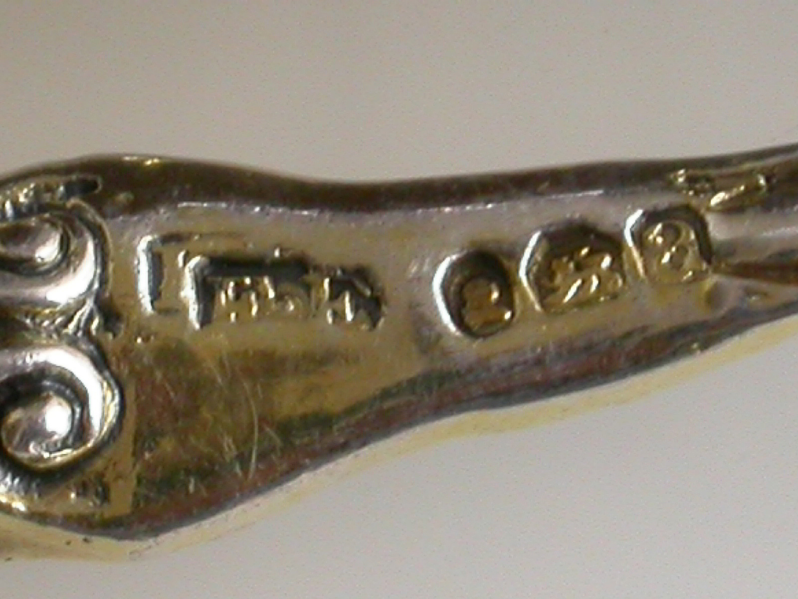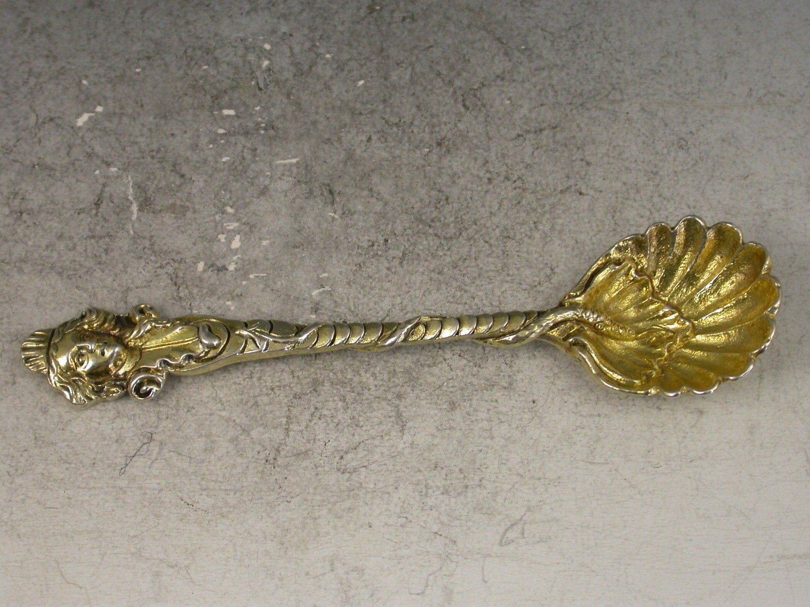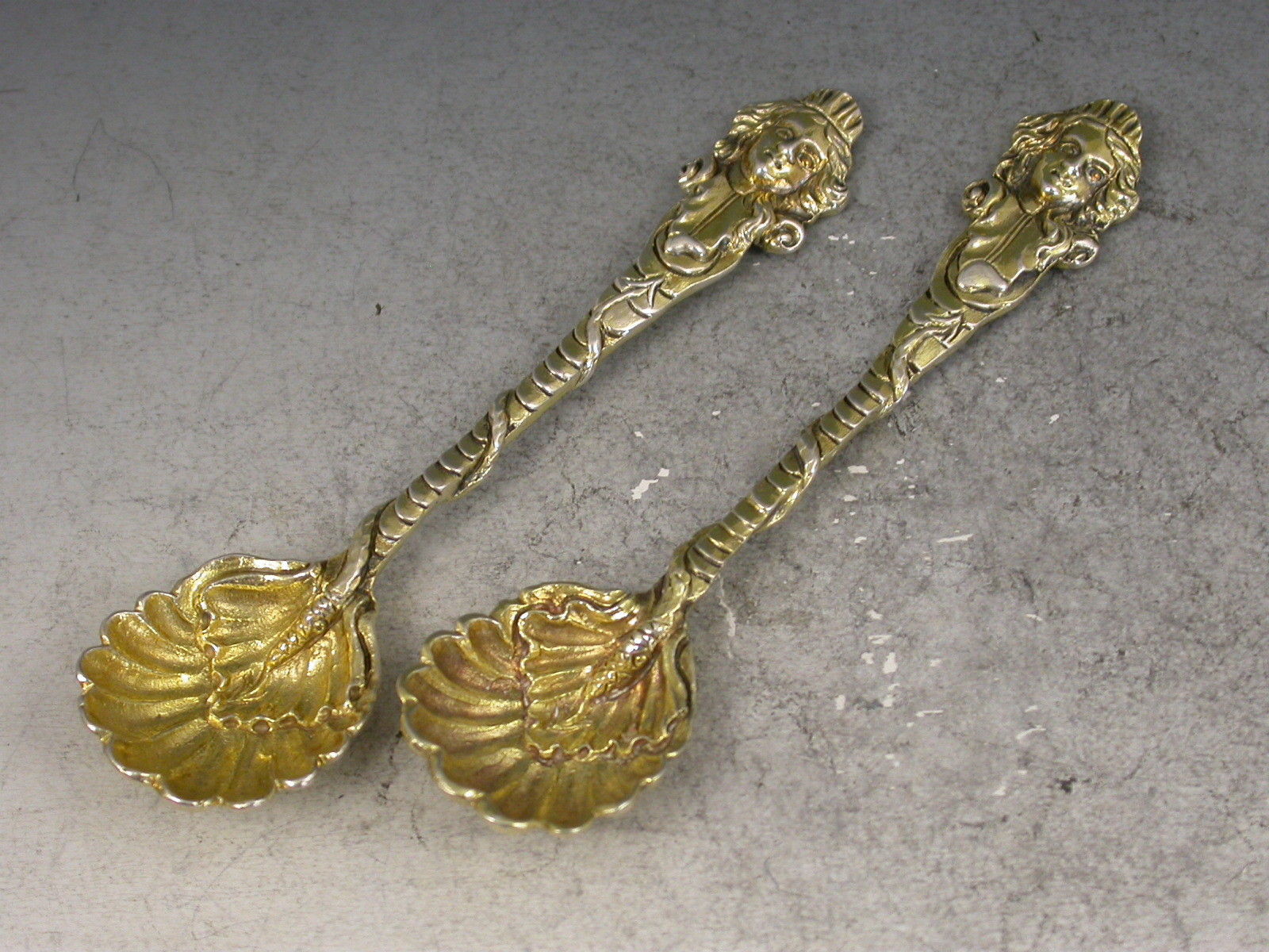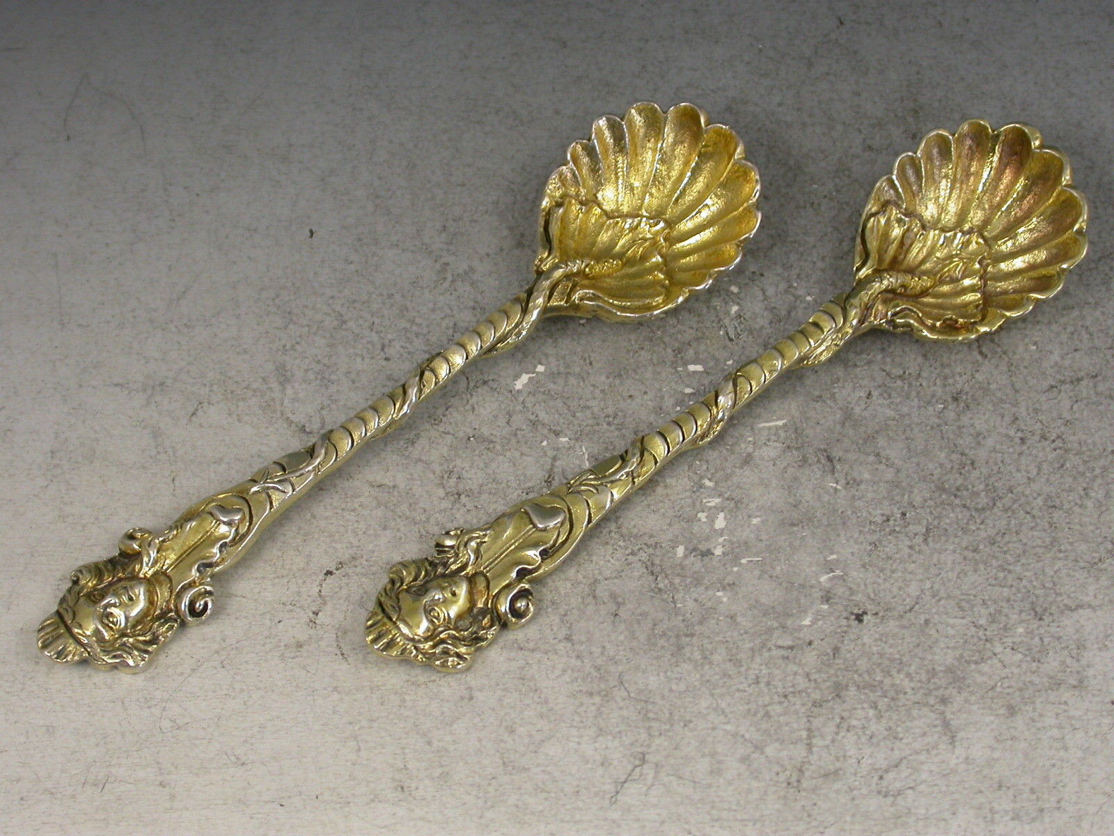 Pair George III Cast Silver Gilt Mask Head & Serpent Salt Spoons