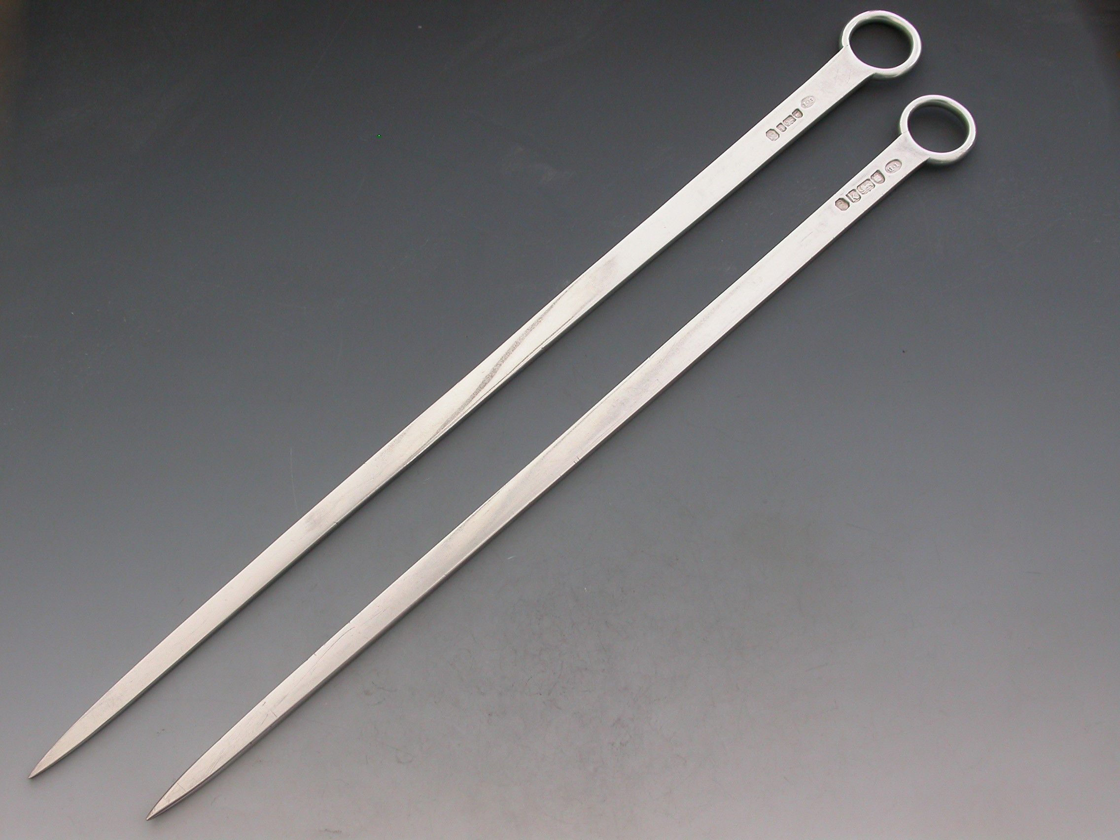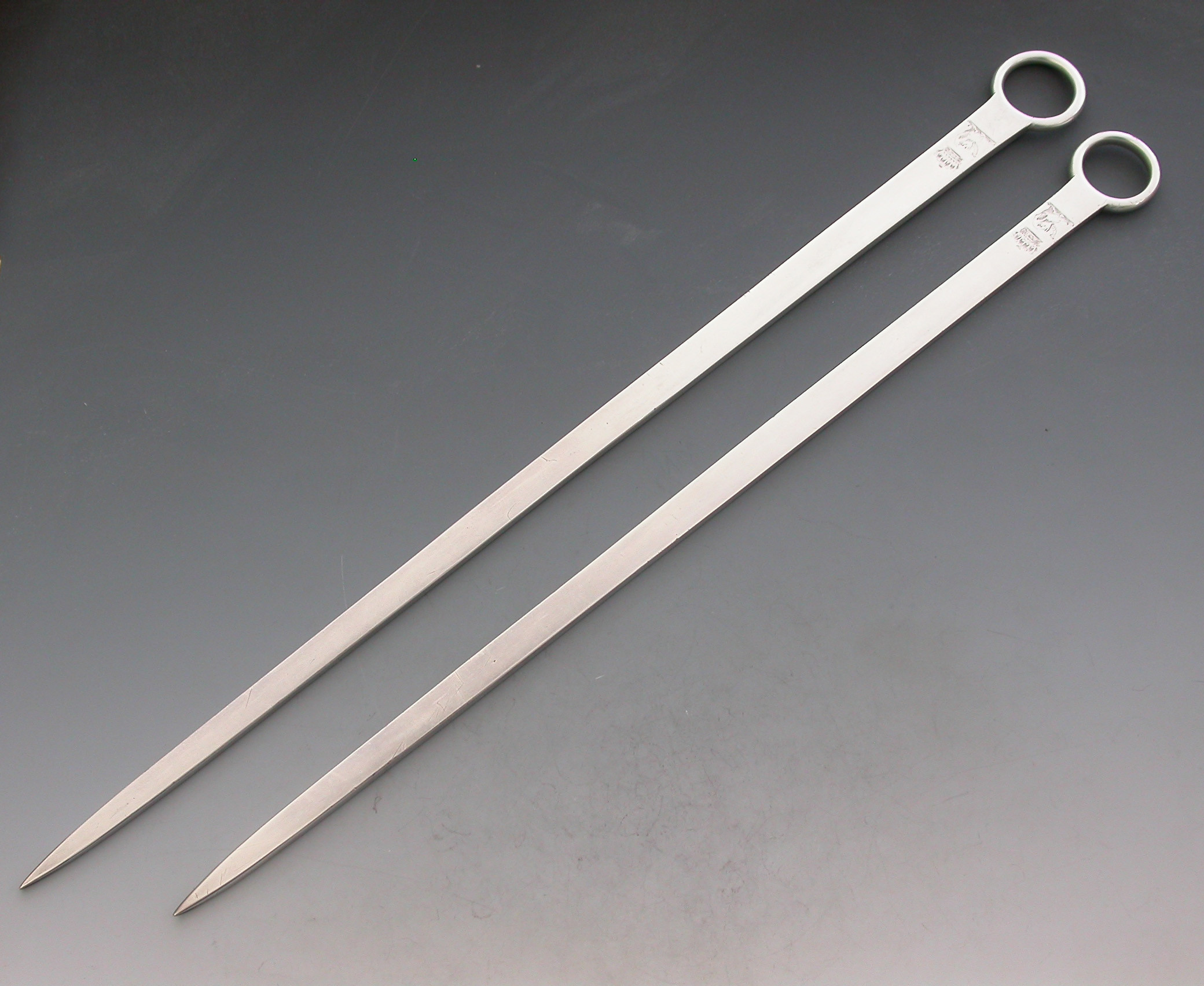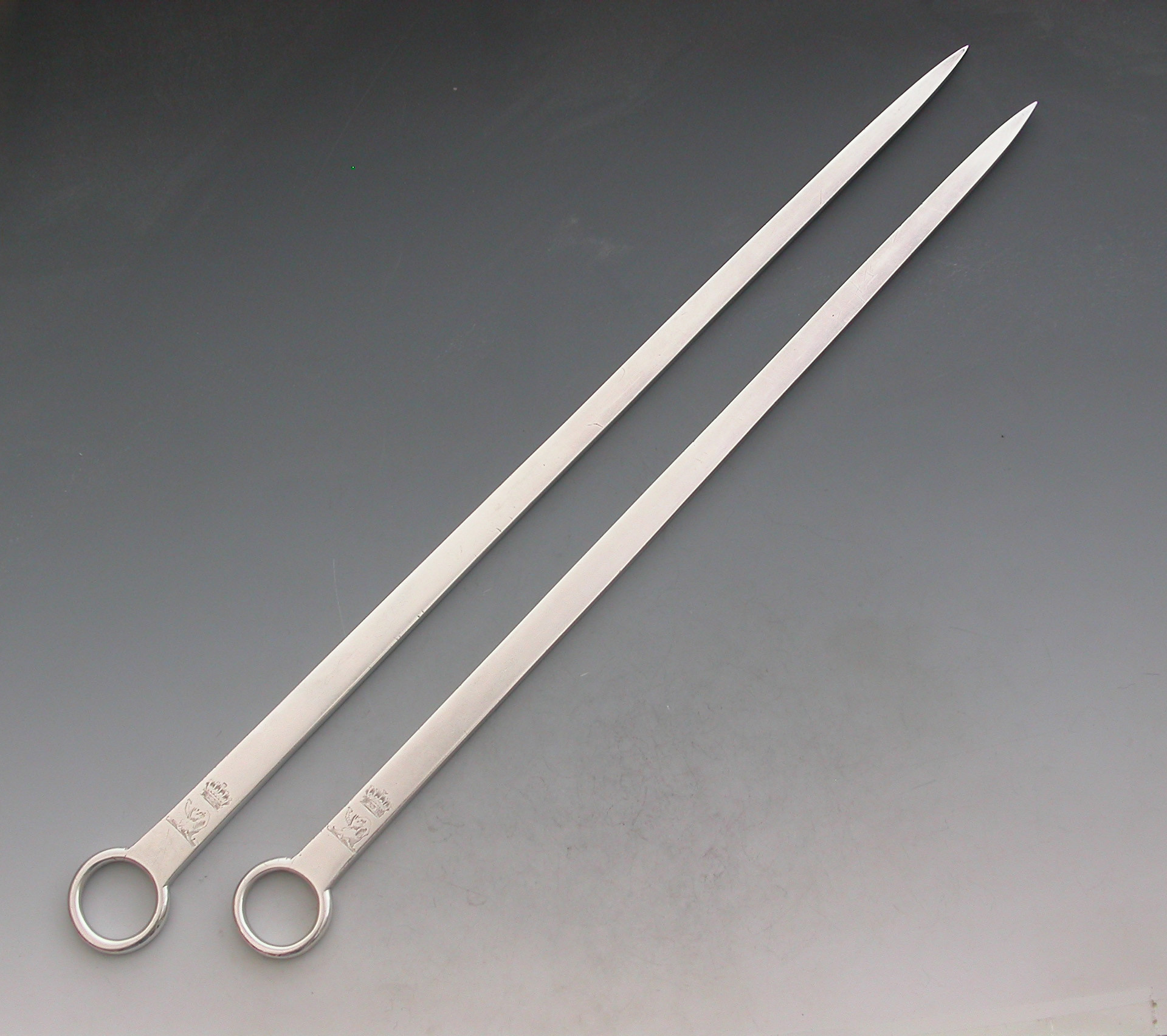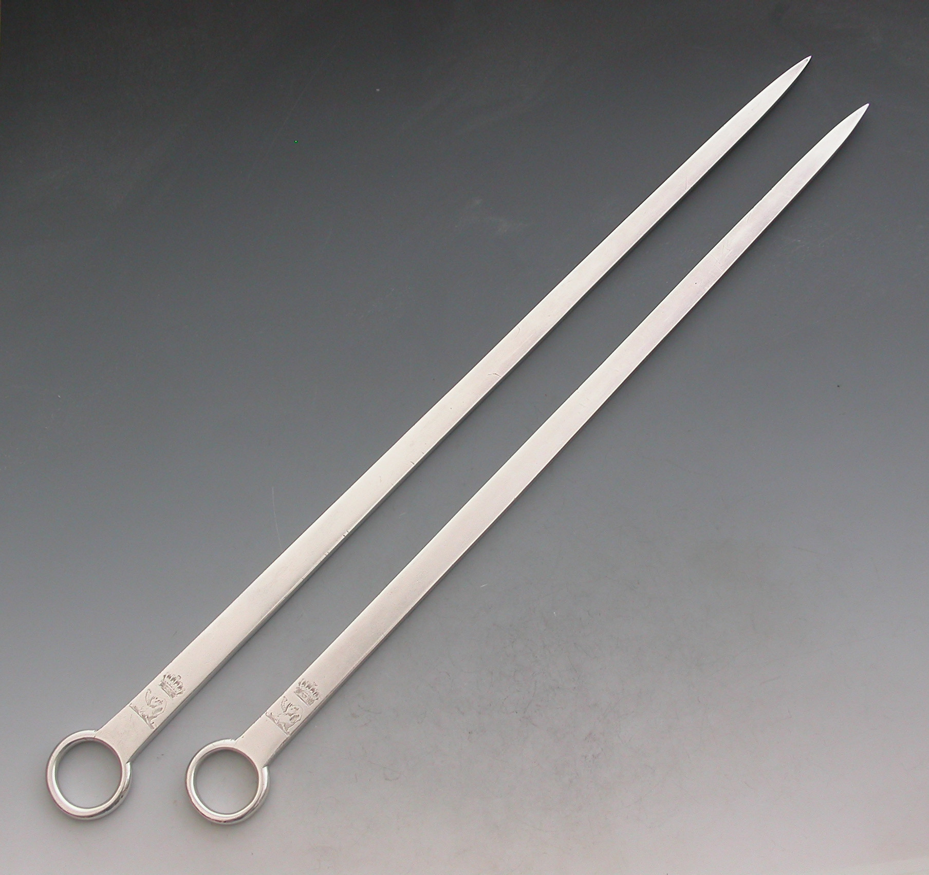 A very nice quality and heavy gauge pair of 18th century George III graduated silver Meat Skewers with plain ring handles. The blades engraved with Earls coronets and crests of elephants heads erased.