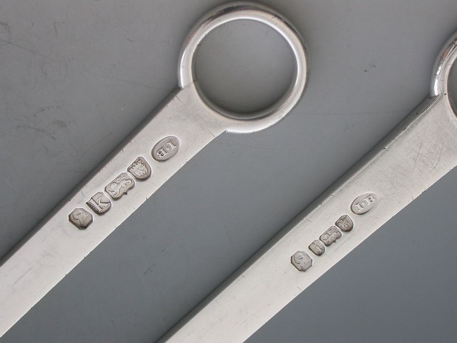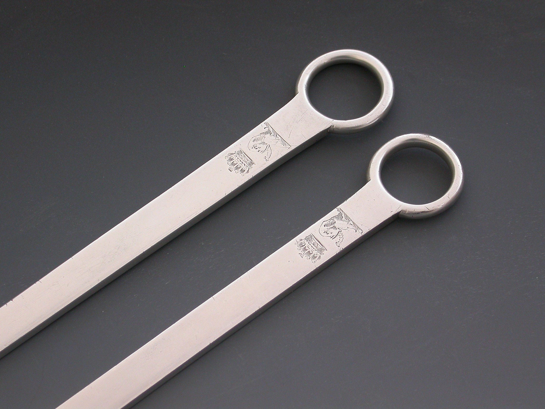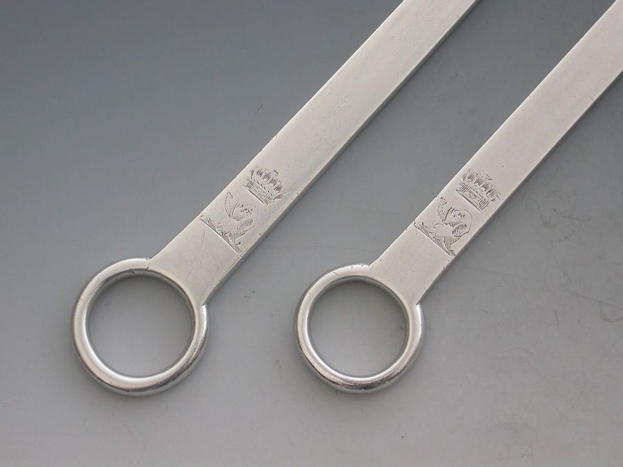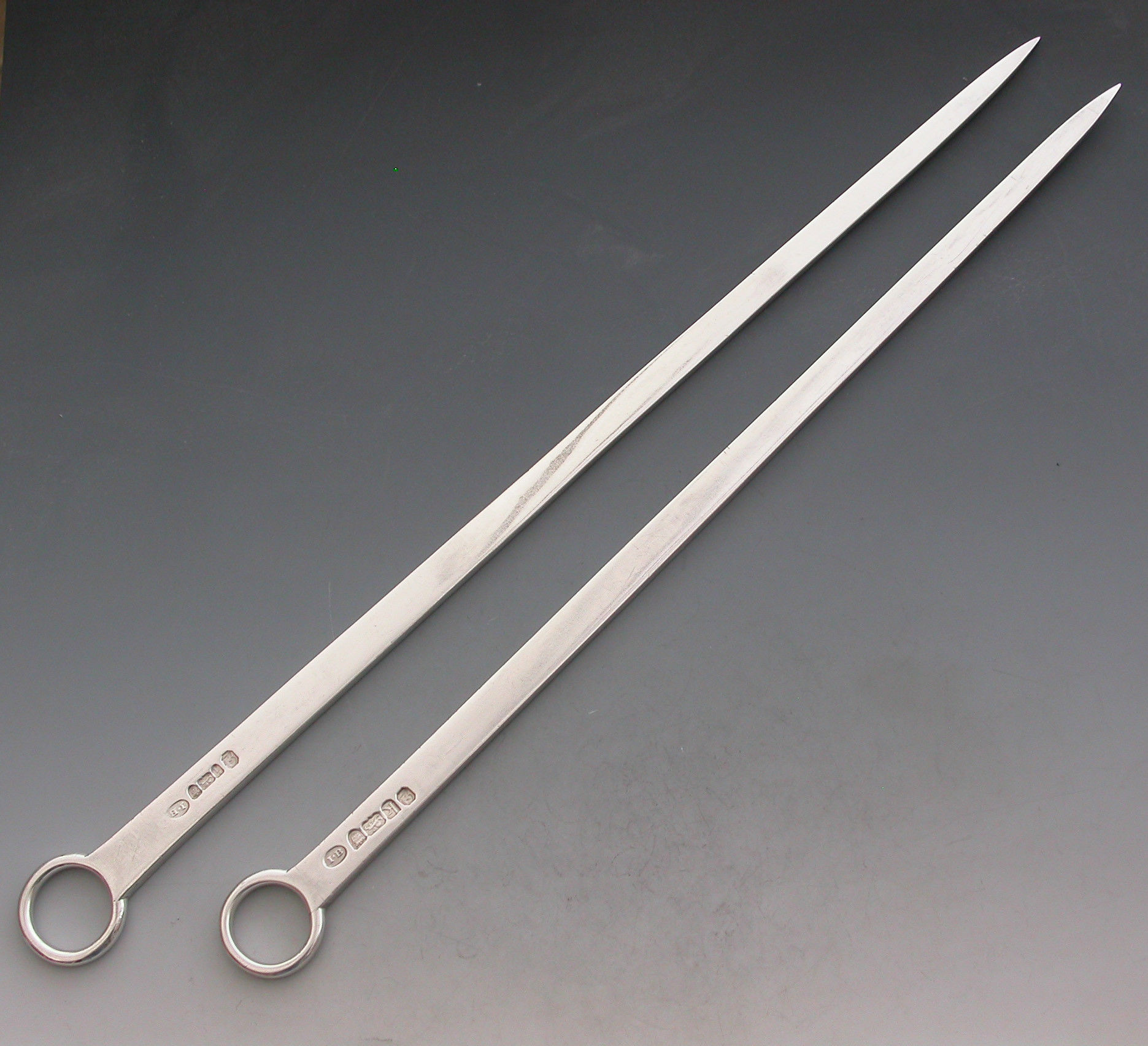 A very nice quality and heavy gauge pair of 18th century George III graduated silver Meat Skewers with plain ring handles. The blades engraved with Earls coronets and crests of elephants heads erased.