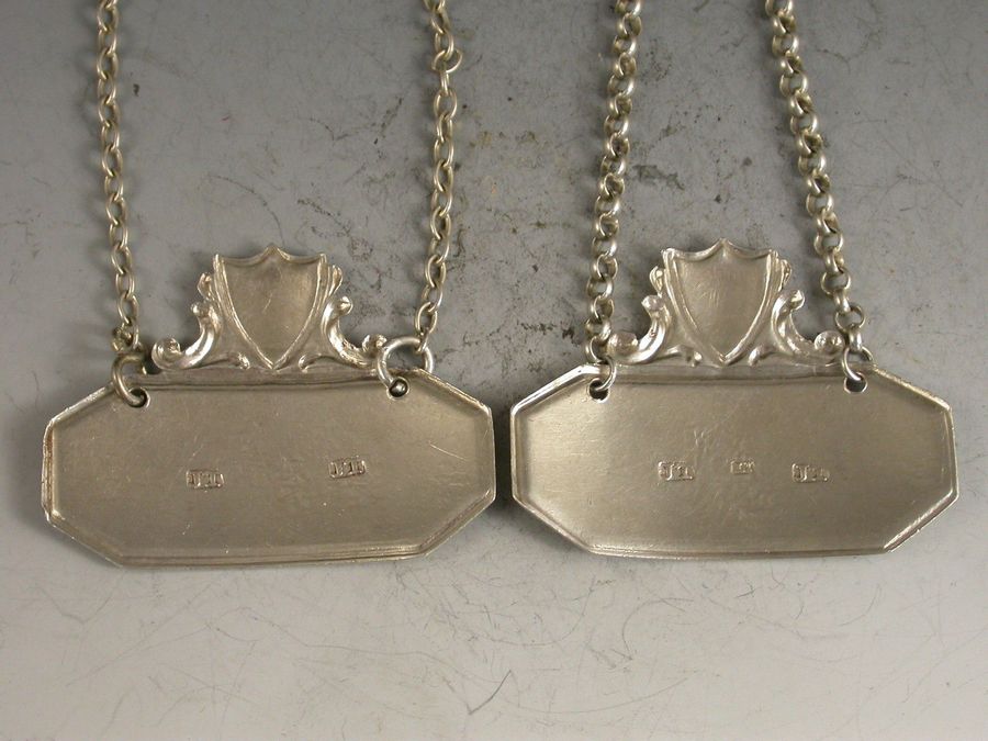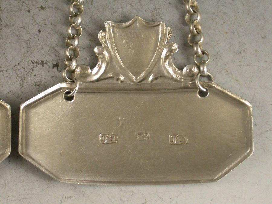 A good pair of George III Irish silver Wine Labels of cut-cornered rectangular form with vacant shield shaped surmounts supported by scrolls, incised for Hock and Vin de Grave