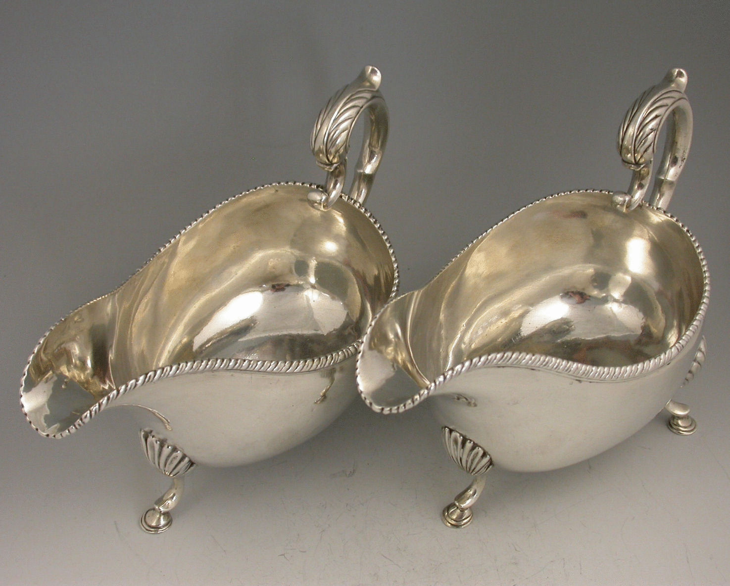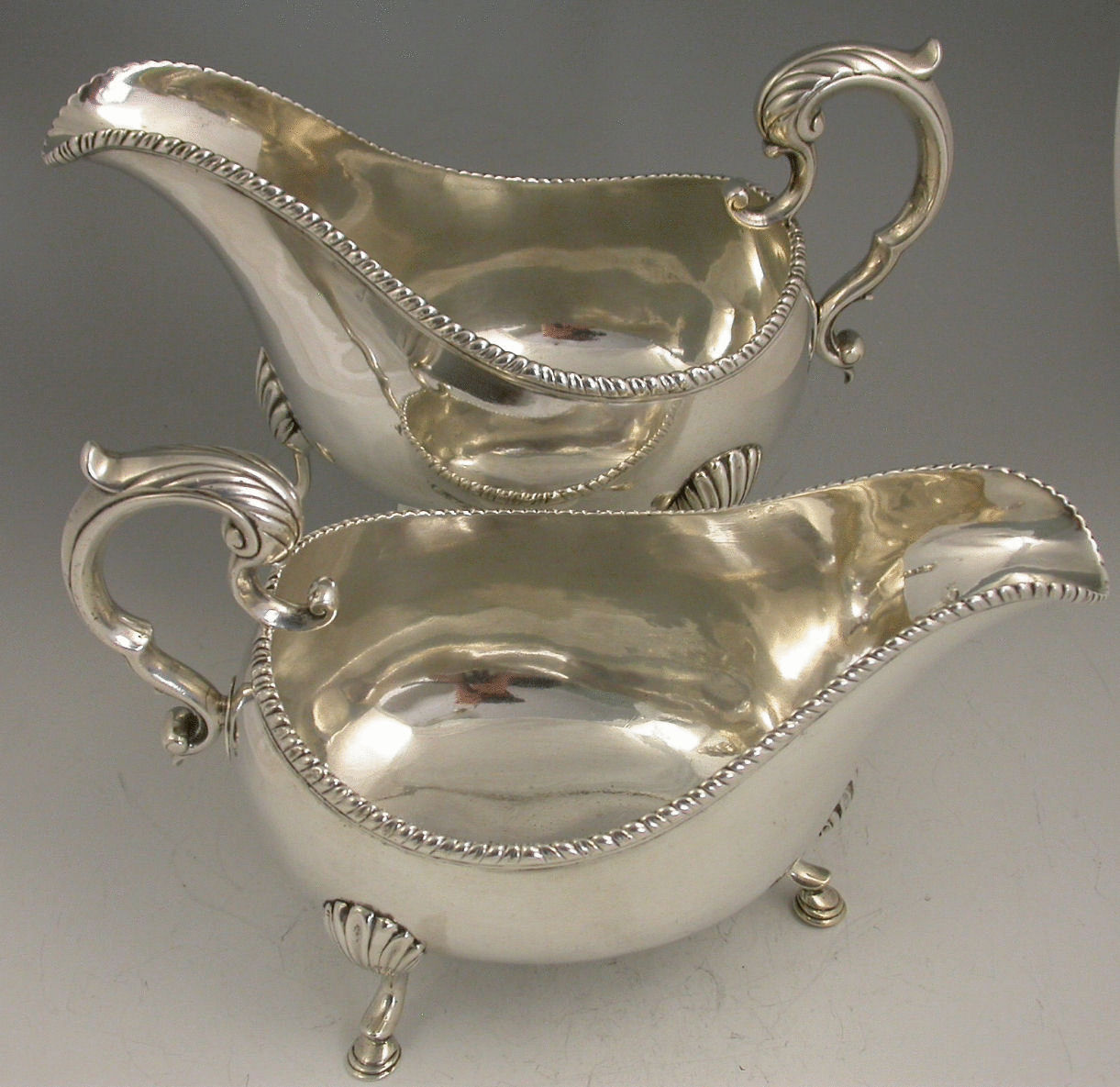 A good pair of George III large Irish Sauce Boats, the plain bodies with gadrooned rims and leaf capped scroll handles, standing on three hoof feet.