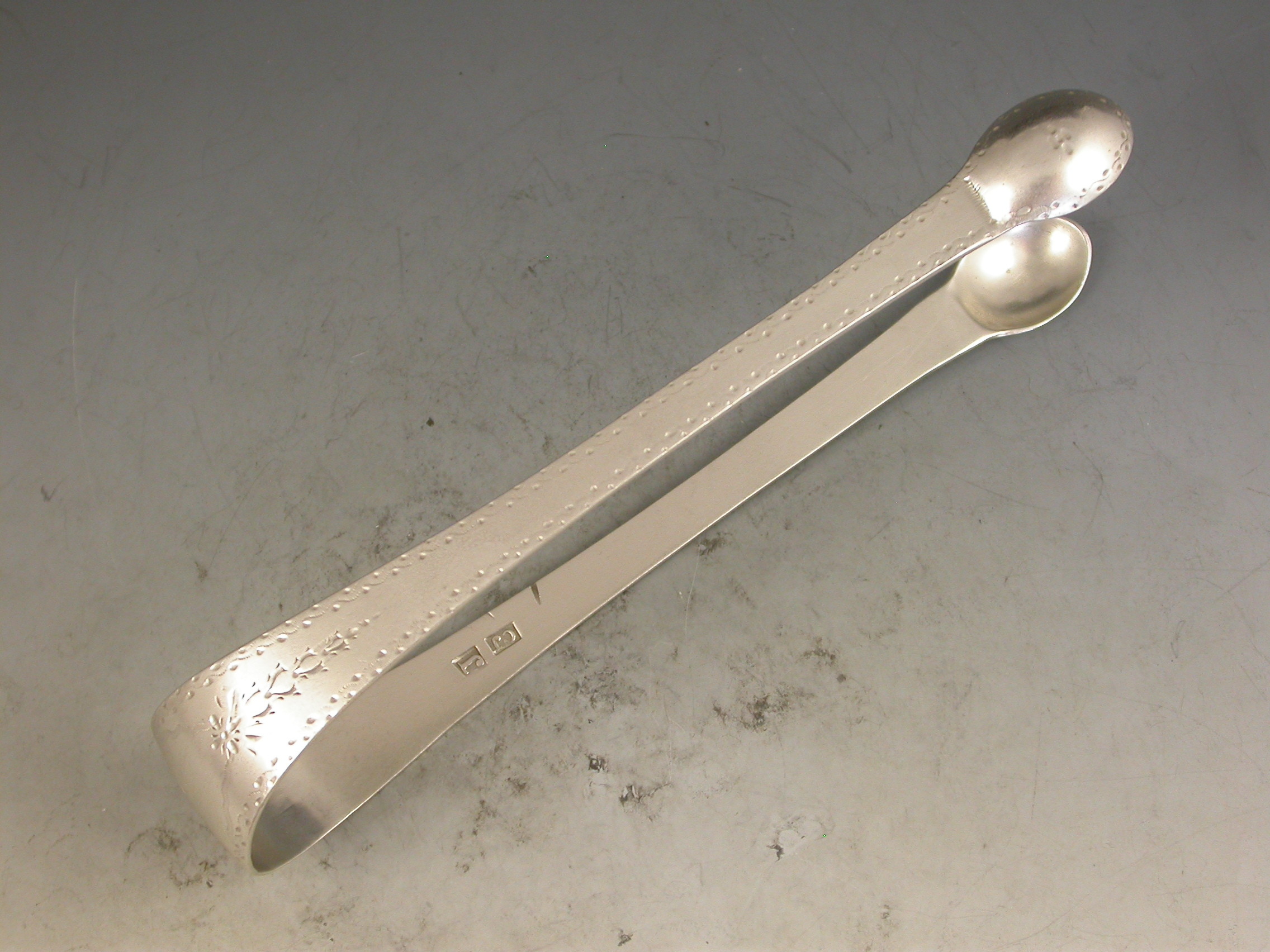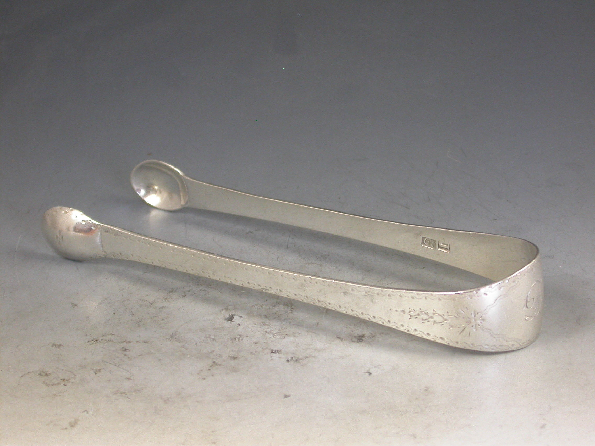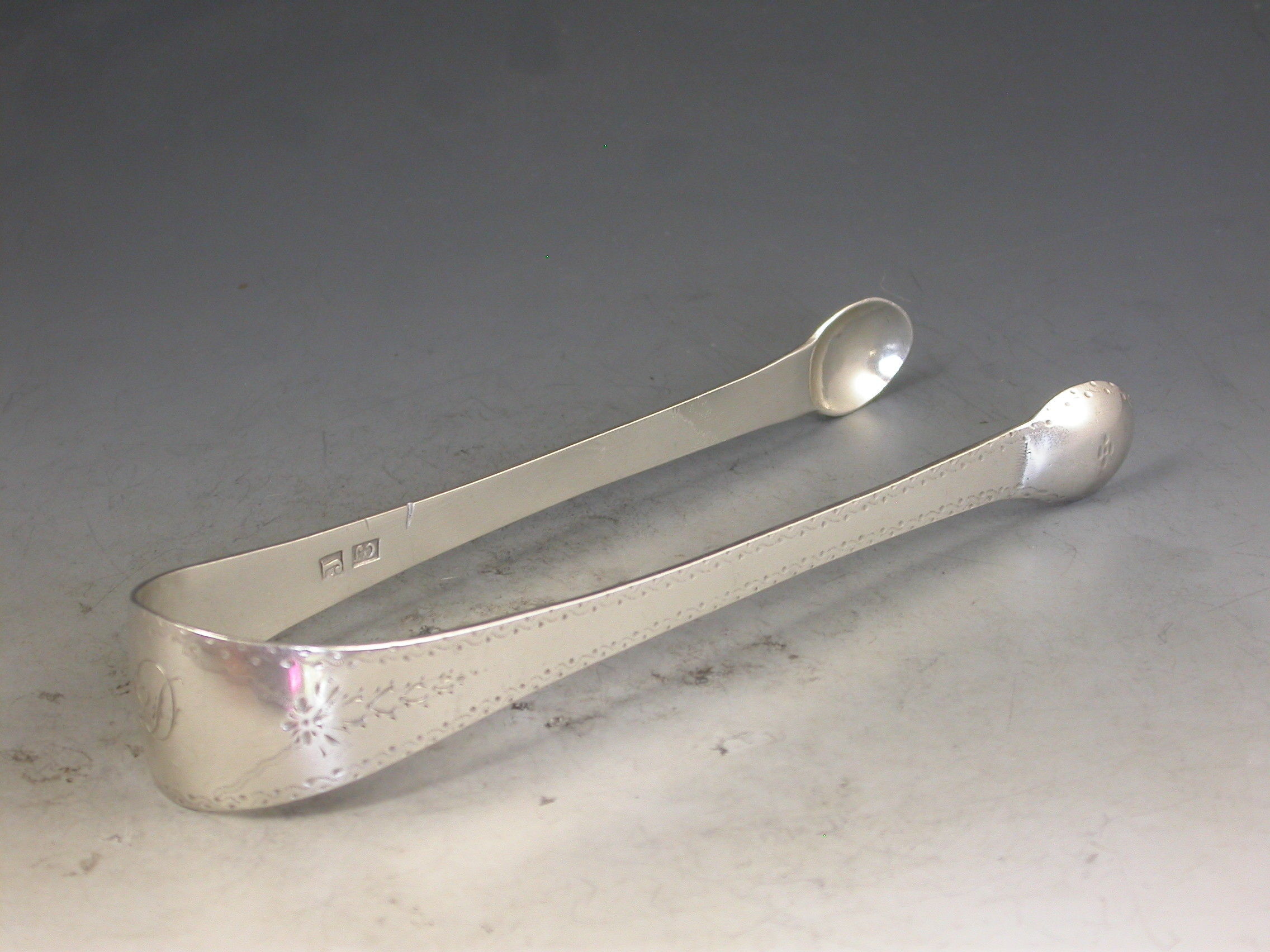 A rare pair of George III Scottish Provincial silver Sugar Tongs, the Old English pattern handles with bright-cut engraved decoration and a contemporary initial 'D' inside a cartouche to the bow.