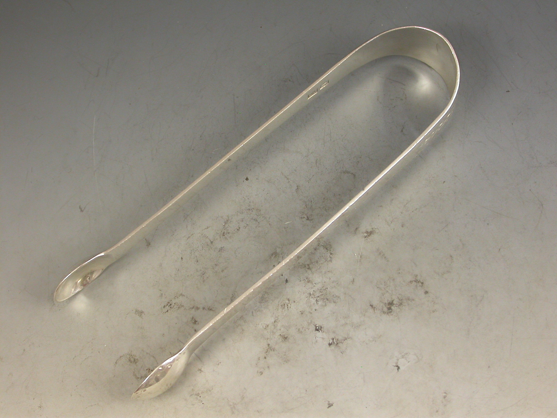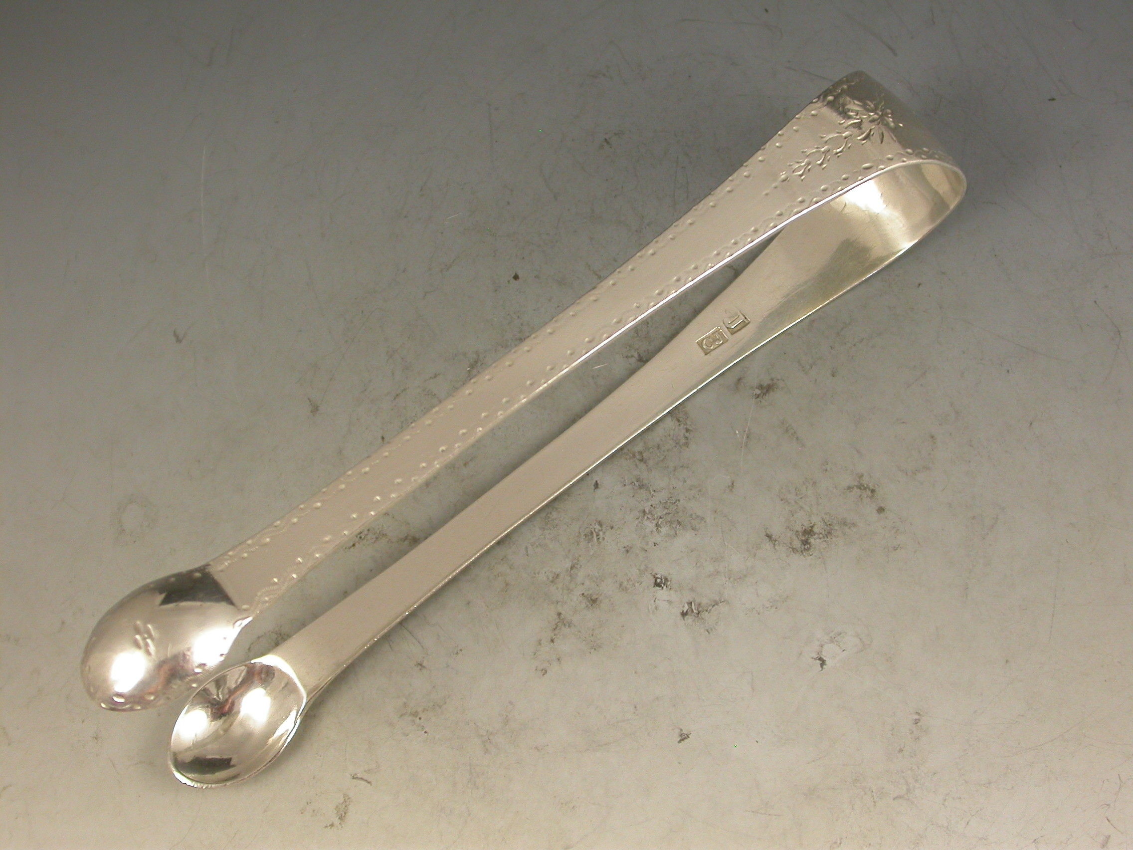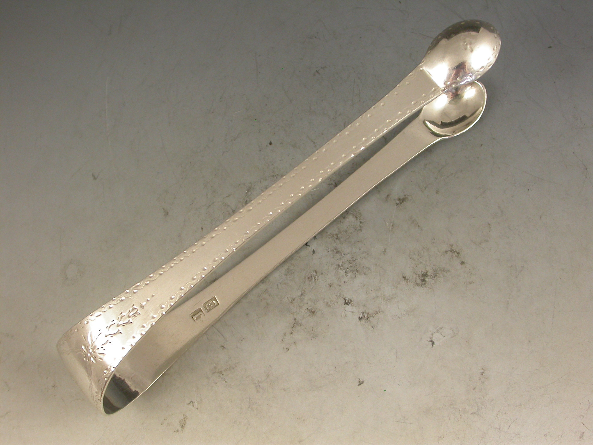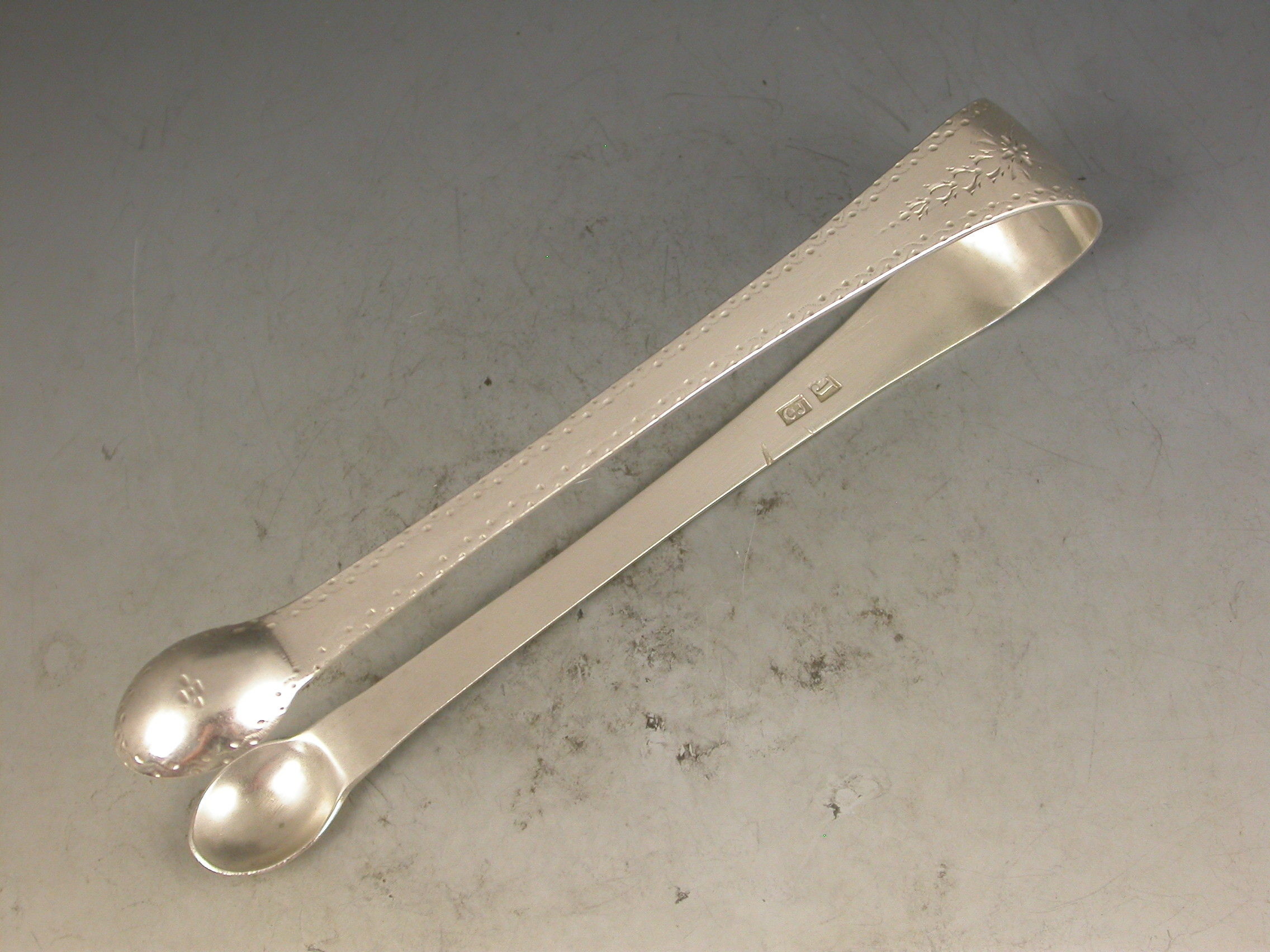 A rare pair of George III Scottish Provincial silver Sugar Tongs, the Old English pattern handles with bright-cut engraved decoration and a contemporary initial 'D' inside a cartouche to the bow.