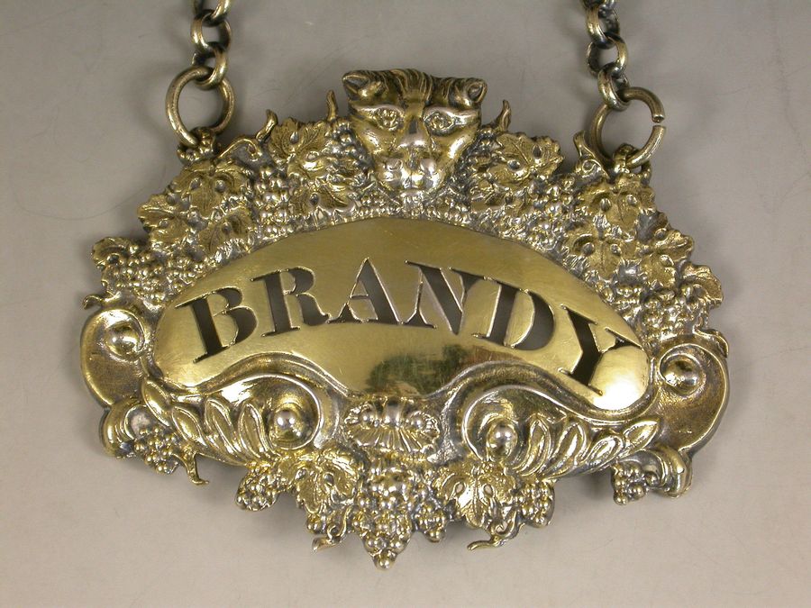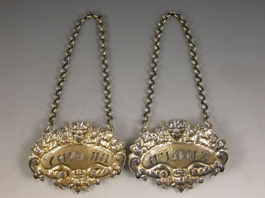 A good quality pair of George III die-stamped silver gilt Wine Labels of shaped cartouche form with border of vine leaves, grapes and tendrils surmounted by a central leopards head above a down turned plain name plates pierced for Brandy and Shrub.