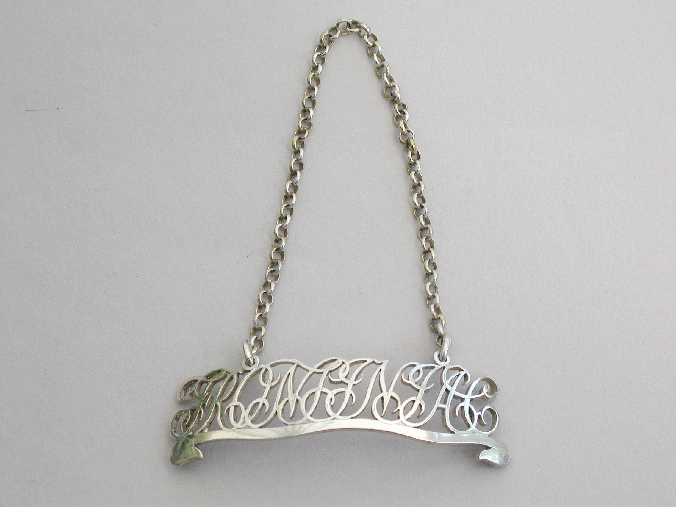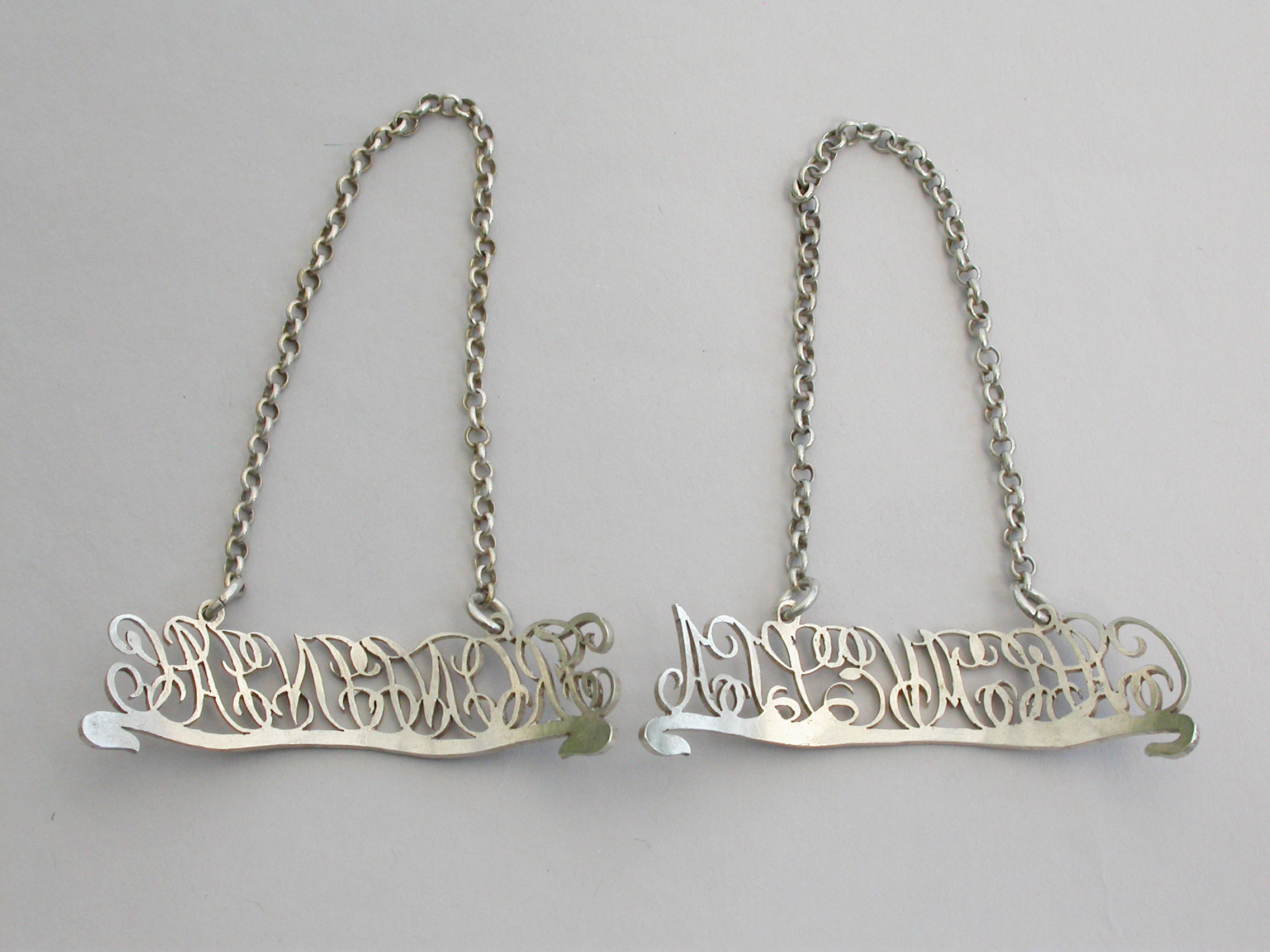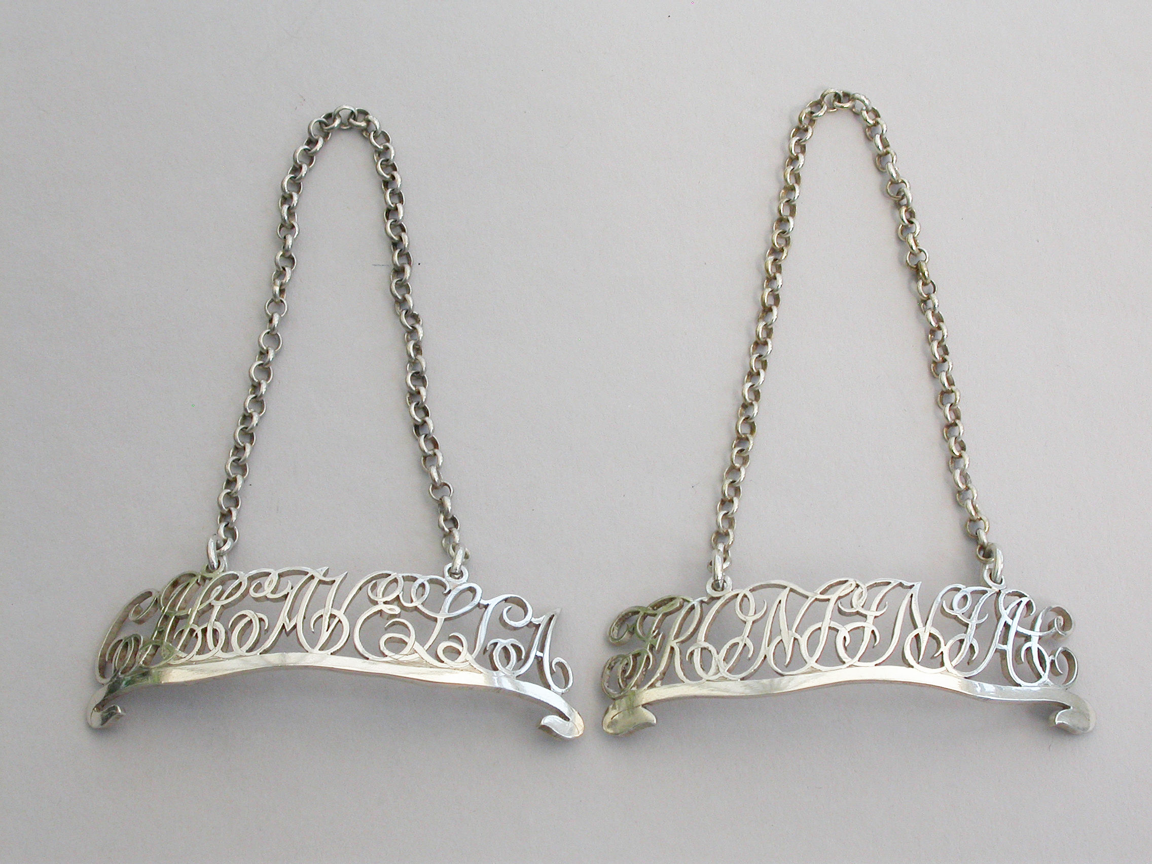 Pair George III Silver Script Cut-Out Word Wine Labels 'Calcavella & Frontiniac'