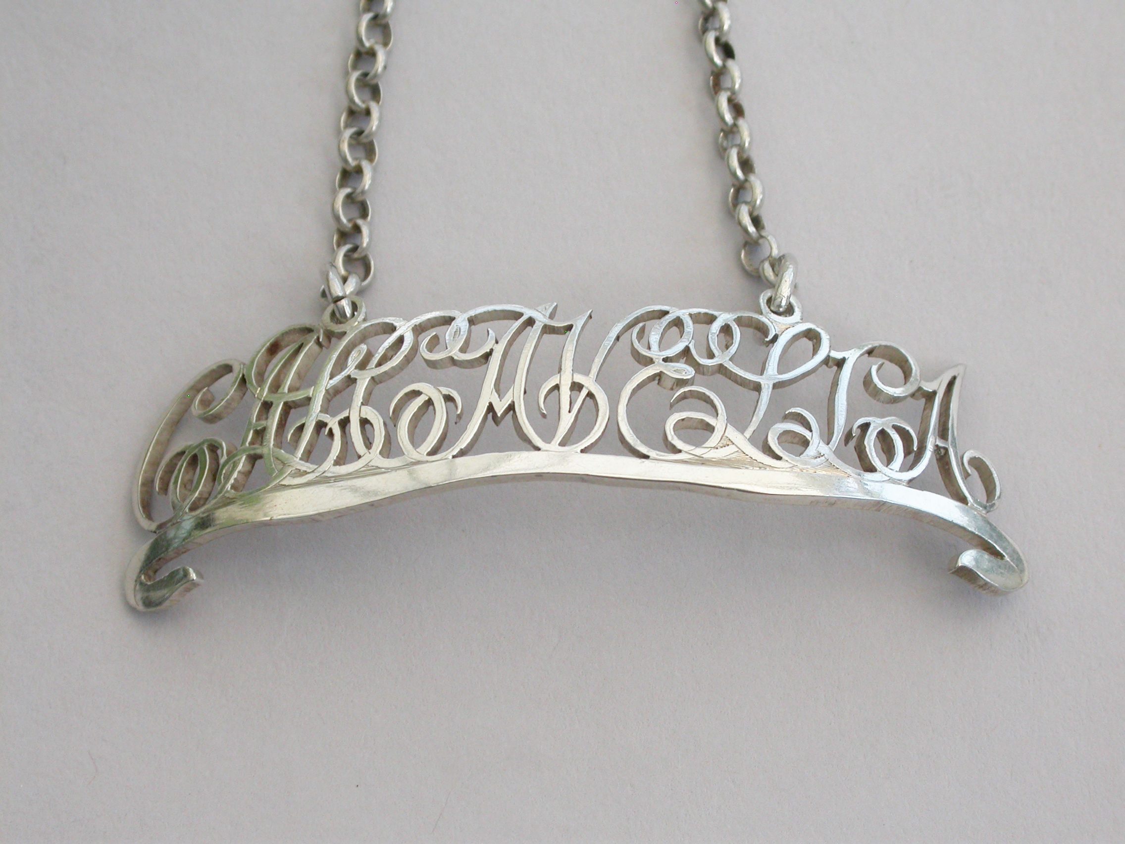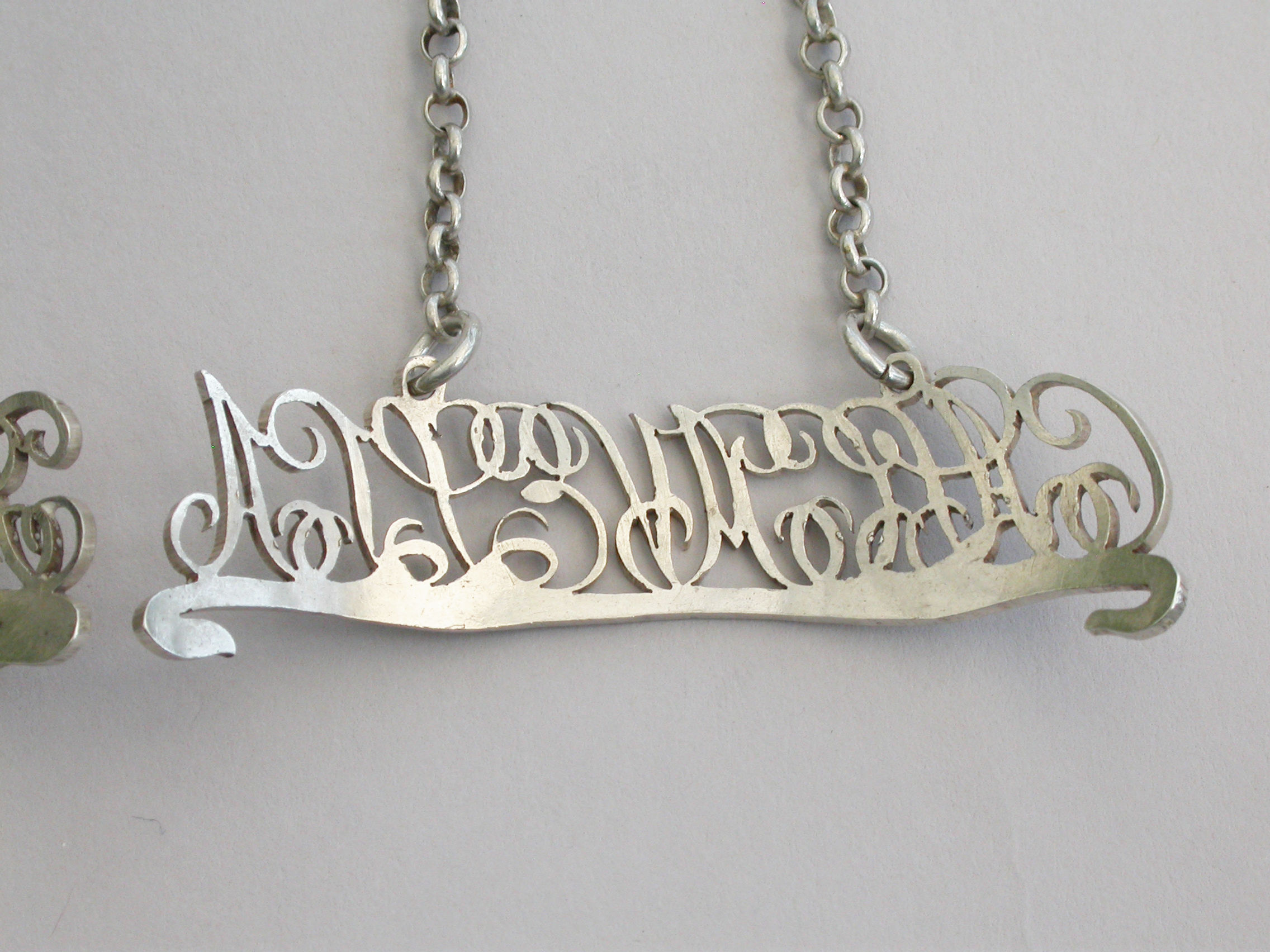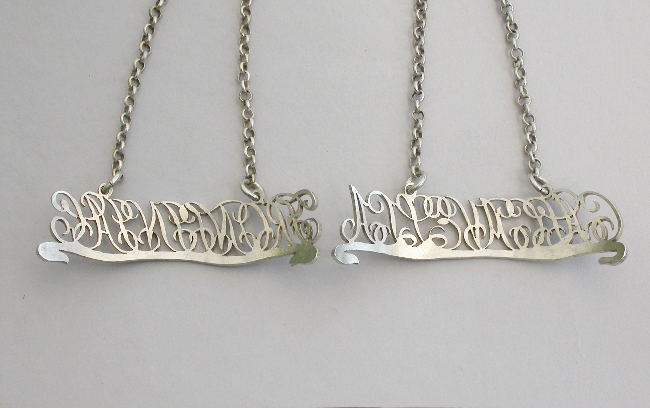 Pair George III Silver Script Cut-Out Word Wine Labels 'Calcavella & Frontiniac'
