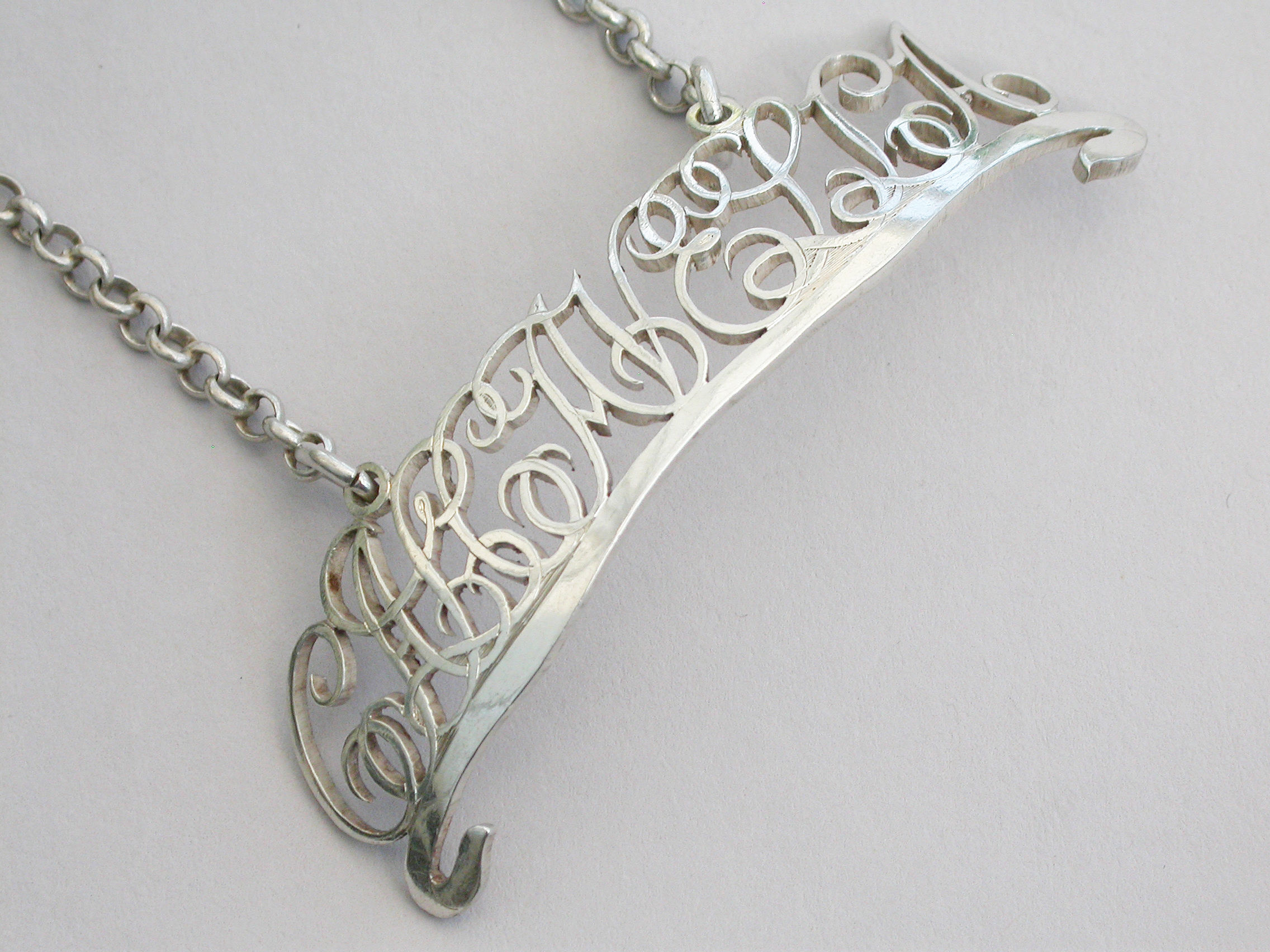 A rare and unusual pair of 18th century silver script cut-out word Wine Labels, for Calcavella and Frontiniac.