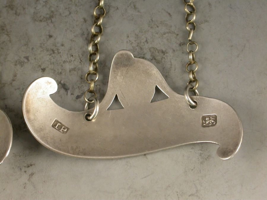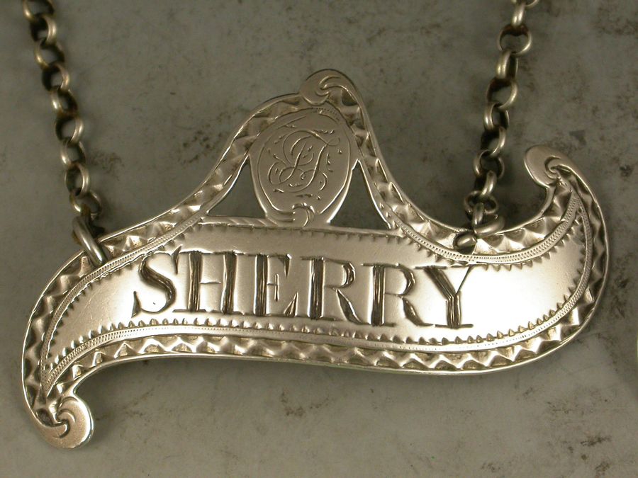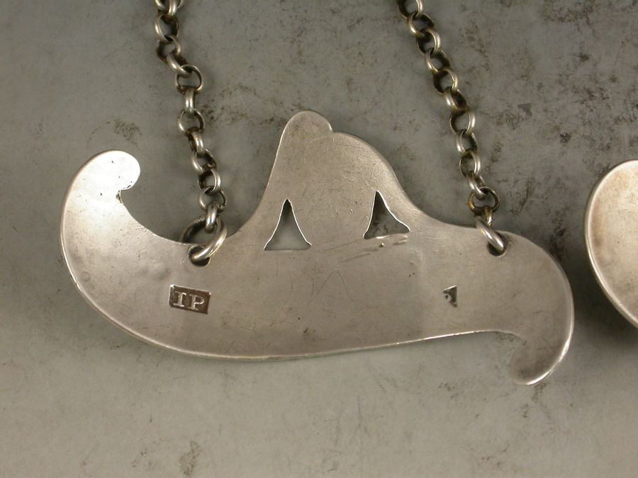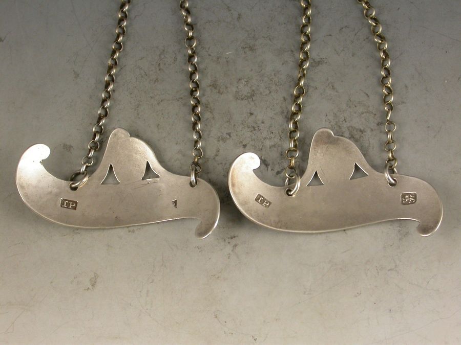 Pair George III Silver Scroll Shaped Wine Labels 'Sherry & Port'