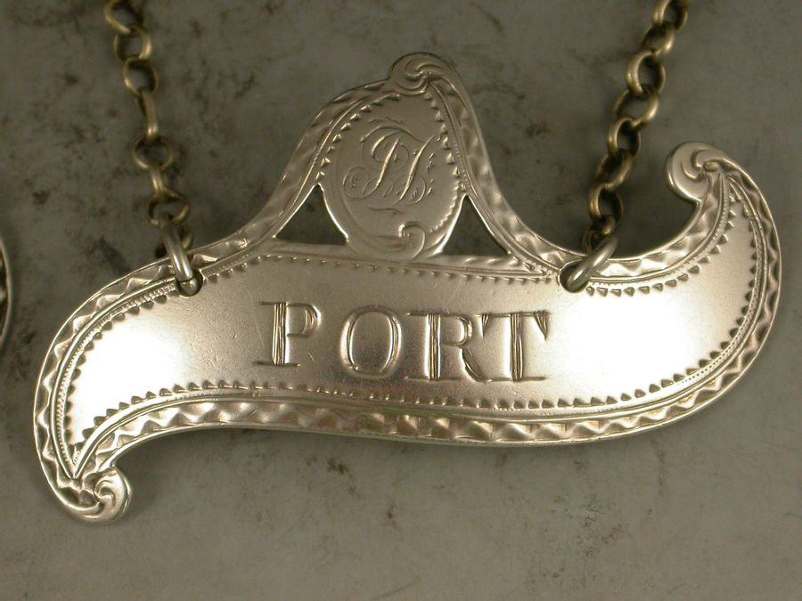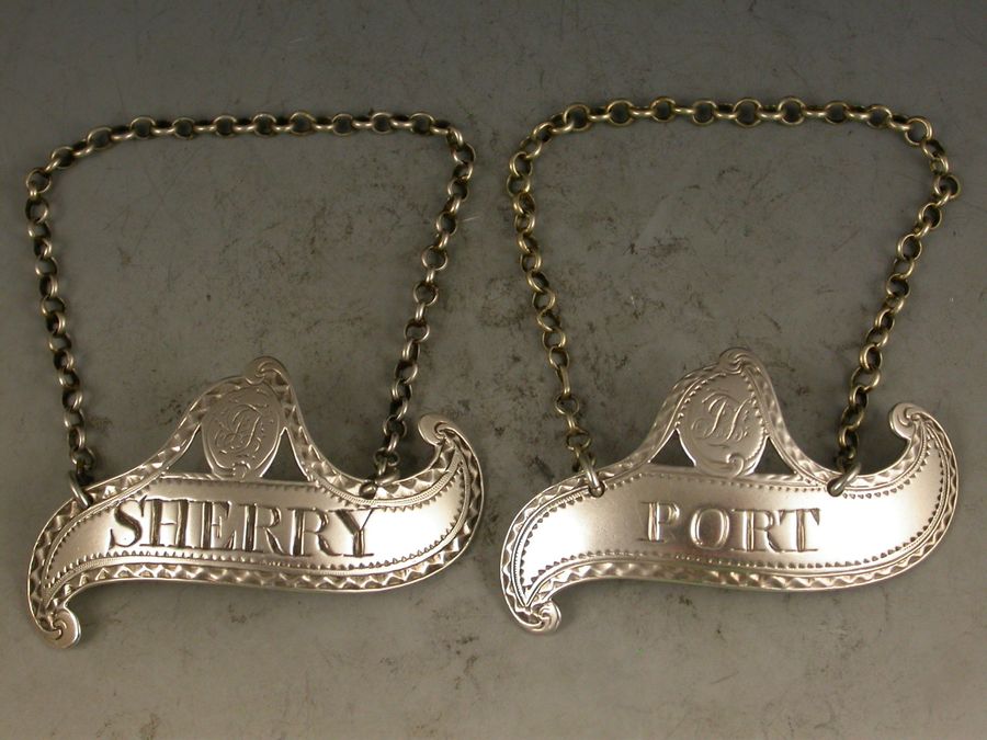 A fine pair of George III silver Wine Labels of scroll form with oval shield shaped surmounts supported by swags and engraved with contemporary initials, bright-cut engraved borders, incised for Sherry and Port.