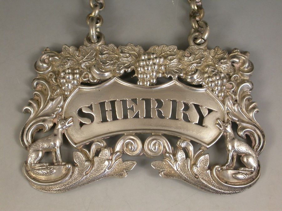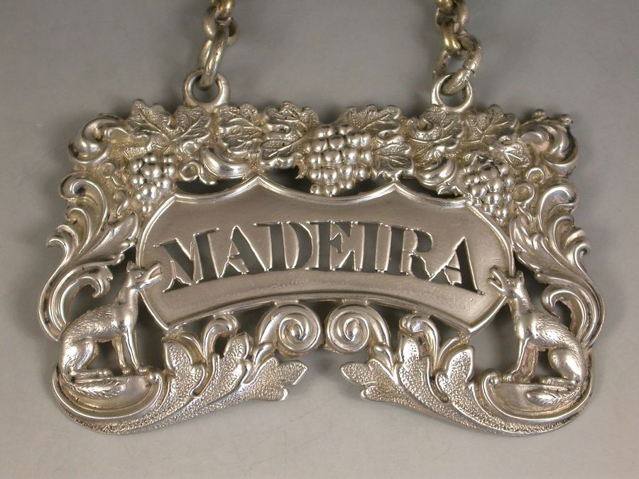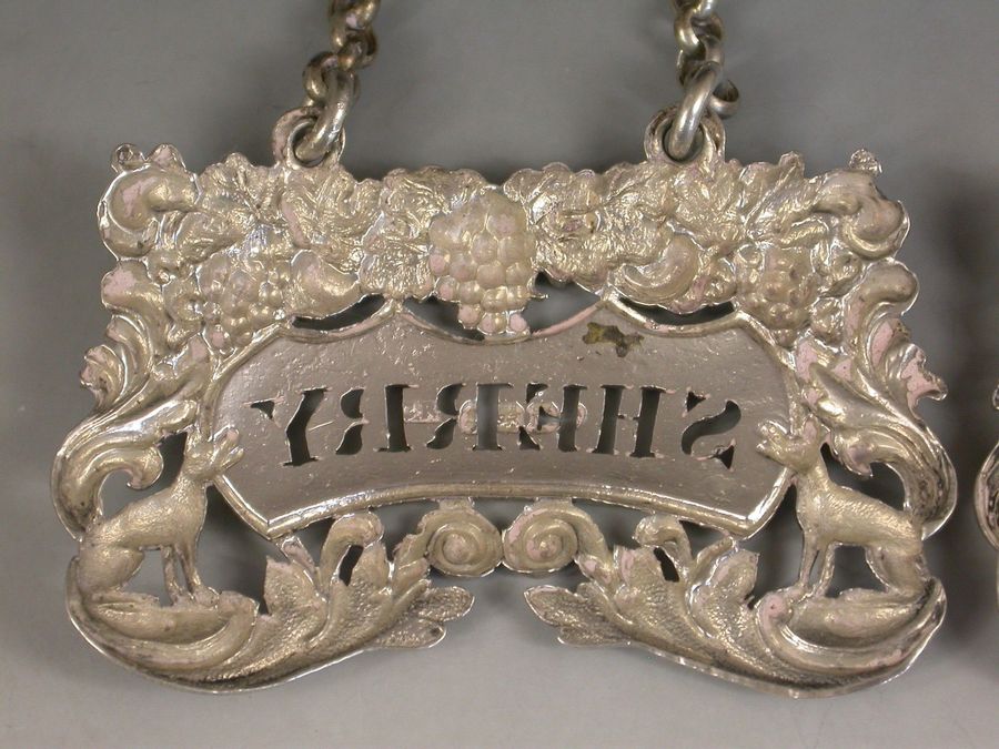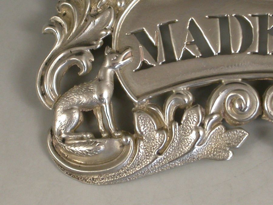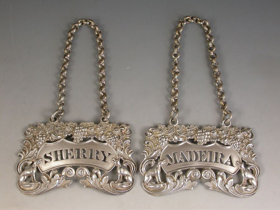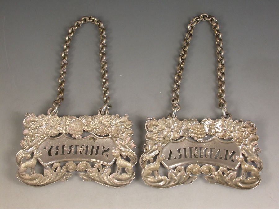 A rare pair George IV die-stamped silver Wine Label of pierced shaped rectangular form decorated with scrolls, vine leaves and grapes and with a seated fox at either end of the shaped name plate pierced for Madeira and Sherry