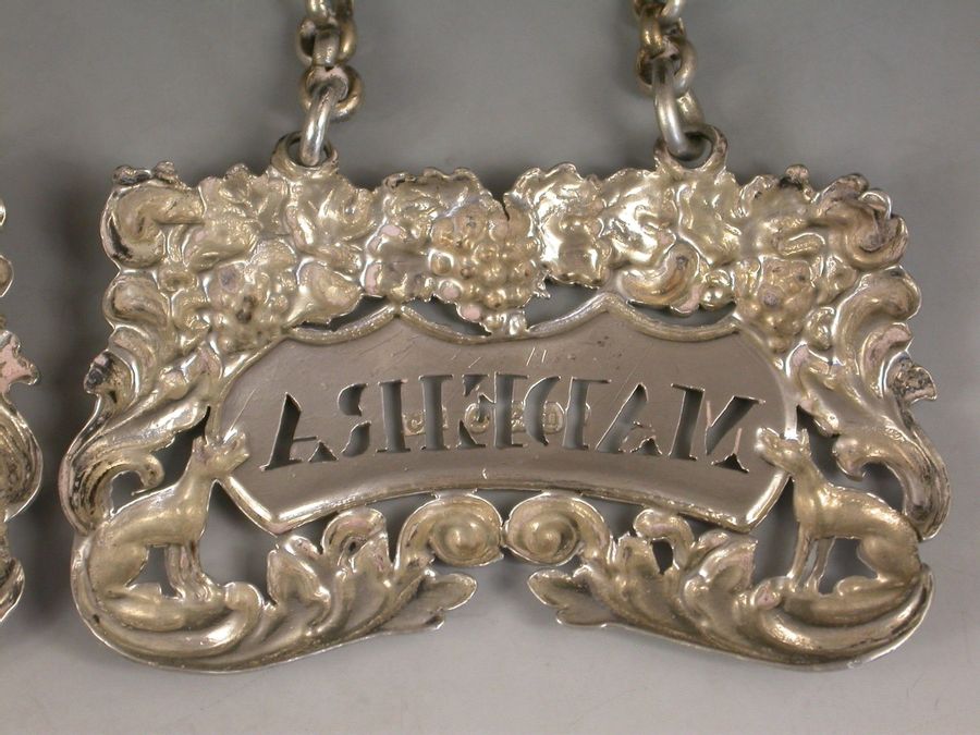 Pair George IV Antique Silver 'Singing Foxes' Wine Labels 'Sherry & Madeira'