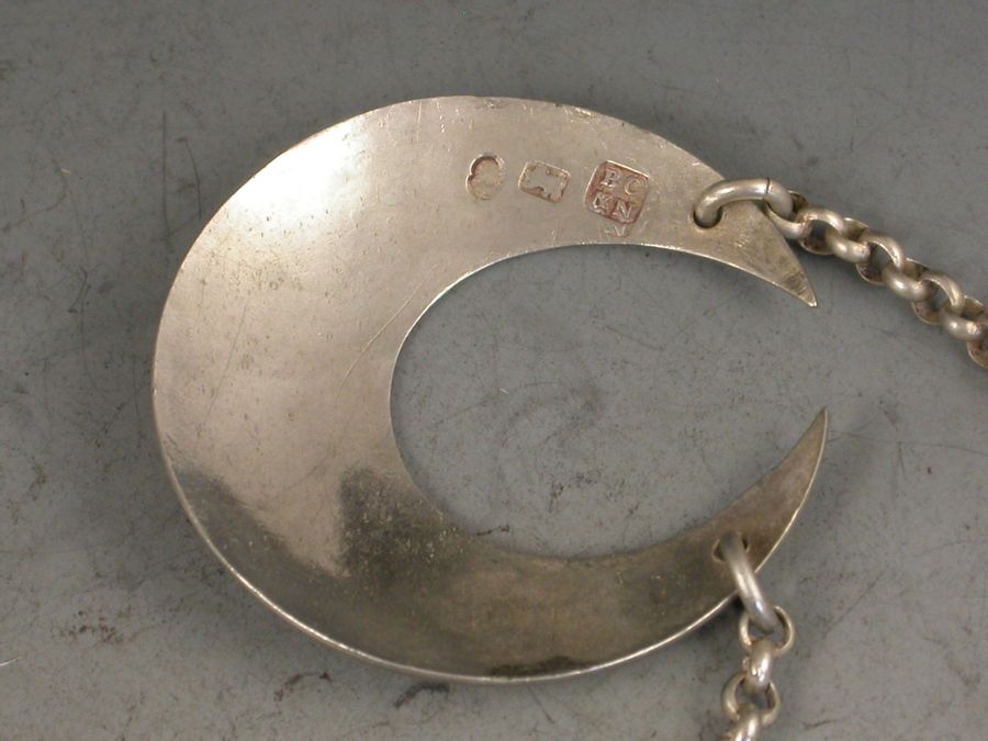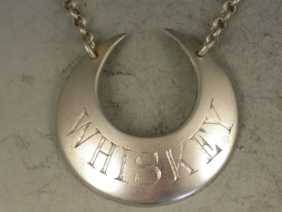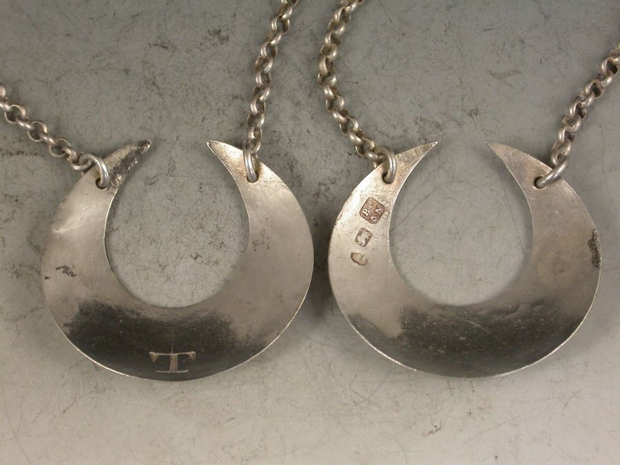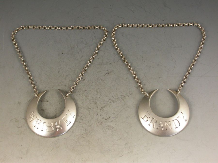 A rare pair of George IV Provincial silver Wine Labels of plain crescent form incised for Whiskey and Brandy.