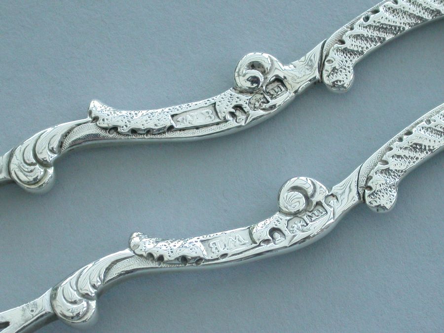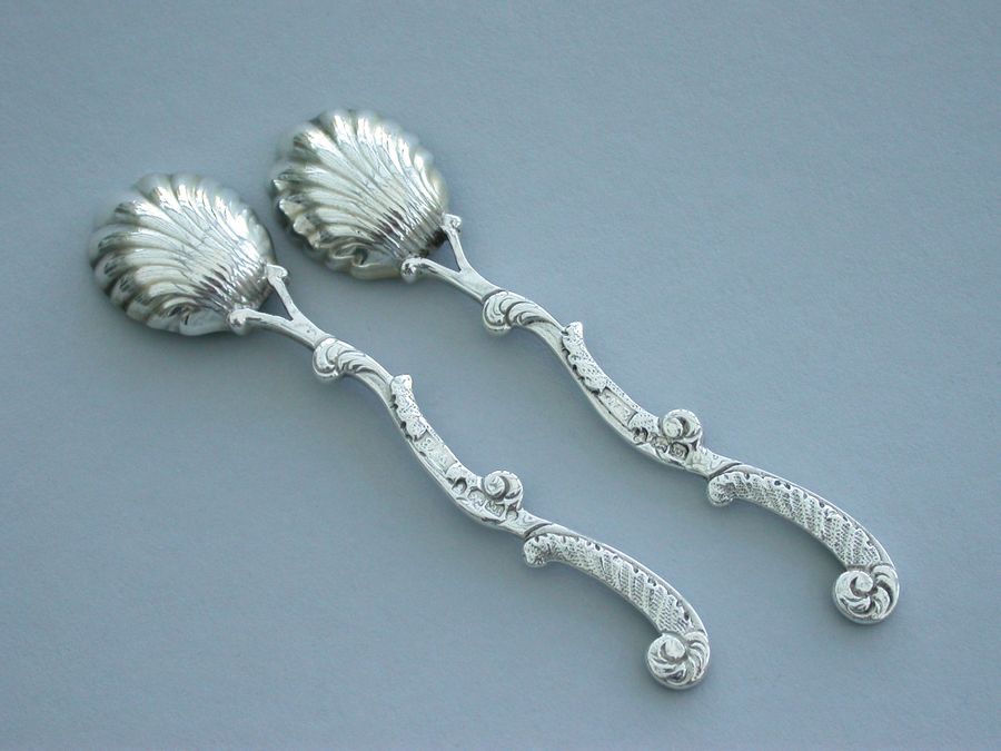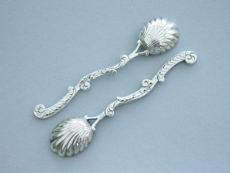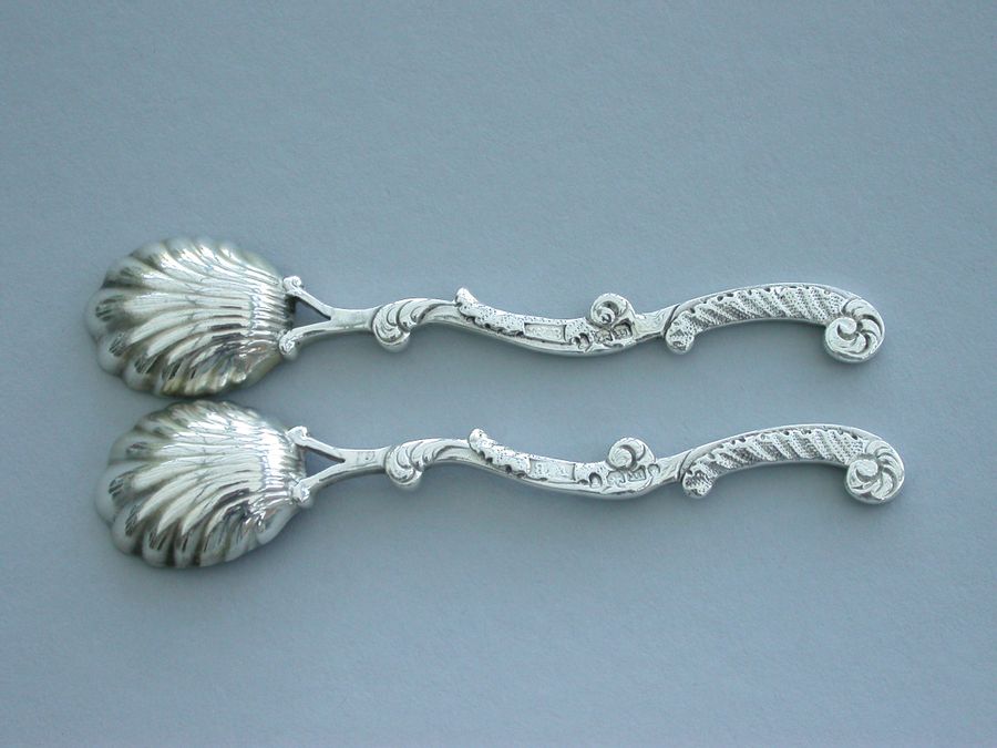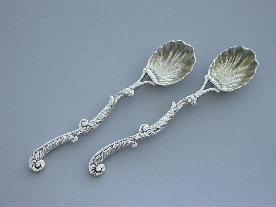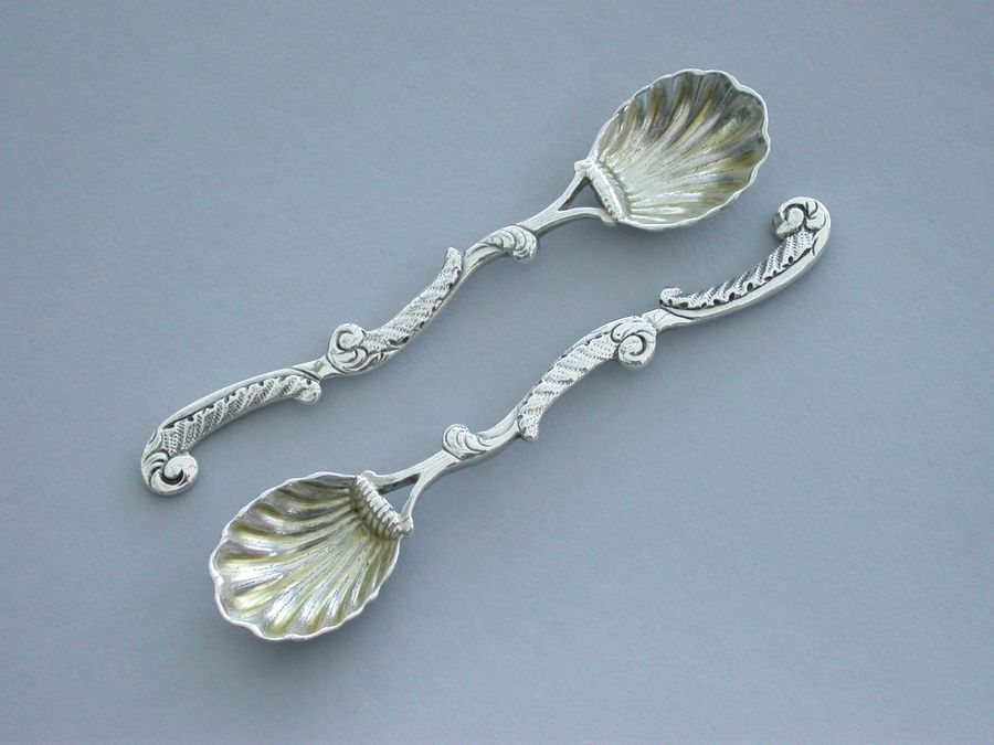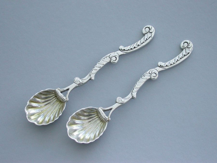A good quality pair of George IV cast silver Salt Spoons made in the Rococo style with scrolled handles and gilded shell bowls.